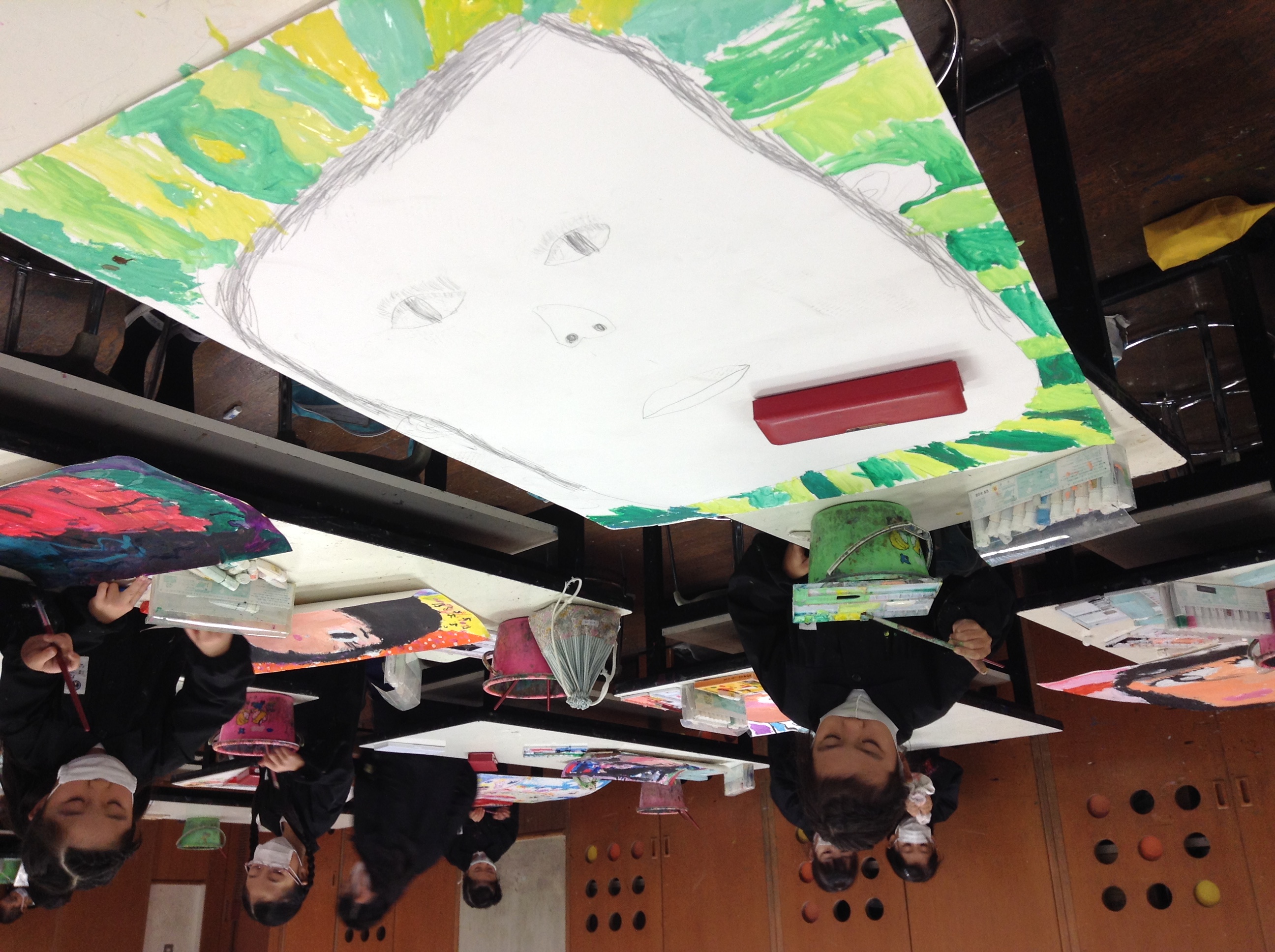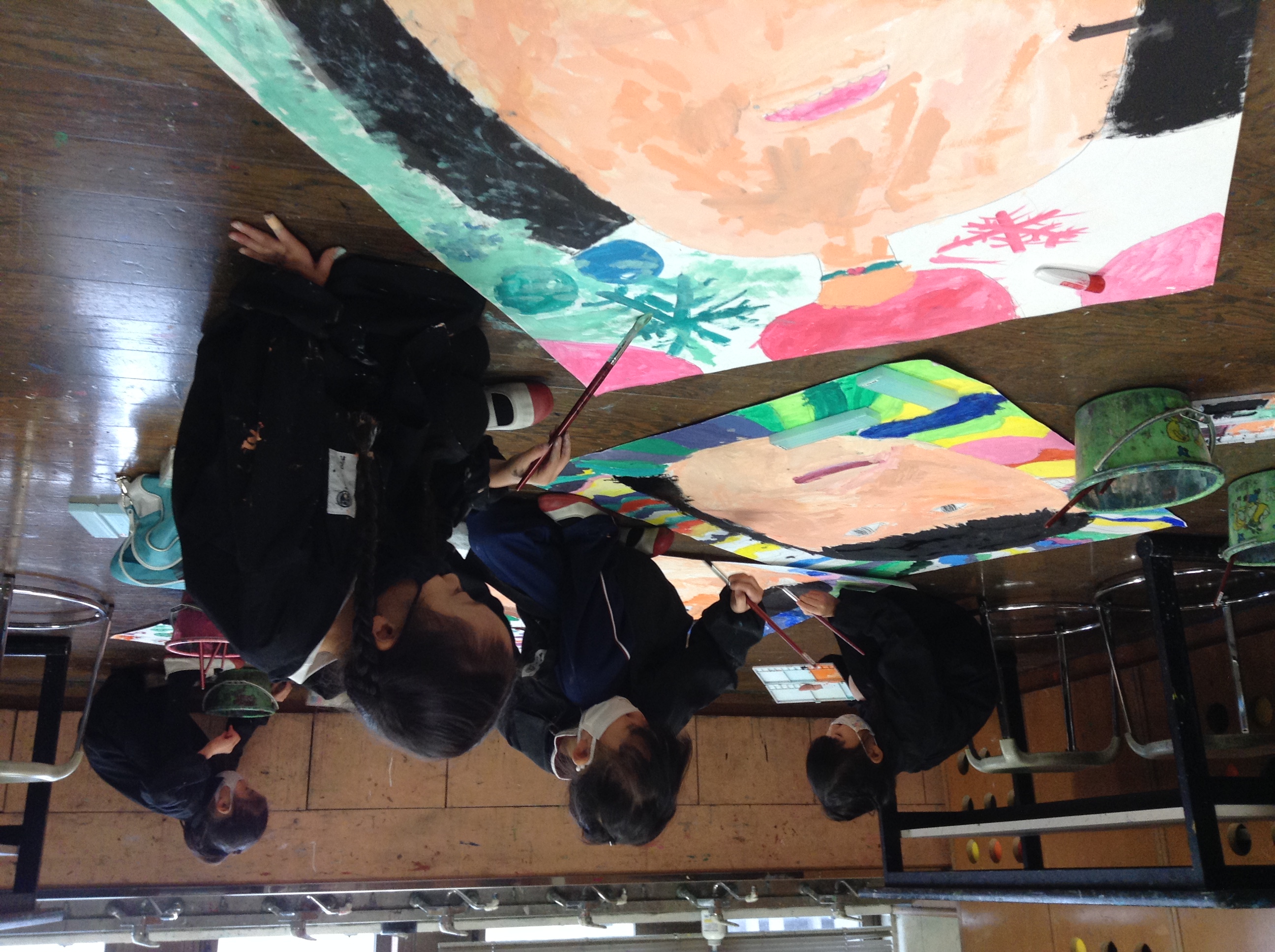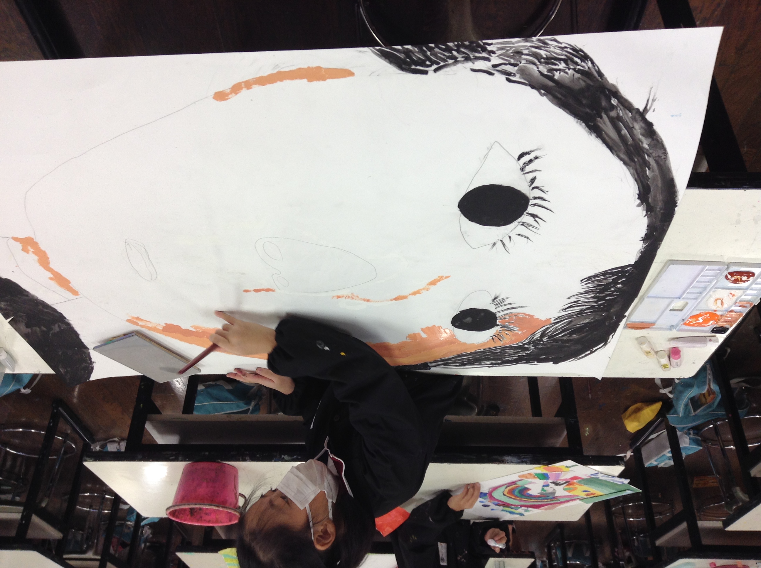 大きな全紙の画用紙に、自分の顔をのびのびと表現しています。