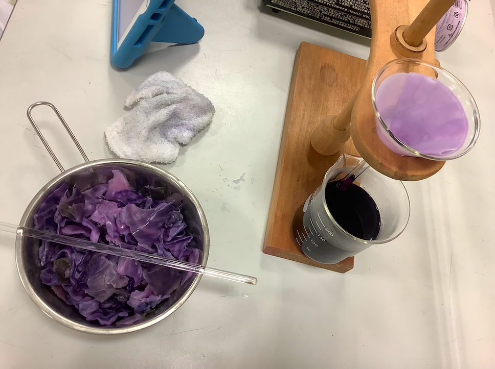 『水溶液の性質』の単元で水溶液の仲間分けについて学習を進めています。今回はムラサキキャベツ液を指示薬として作りました。子どもたちは熱心に取り組んでくれていました。
