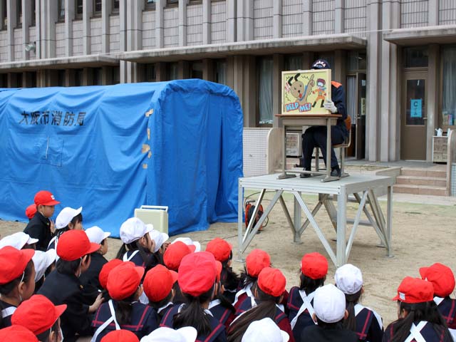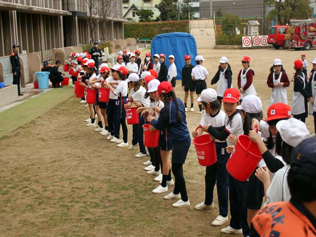 4年生では、バケツリレー、消火器の使い方などを教わりました。