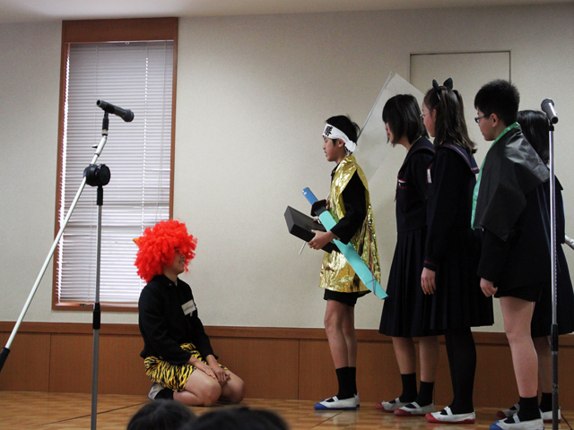 6年生の英語では、3学期から「ももたろう」と「おむすびころりん」の英語劇の練習をしてきました。