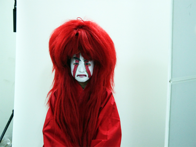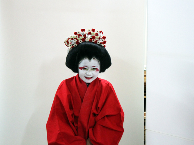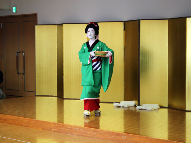 1回目の授業では、歌舞伎役者の方に来ていただき、歌舞伎のお化粧、女形(近江のお兼)と立役(獅子)の化粧行程と舞を見せてもらいました。