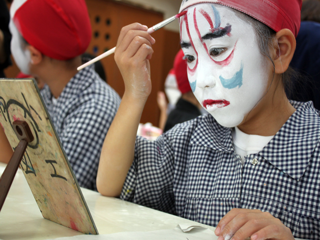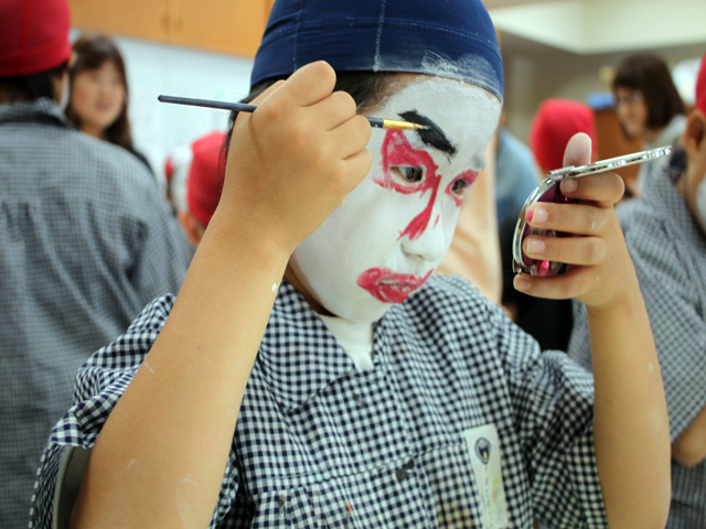 真っ黒のお化粧をする児童や、見栄をきって写真を撮る児童など、楽しんで体験をしました。