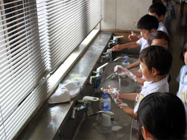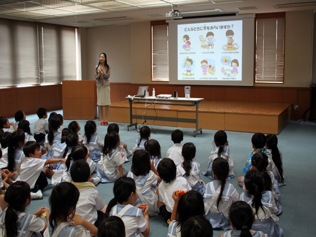 手を洗う方法、手洗いの大切さをしっかり学ぶことができました。