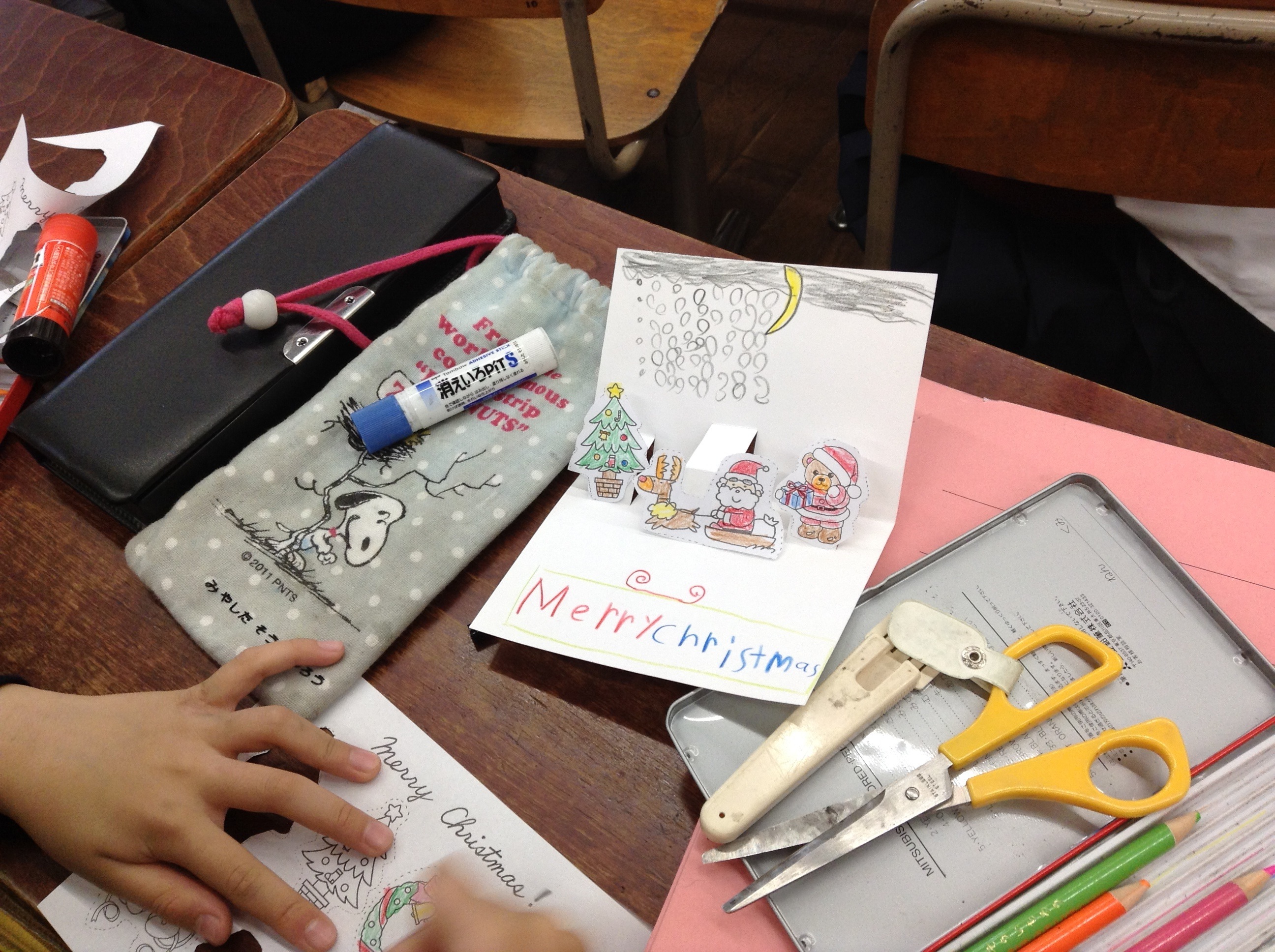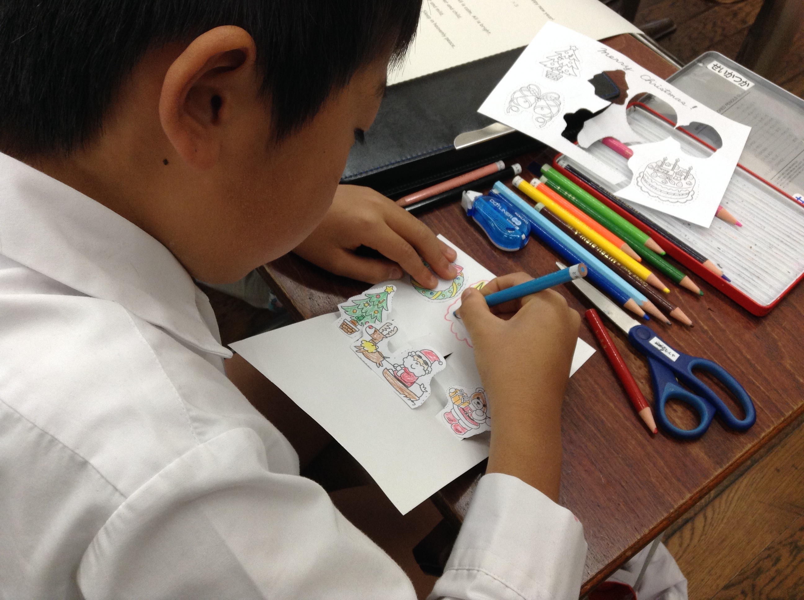 もうすぐクリスマスです。今年も1〜4年生の英会話では、2学期最後の授業でクリスマスカード作りをしました。英語での説明をよく聞いて、どの児童も作る表情は真剣です。色を塗りながら、サンタさんにあげるか、家族にあげるか悩む姿がとてもかわいいです。すてきなクリスマスになりますように!Merry Christmas!