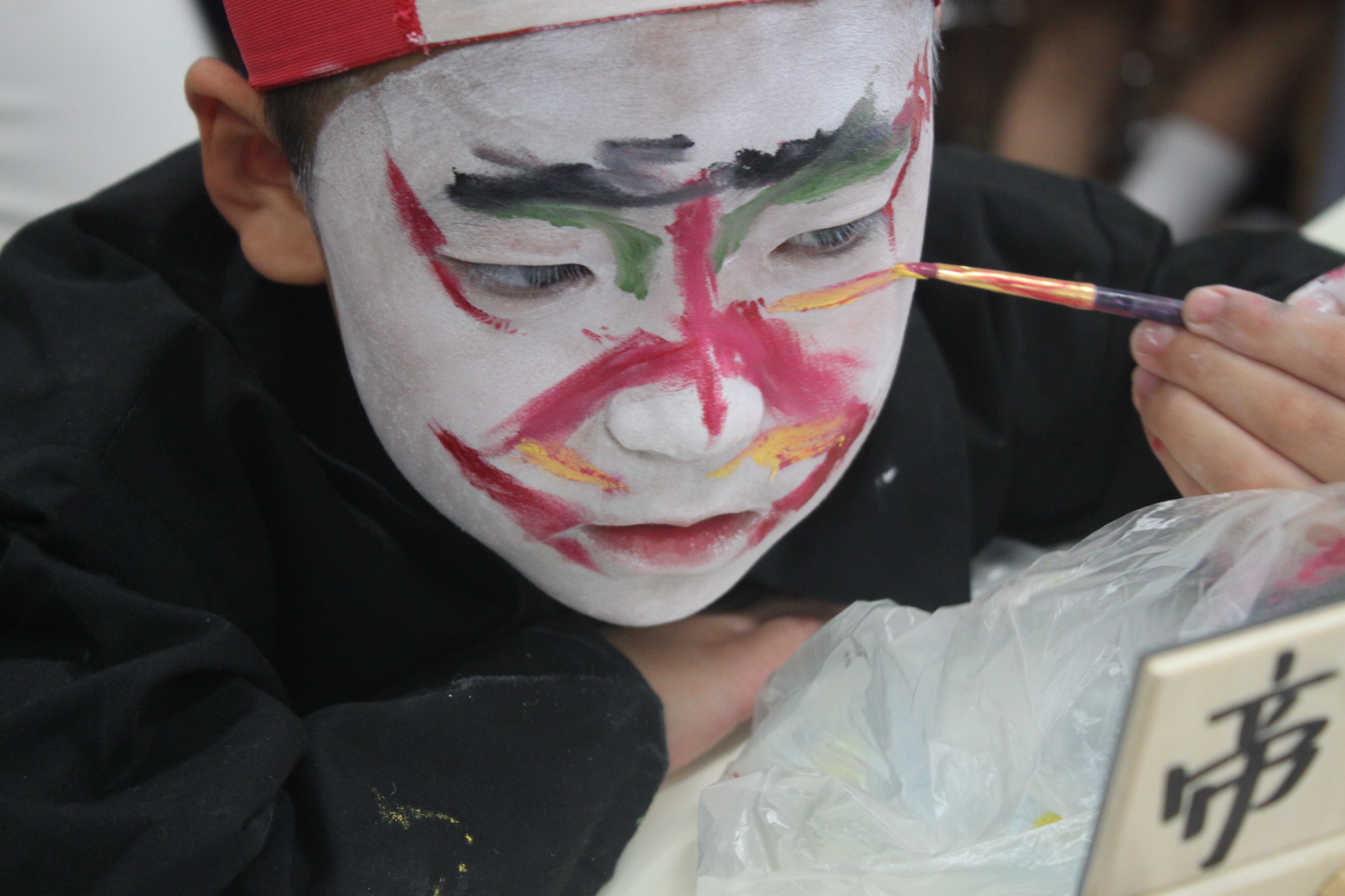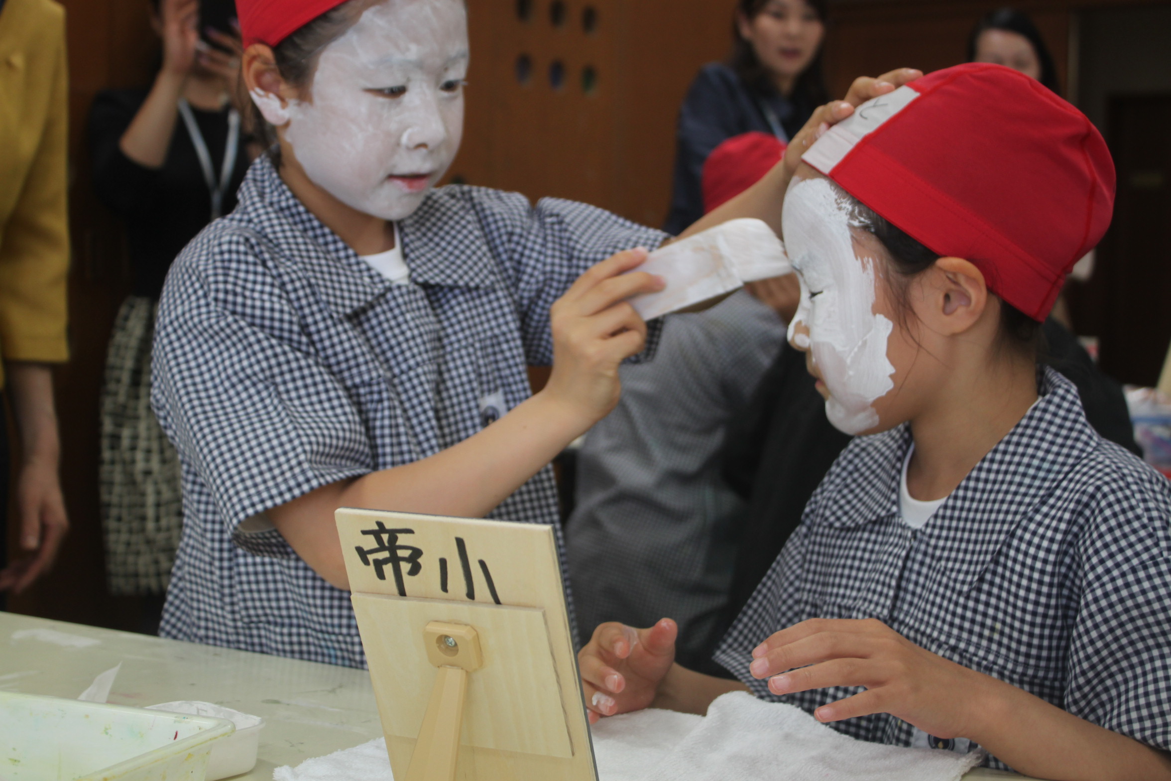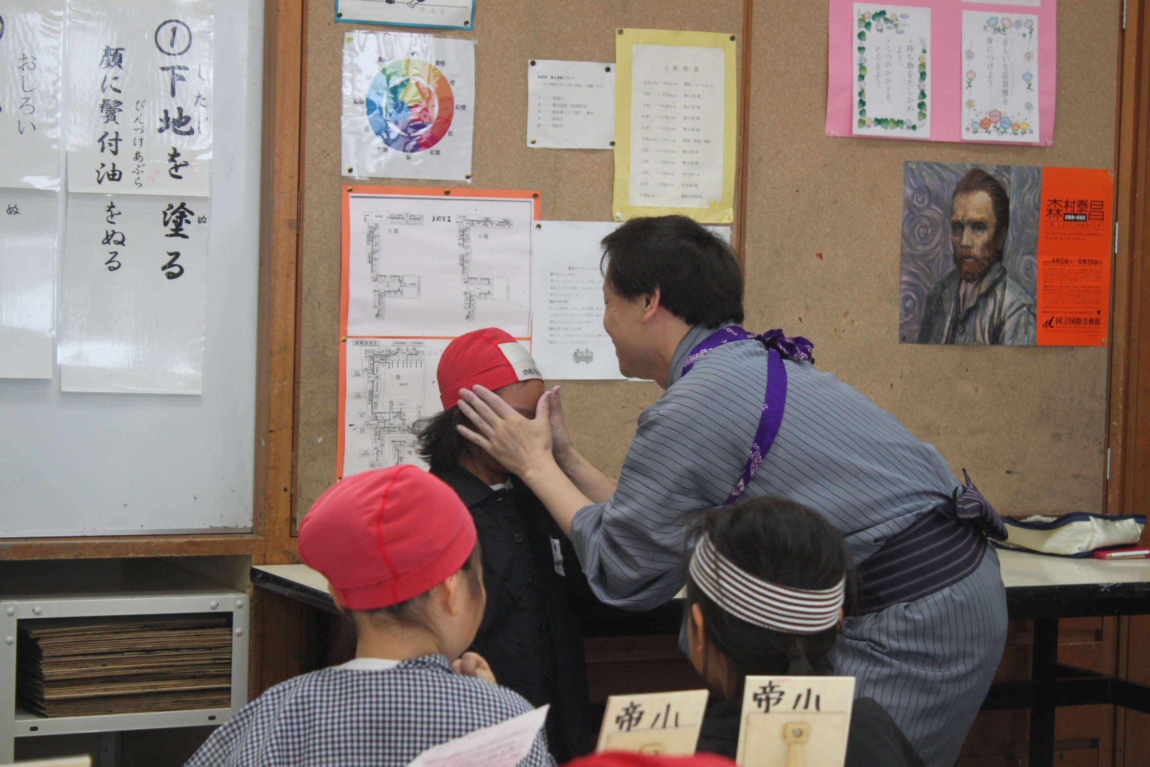 後日、児童たちは自分の顔にオリジナルの隈取をとりました。