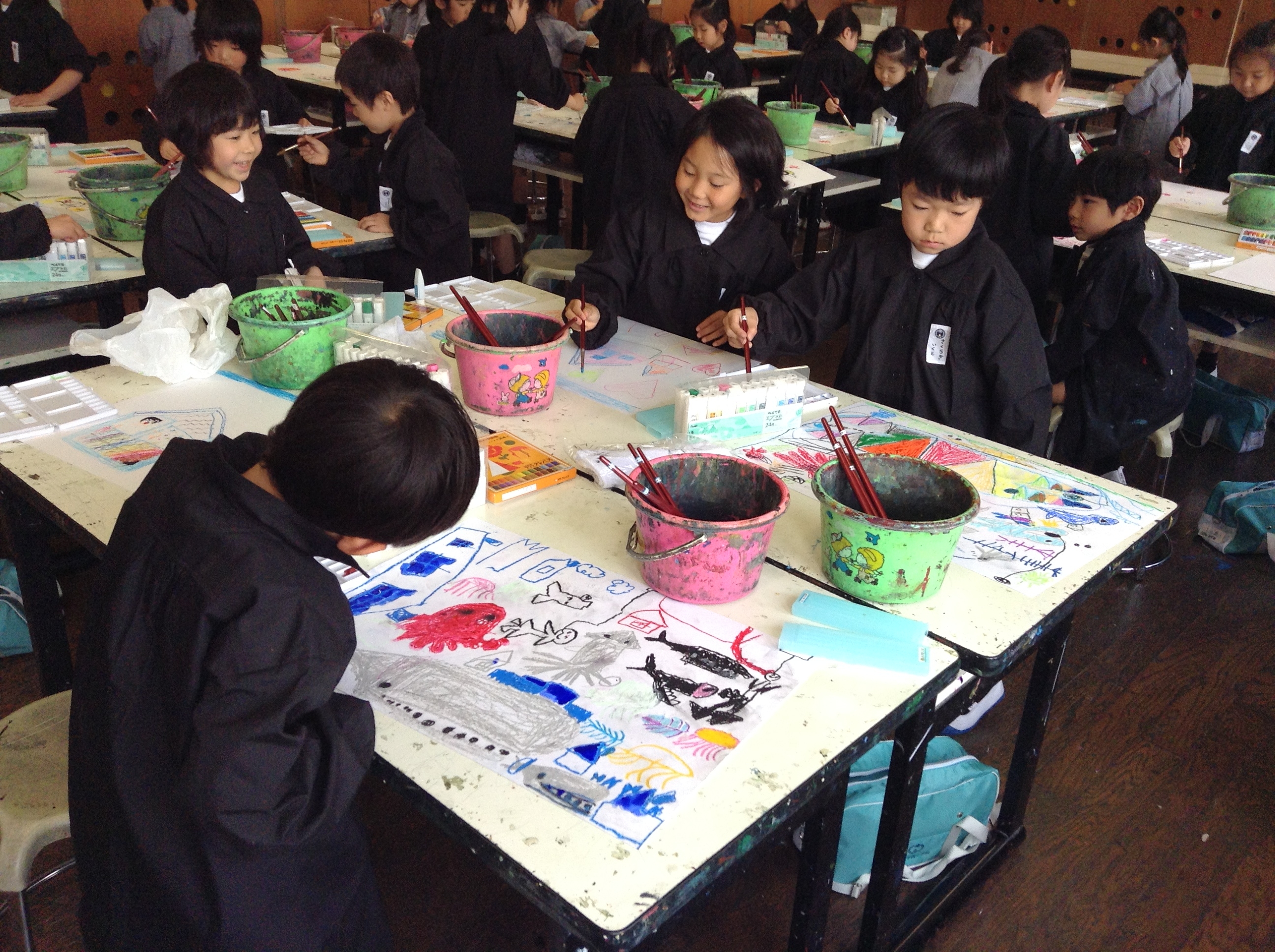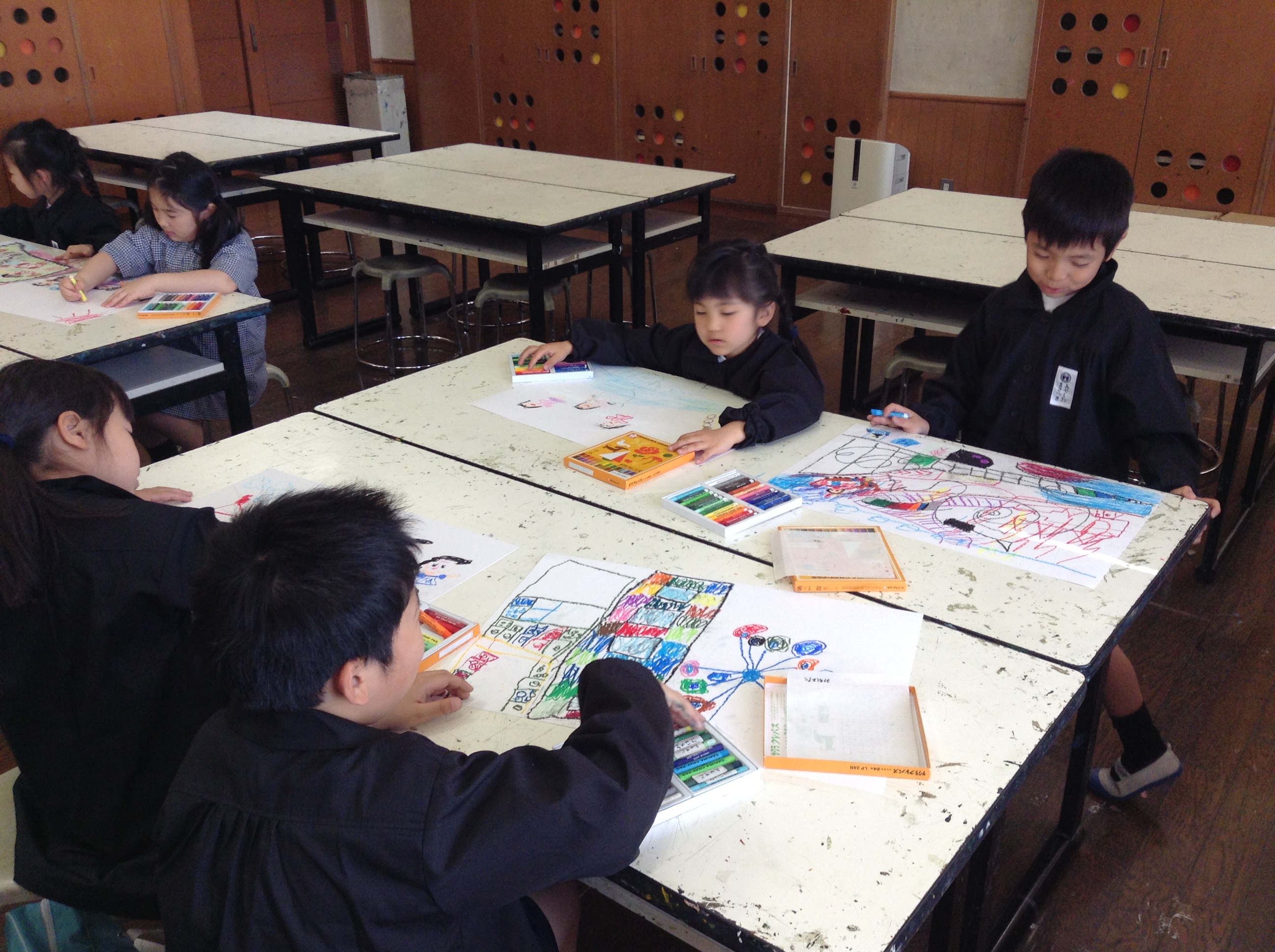 1年の図工の授業では、「できたらいいな こんなこと」という題で絵を描いています。