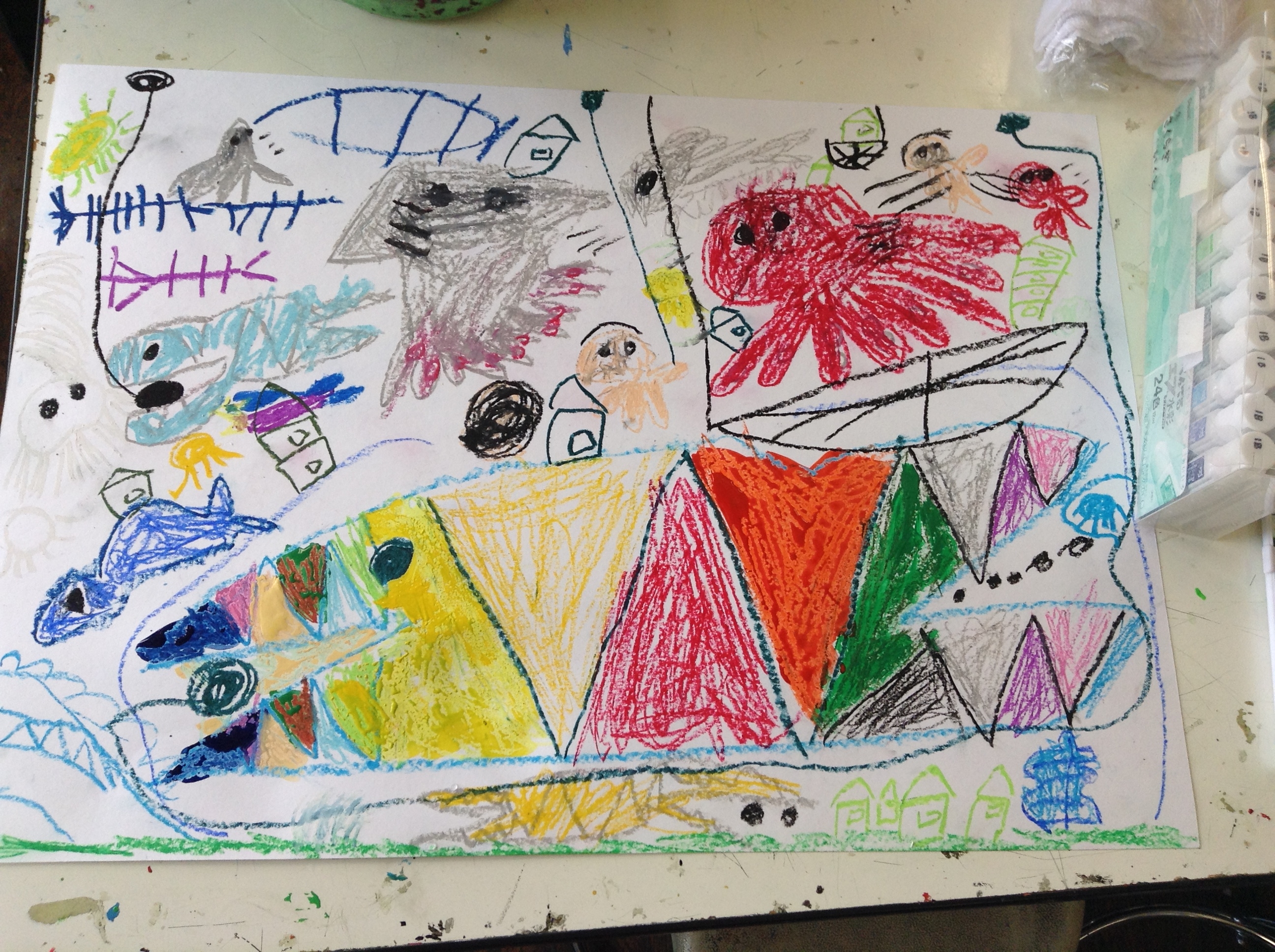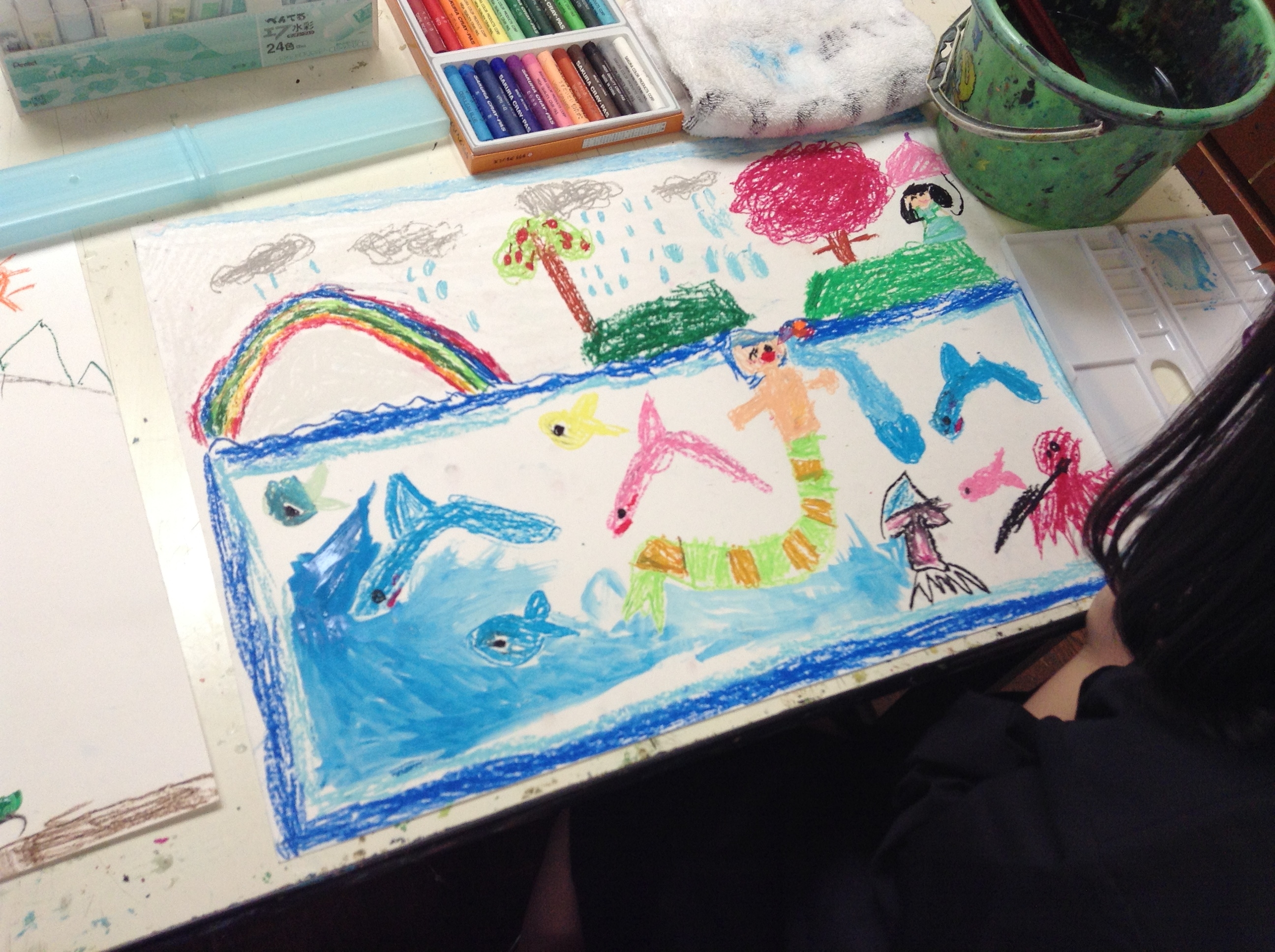 クレパスを使って絵を描いた後に、水彩絵の具で色をつけています。