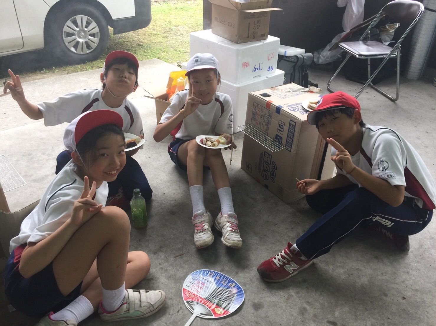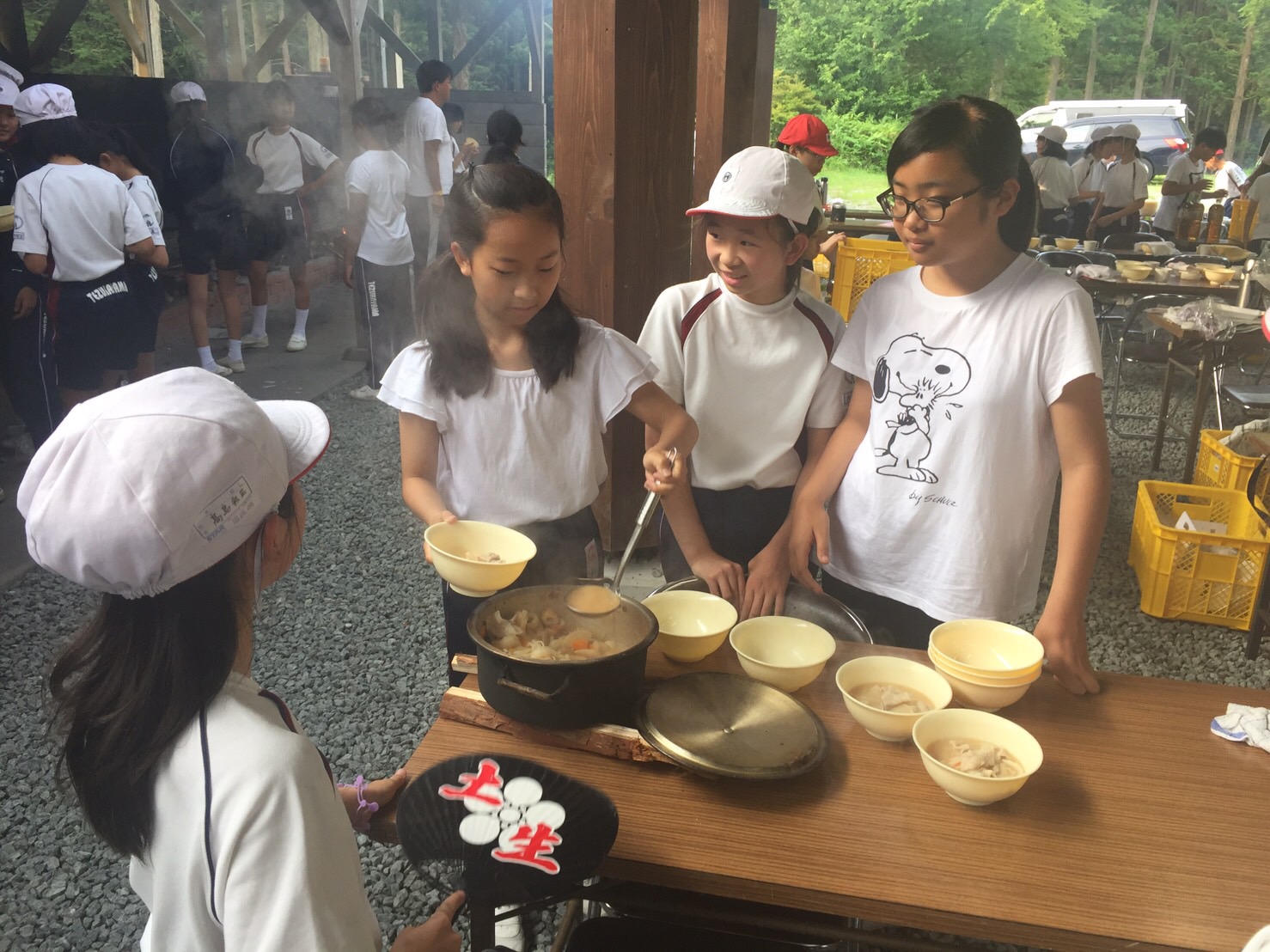 キャンプ2日目です。 児童たちは、自分達で朝食、夕食を作ります。 火おこしから始め、少しづつ食事作りにも慣れてきました。 朝食は豚汁を作り、夕食は焼きそばを作りました。 みんなで作った食事は、美味しかったです。 キャンプを通して、自然の中での火の大切さを学びました。 今日は、グループに別れてアクティヴィティーを行いました。 燻製を作ったり、川遊びやスイカ割り、流しそうめんなど各グループ楽しく活動しました。