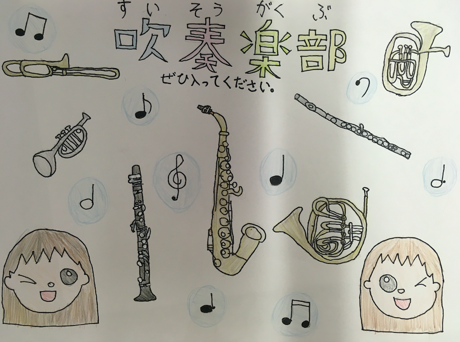 仲間をもっと増やしたい、大人数で50周年を迎えたいとの思いから、4年生の児童の一人が吹奏楽部のポスターを作成してくれました!