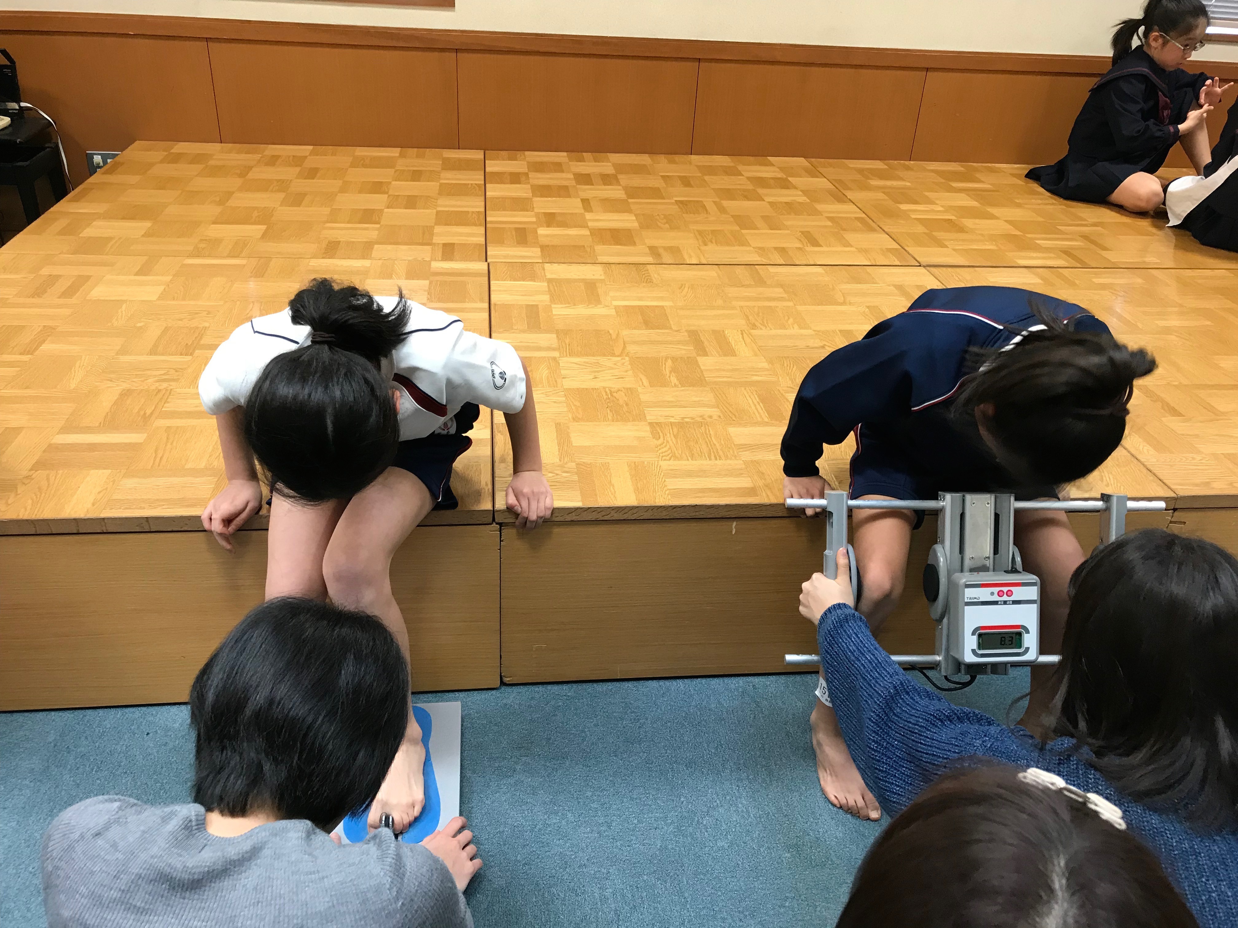 本校では大阪大学山下先生ご協力のもと足裏測定を実施しています。足指や膝の力を測定したり、骨の状態をチェックしたりすることで、足の健康の保持増進に努めています。
