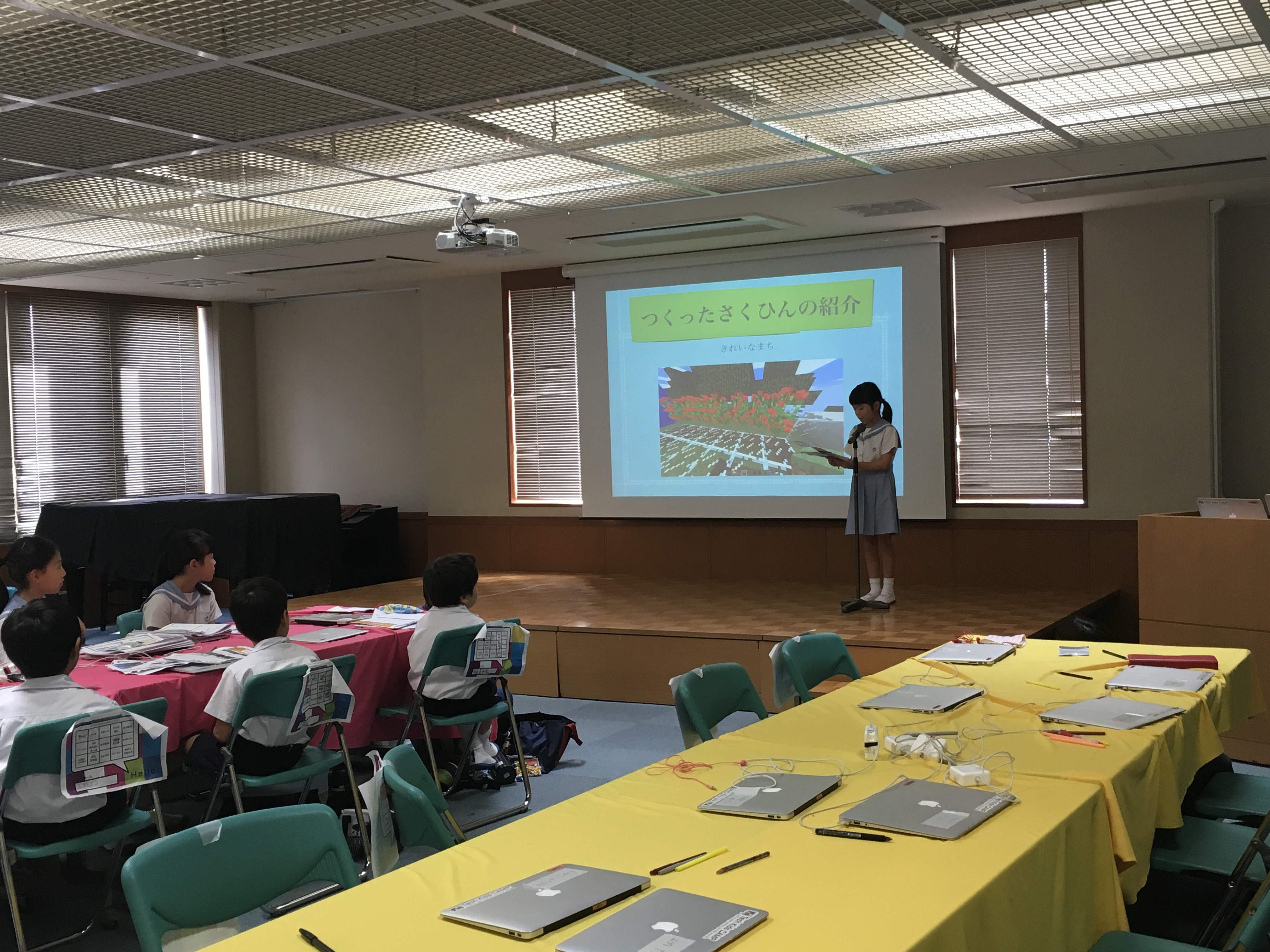 最終日には保護者の方にお越しいただき、開発した作品について一人ずつプレゼンテーションを行いました。3日間のキャンプを通して15時間もの学習時間でしたが、休憩になっても夢中で開発を続ける児童も見られ、有意義な学びの時となったようです。
