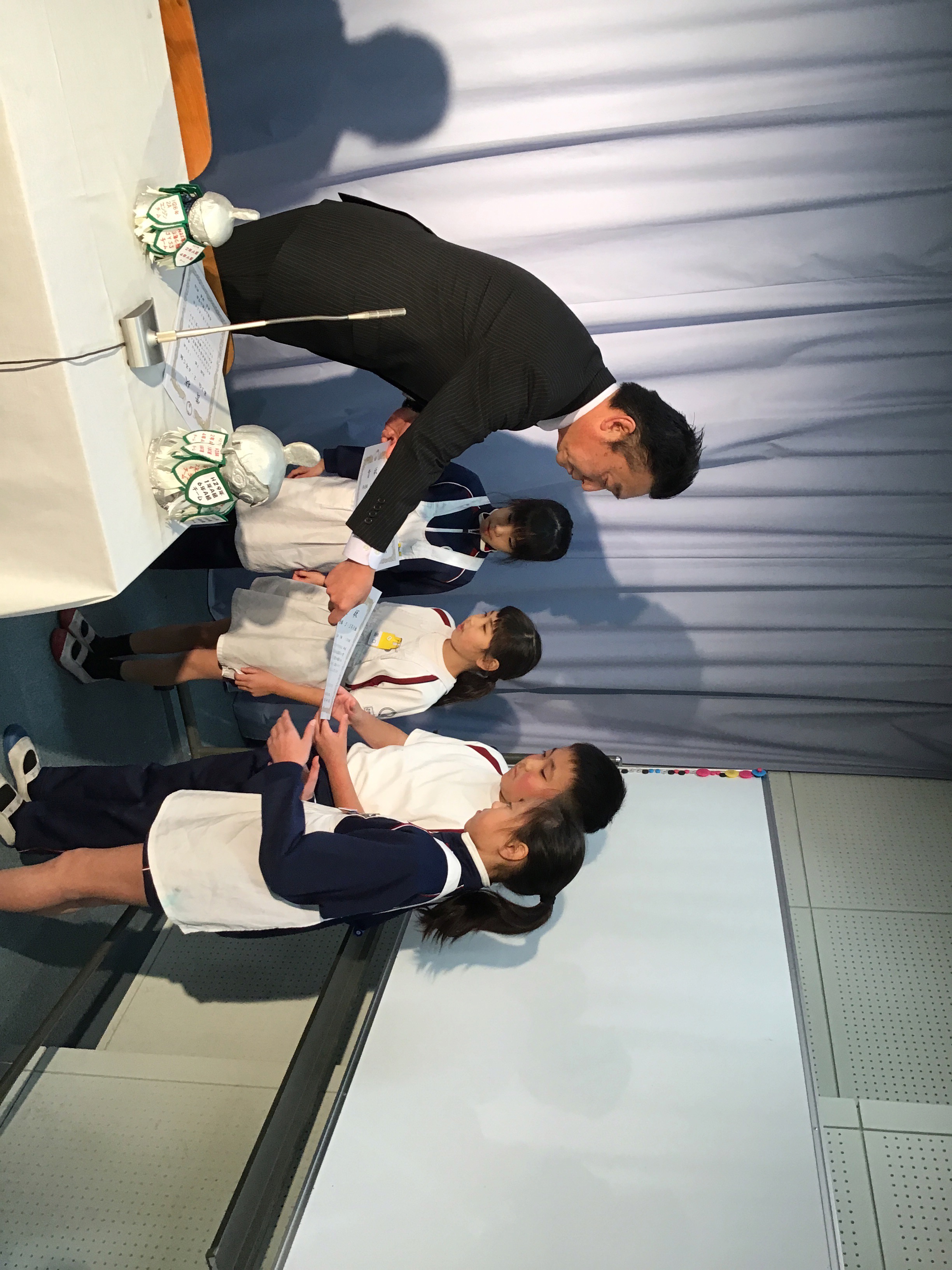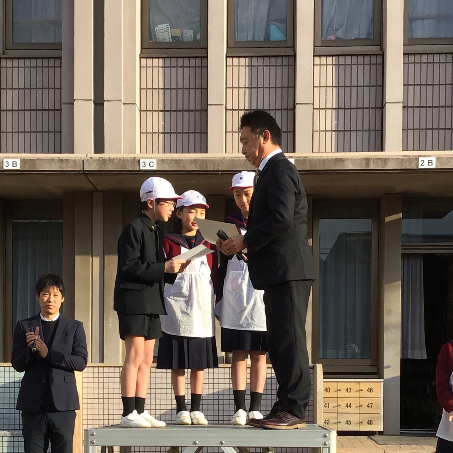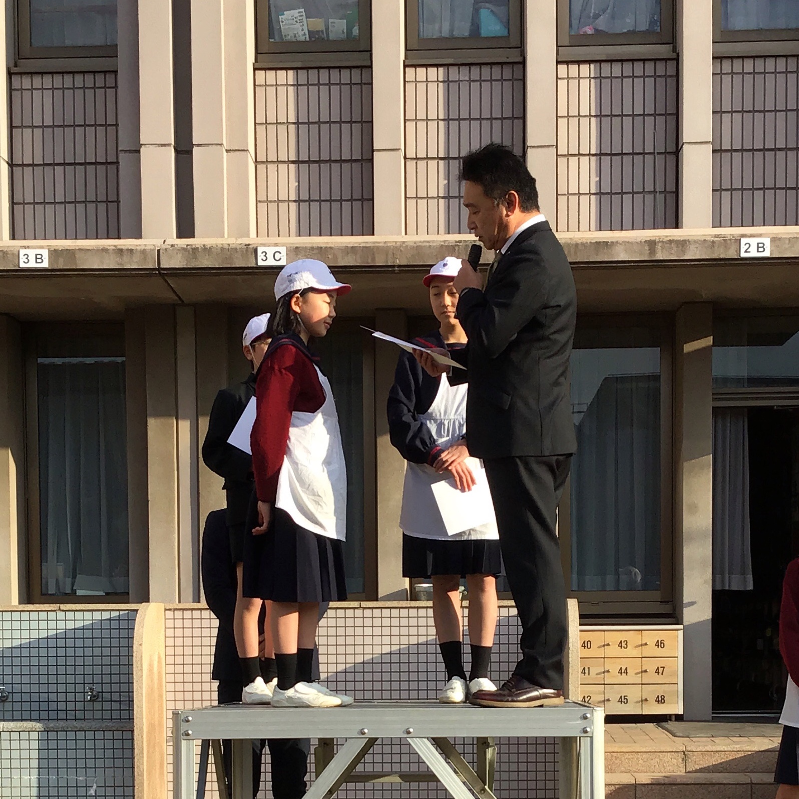 冷たさも感じつつ青空が見られた本日、全校朝礼が行われました。また同時に、昨日の児童会役員選挙で選ばれた3名の児童の認証式も執り行いました。この3名は前期児童会役員として来年度にかけて活動していきます。