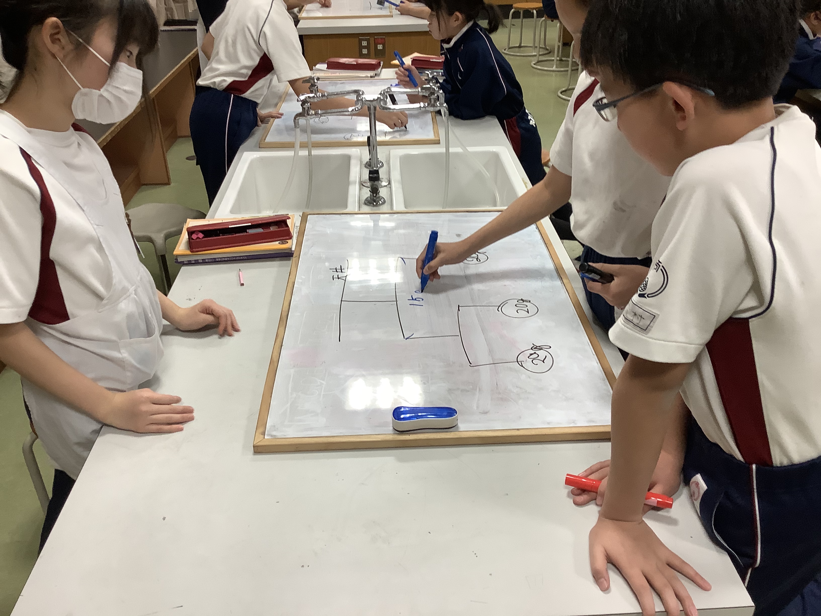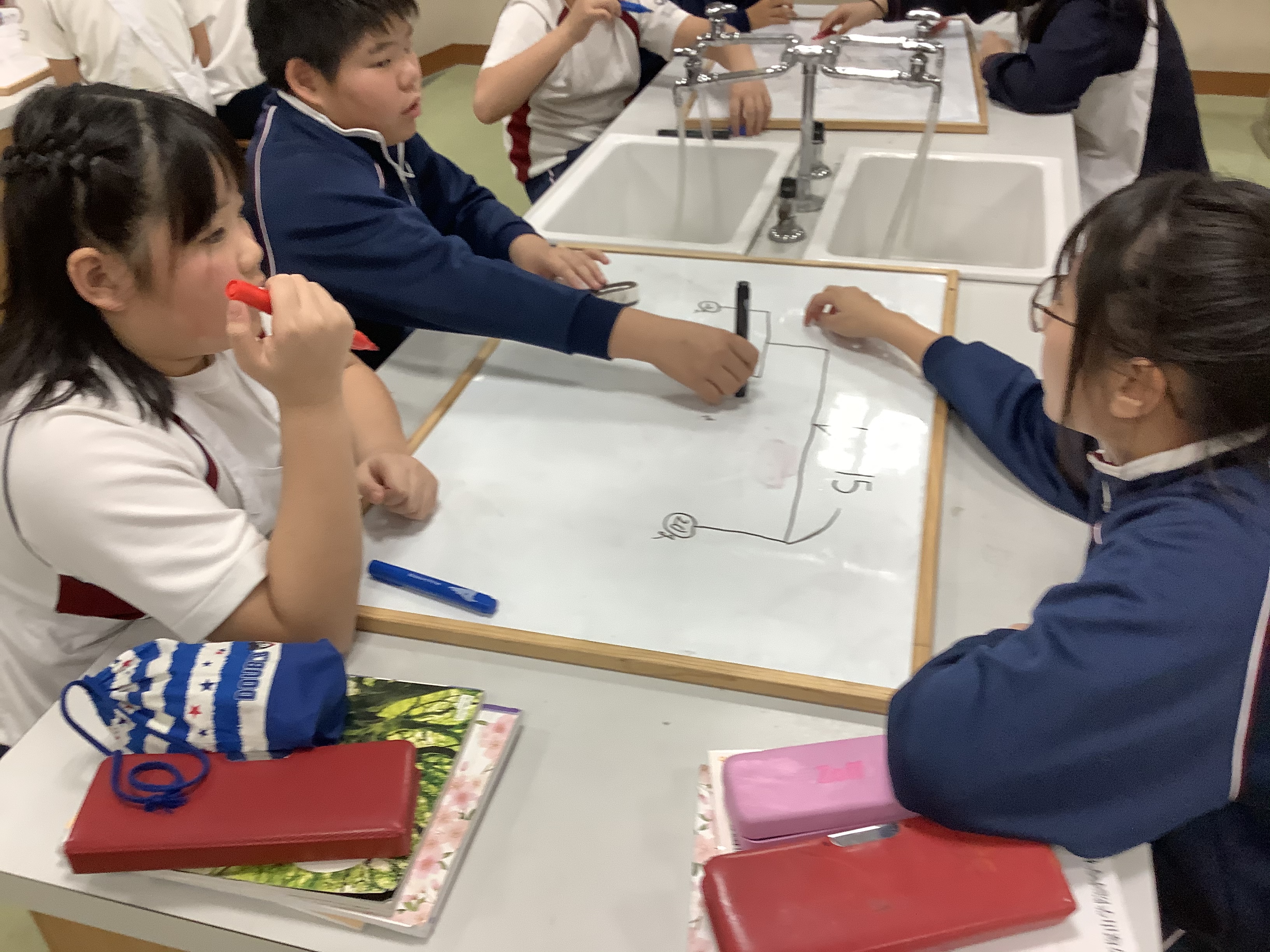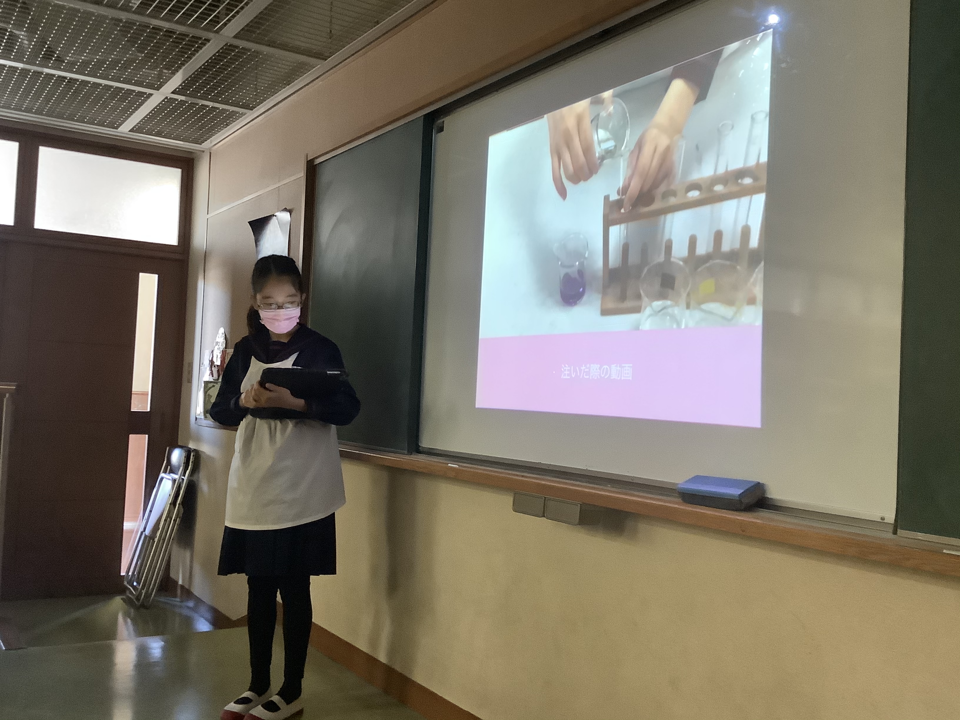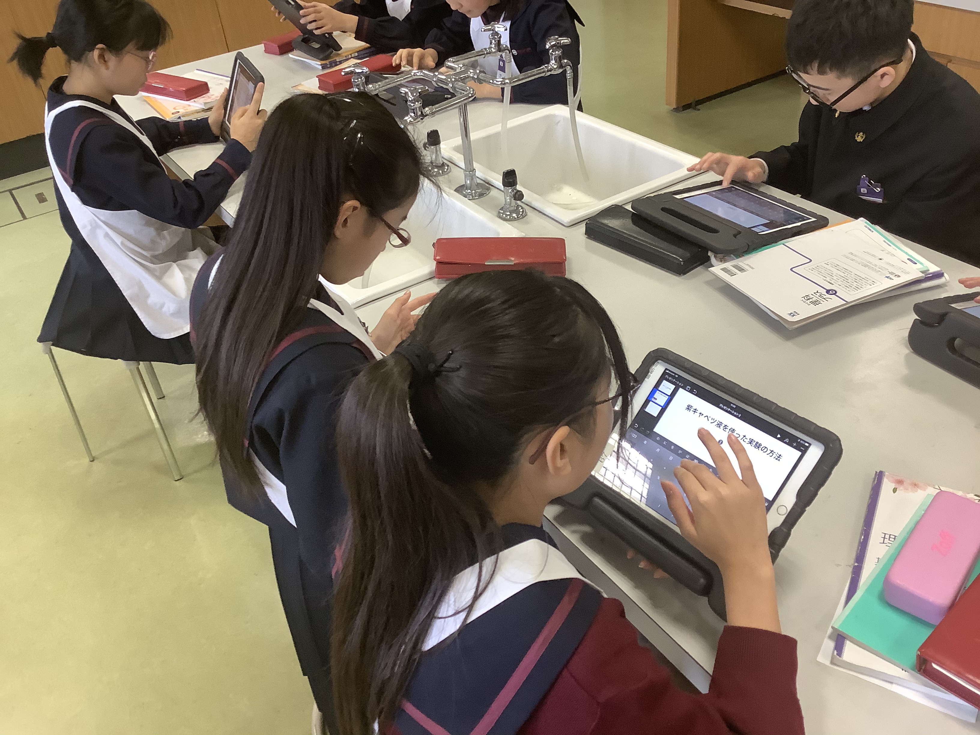 ムラサキキャベツにはアントシアニンが含まれているので、酸性・アルカリ性の性質に合わせて色が変化します。子どもたちは同じ酸性のものでも水溶液の種類によって色がちがうことから、新たな発見をしていました。また、結果・考察をiPadでまとめて、上手に発表をしてくれていました。