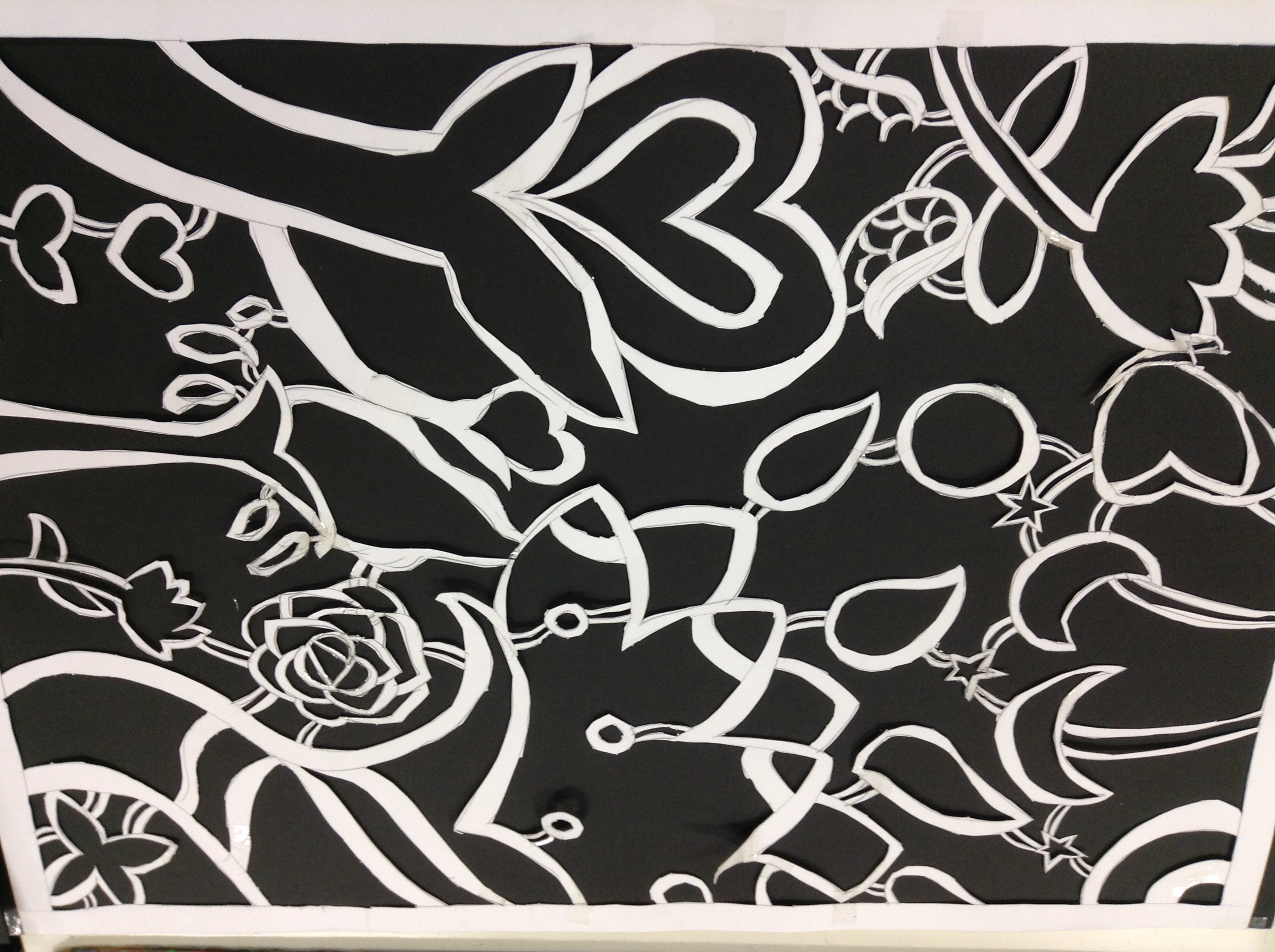 型紙が完成後、黒画用紙に貼り付け、ステンシル用のブラシを使い、アクリル絵の具で