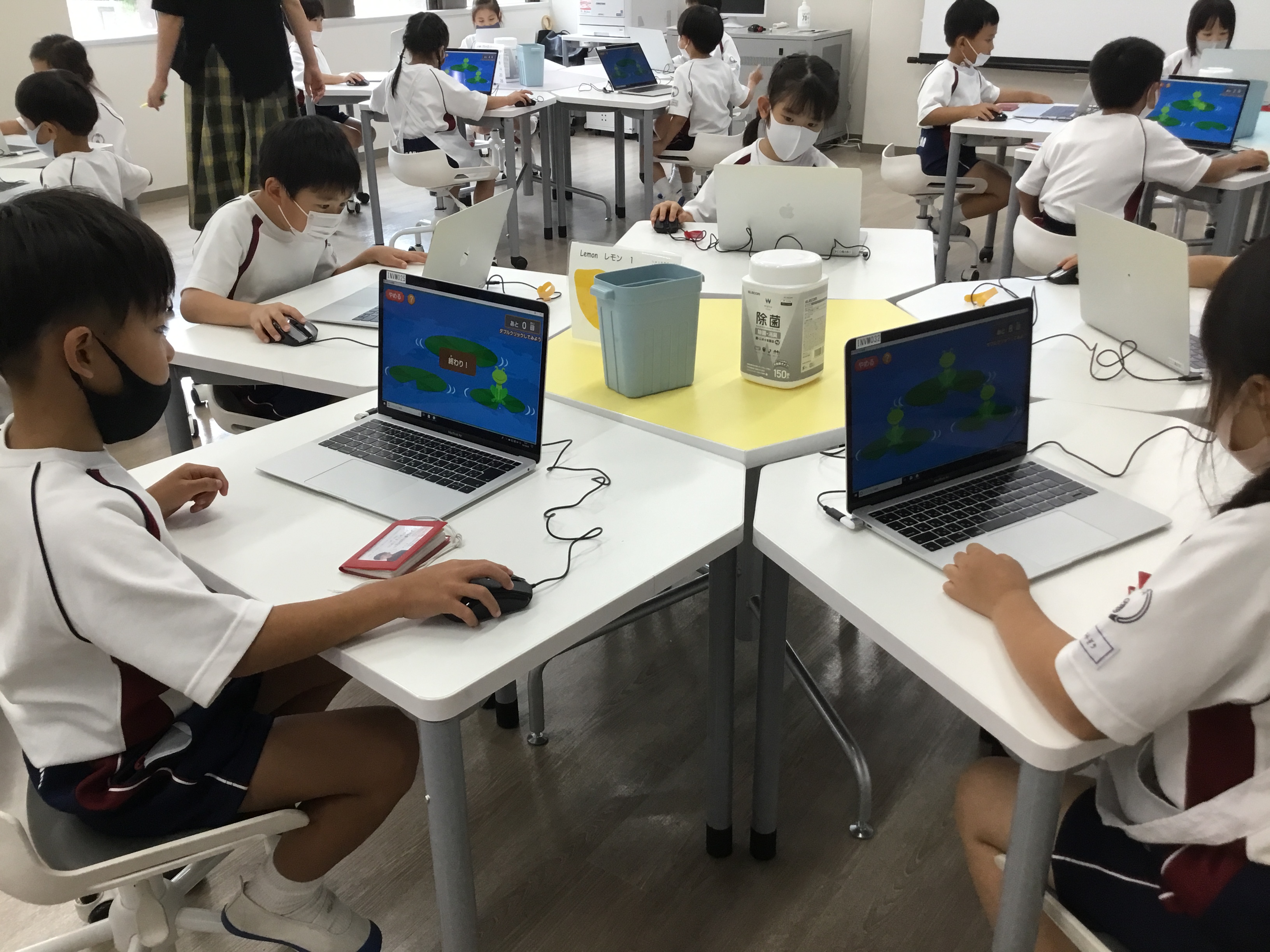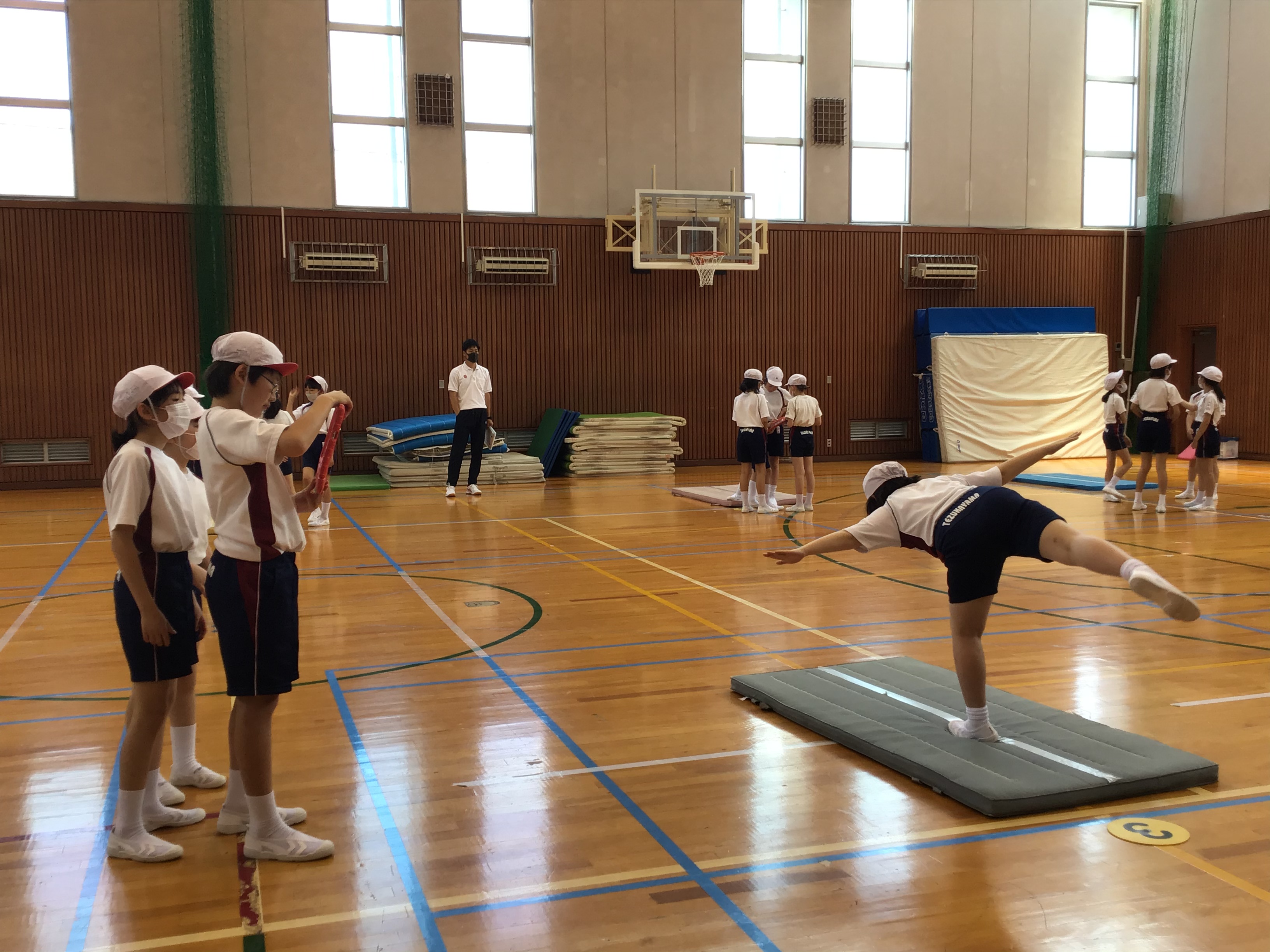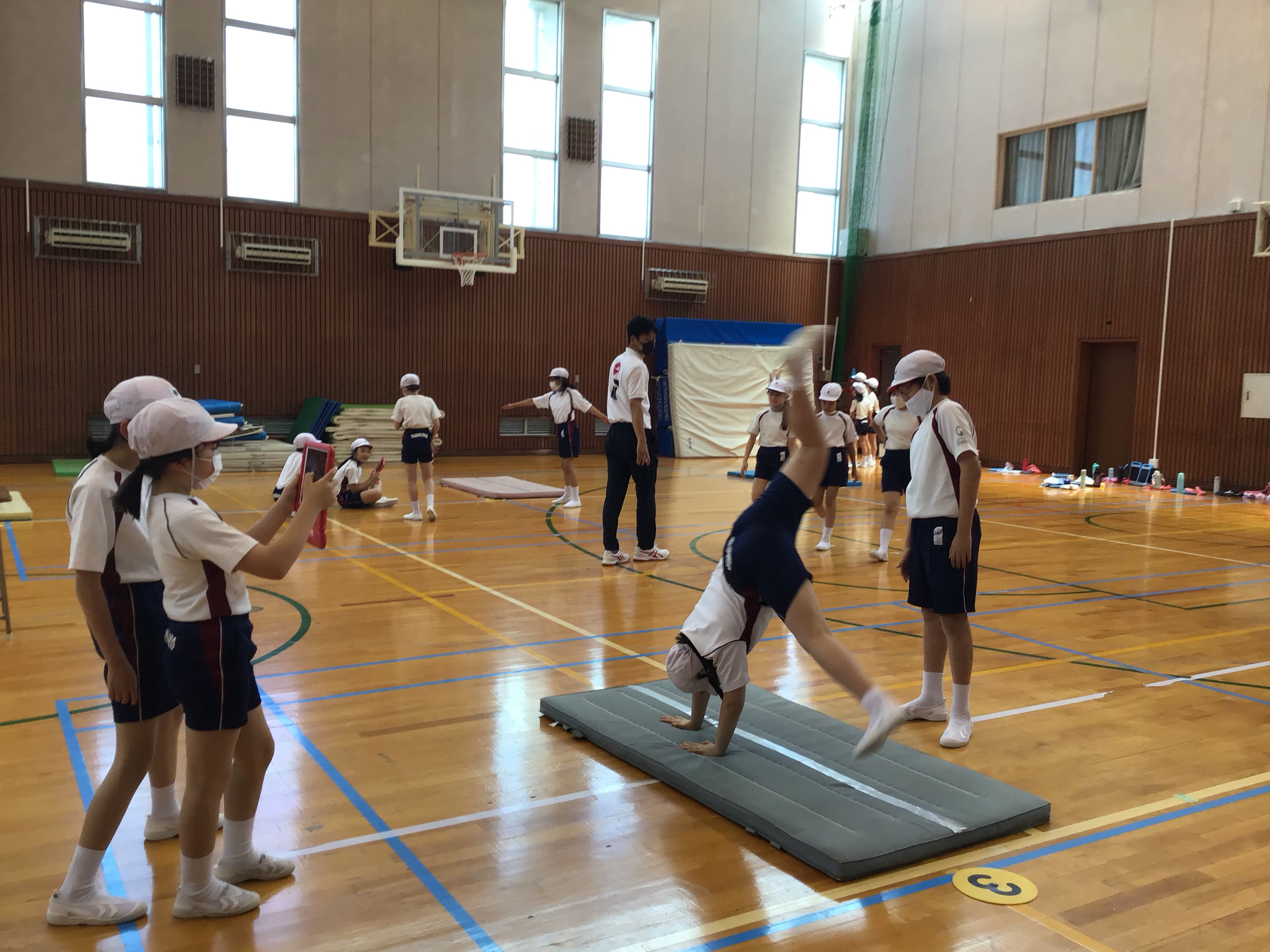 5年生の体育で器械運動「マット運動」をしました。4人一組となり、お互いの技を見合い、教え合ったり、伝え合ったり、動画を撮影し合ったりする授業でした。例えば、水平バランスなども自分では、地面に水平に腕をあげているつもりでも実際にはそうでないことがよくあります。自分の中で、どの感覚で出力すればまっすぐなのかを確認し、一つひとつの感覚のズレを認知し、修正していきます。そうして、自分の体を思った通りに動かせるようになっていきます。また、他者にアドバイスすることは、自分が実際に技をするときにそのポイントを意識するようになるため、自分にもポイントをフィードバックしていくことになります。グループ内で活発にアドバイスし合い、協働的に授業が進んでいきました。