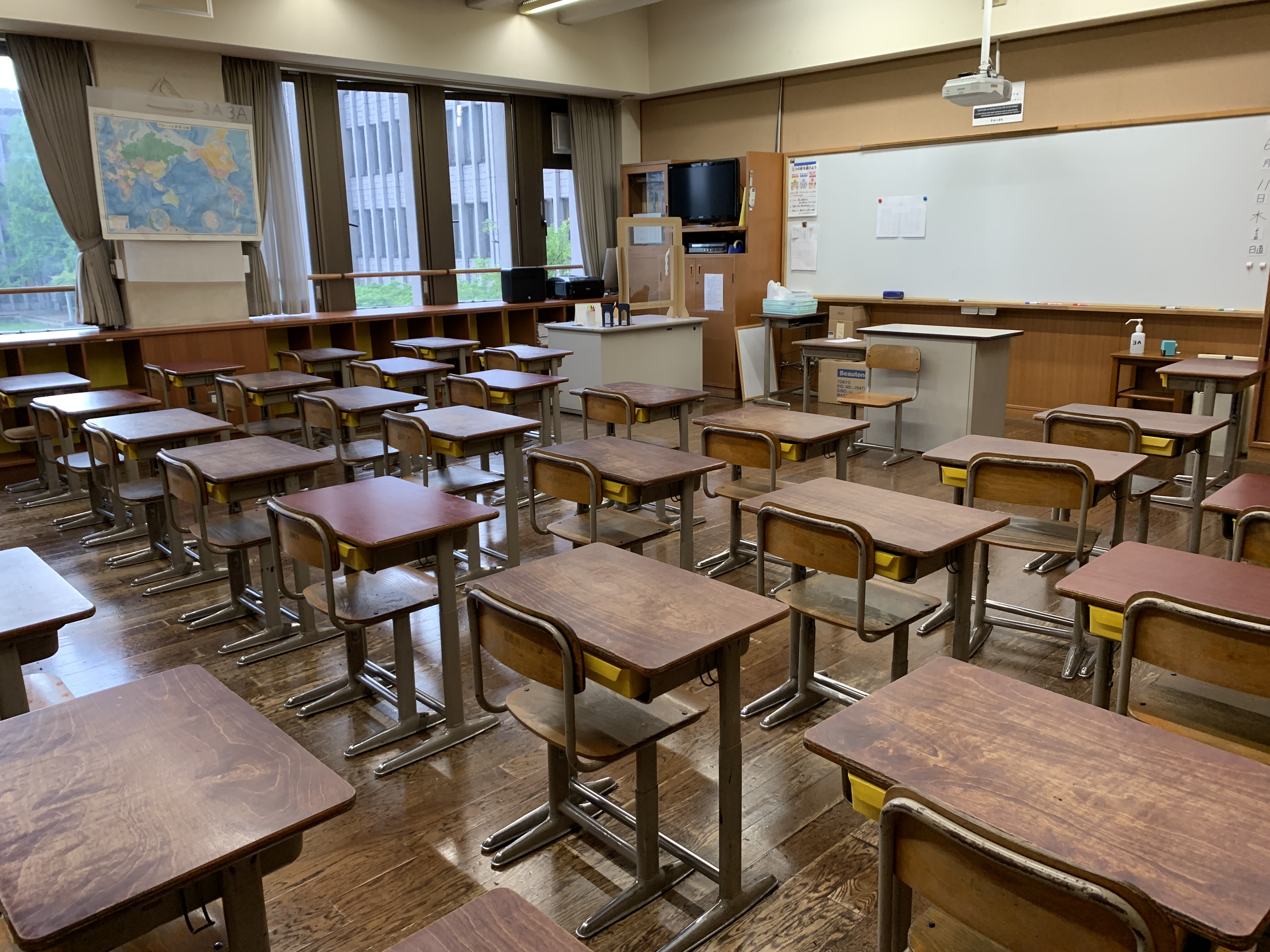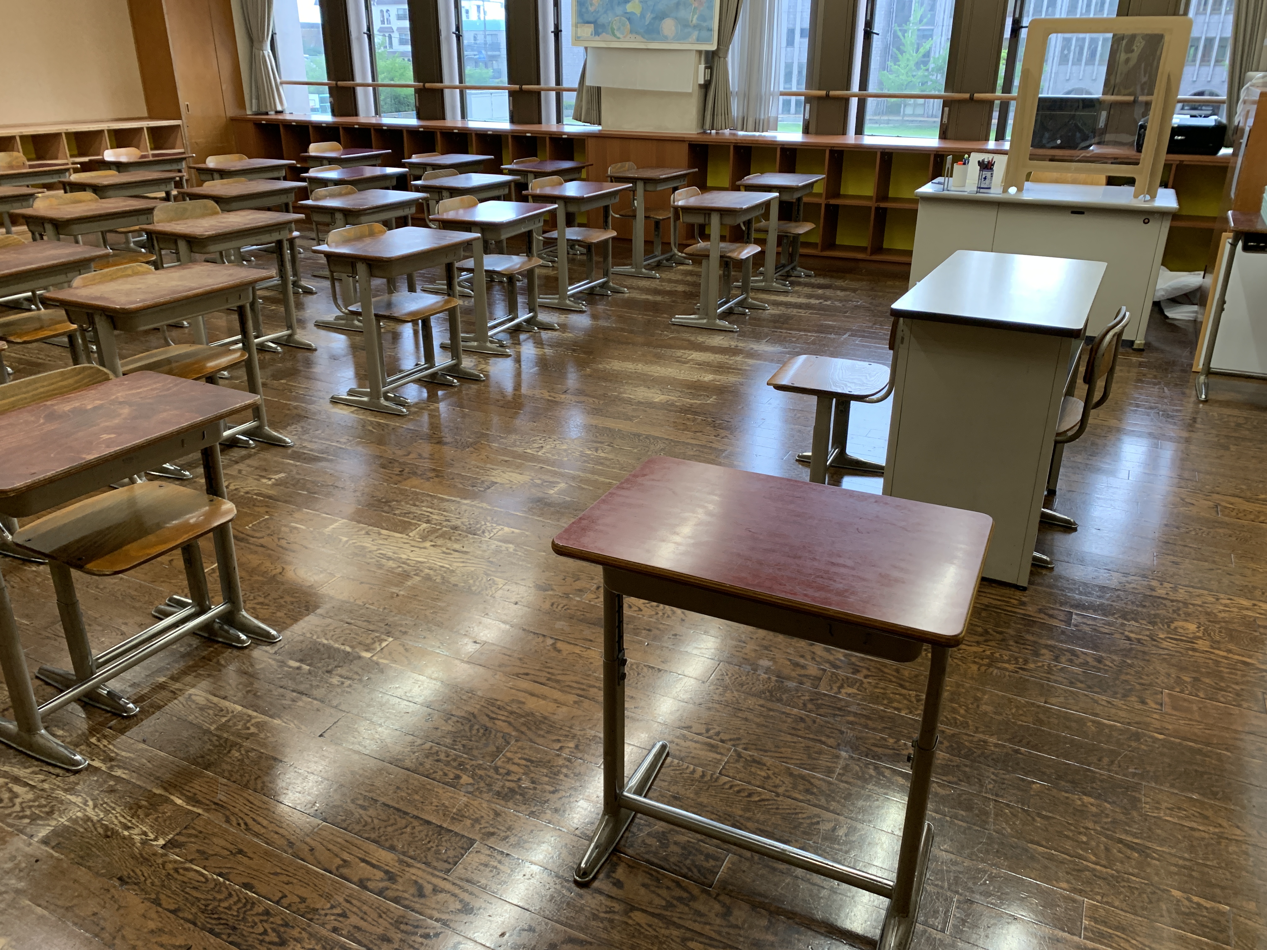 教室は、1人ずつ席を離し、教卓からも距離をとる形で座席の配置をしています。