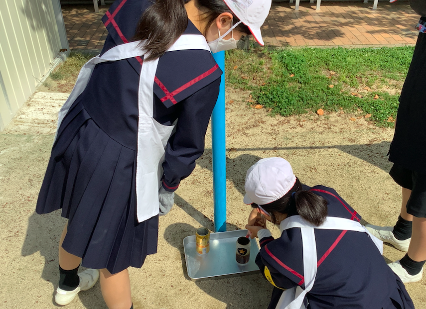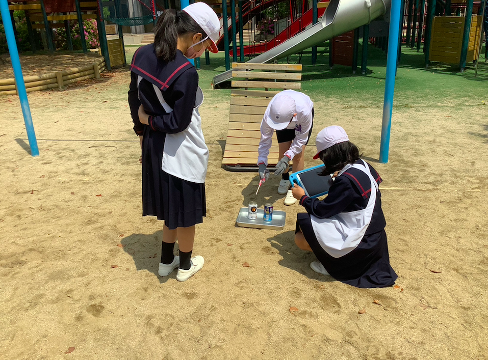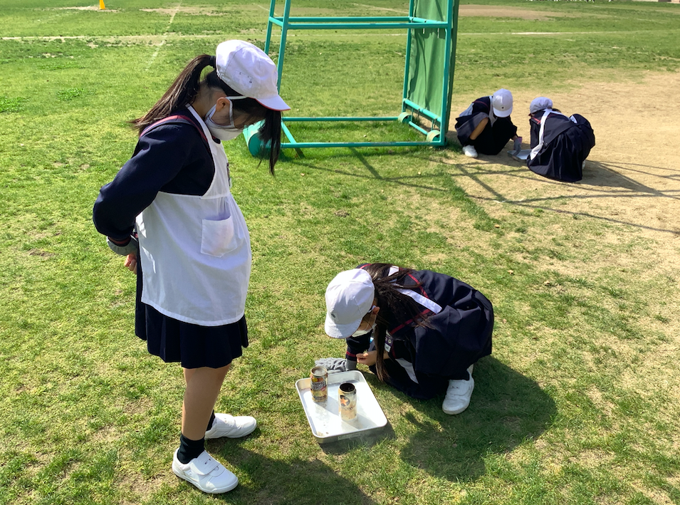 6年生理科で、『ものの燃え方』について学習をしています。空き缶の穴をあけた場合と、穴をあけていない場合で燃え方にどんなちがいがあるのかを調べました。しっかりと記録をのこして次の学習に進みます。天気もよくて、少し汗をかきながらでしたが、運動場で楽しく実験に取り組んでくれていました。