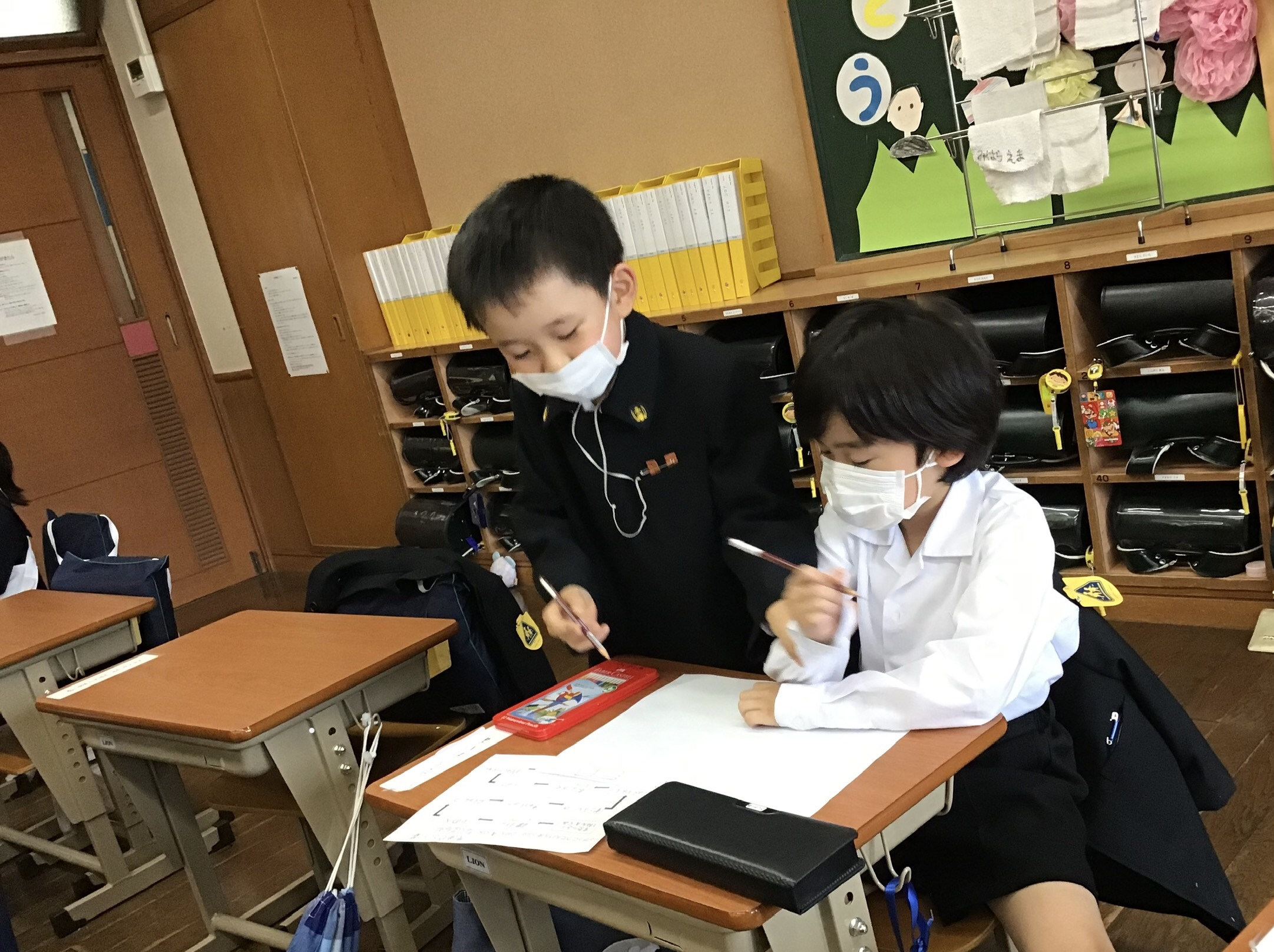 2年生が1年生を連れて学校探検に行きました。2人ペアになり、2年生が学校内の施設を案内したり、それぞれの使い方やルールを教えたりと楽しそうな様子が見られました。1年生はお兄さんお姉さんと交流できて終始笑顔。2年生の頼もしい姿も見られ、成長を感じることができました。
