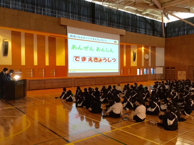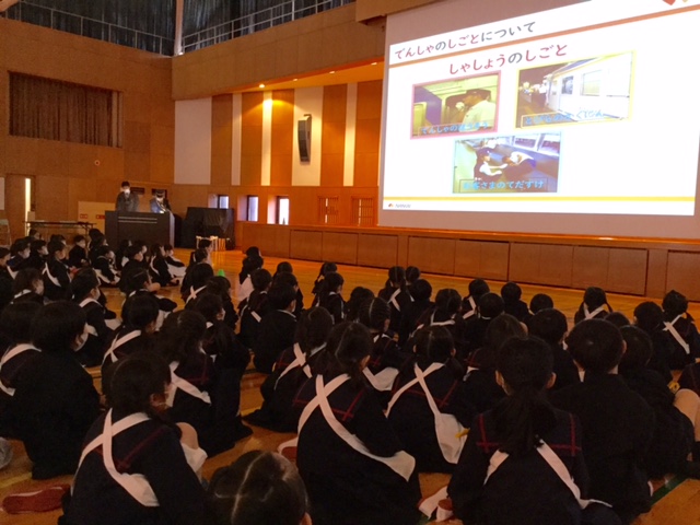南海電車住吉東駅の駅長さん、スーパーバイザーのみなさんに来ていただき、1年生を対象に「南海電車あんしんあんぜん教室」を実施いたしました。