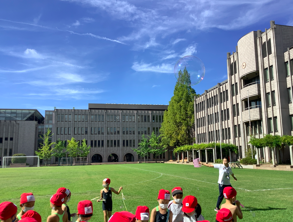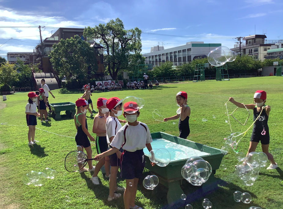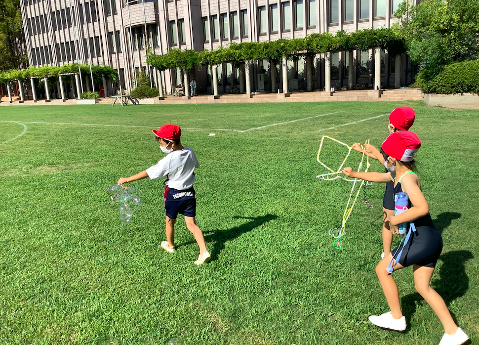 子どもたちお手製のしゃぼん玉アイテムを手に、運動場に飛び出しました。