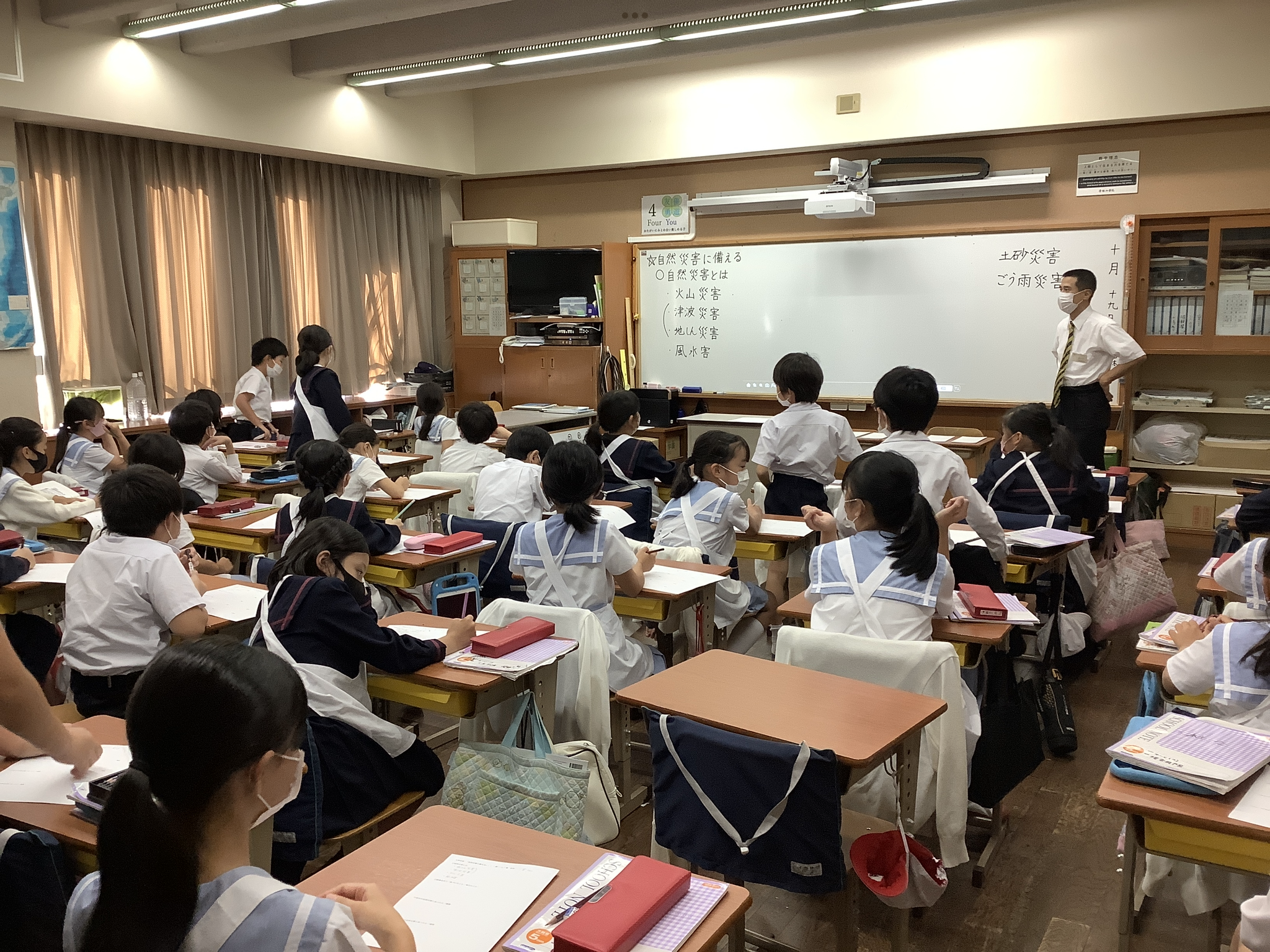 10月19日(水)6時間目、4年C組で社会科の研究授業が行われました。「自然災害に備える」というテーマで、自然災害の種類を知り、その映像を見た後、6つの条件でグループ毎に自分がその場に居合わせたとき、どう身を処すか考える授業でした。その条件とは、?地震・休み時間中・運動場で、?地震・登下校中・道端で、?地震・帰宅後・公園で、?地震・旅行中・海の近くで、?台風・旅行中・ホテルで、?火山・旅行中・火山の近くで、というものでした。それぞれのグループで意見を交わした後、iPadでロイロノートを使い、発表しました。それぞれのグループから出された意見を知ることで、将来いつ来るか分からない自然災害に備えることができそうです。