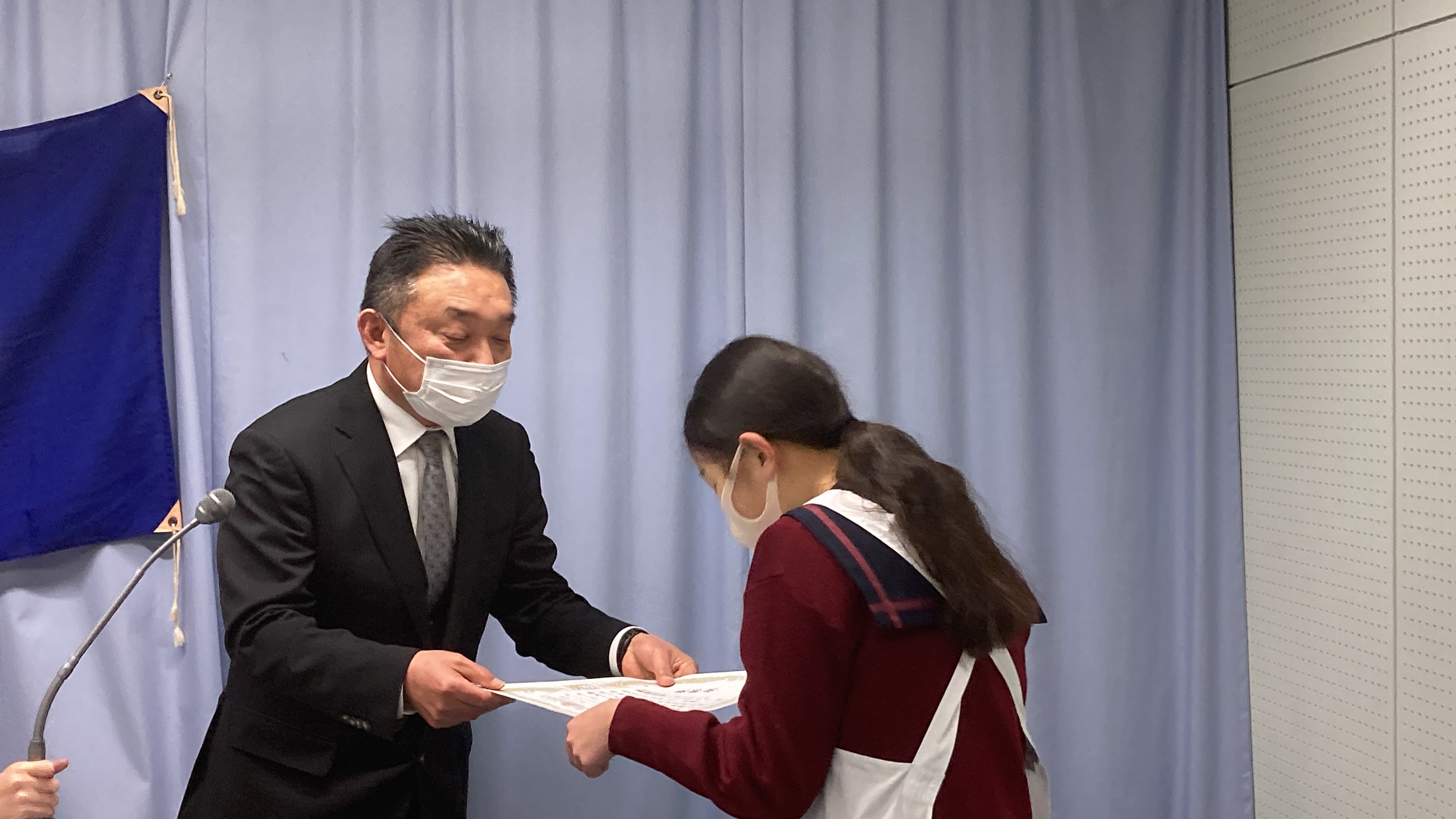 たくさん受検した児童たちの中から、準2級に合格した5年生児童1名と6年生児童1名が、この最優秀賞を受賞しました。本日のTV朝礼では代表して6年生児童が表彰を受けました。