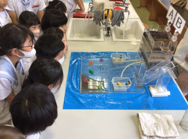 土の違いを実際に触ってみたり、ろ過のしくみを実験で確かめたりしました。