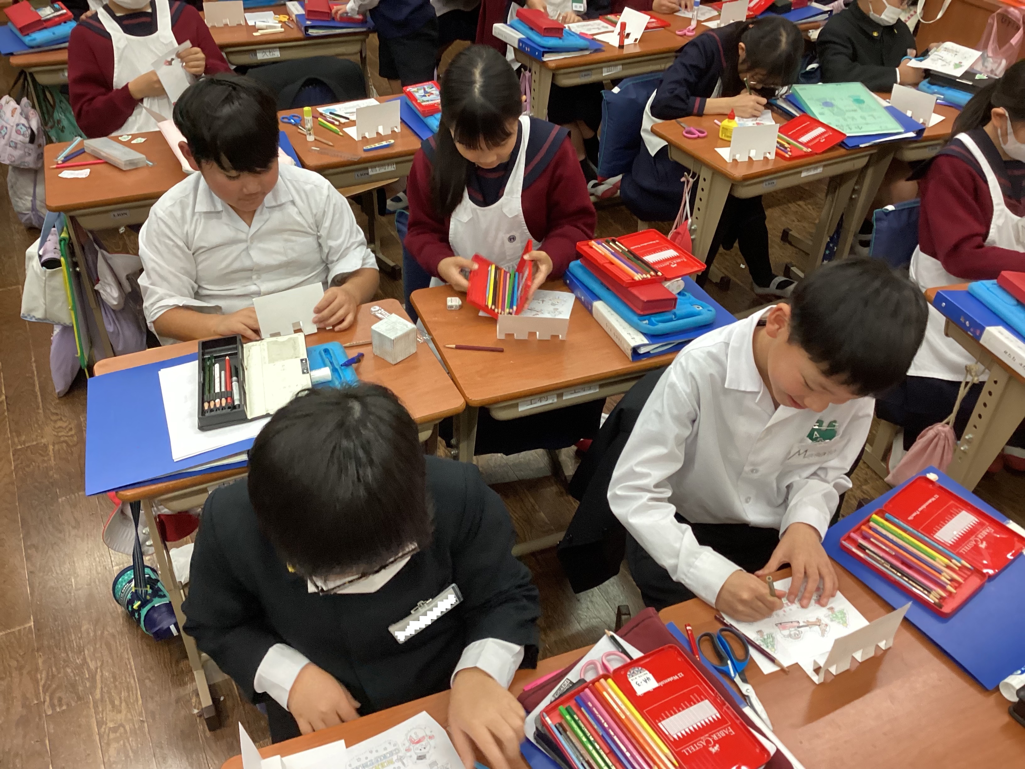 英語科では毎年1年生から4年生の児童が2学期の英語の最終授業でクリスマスカードを作成しています。