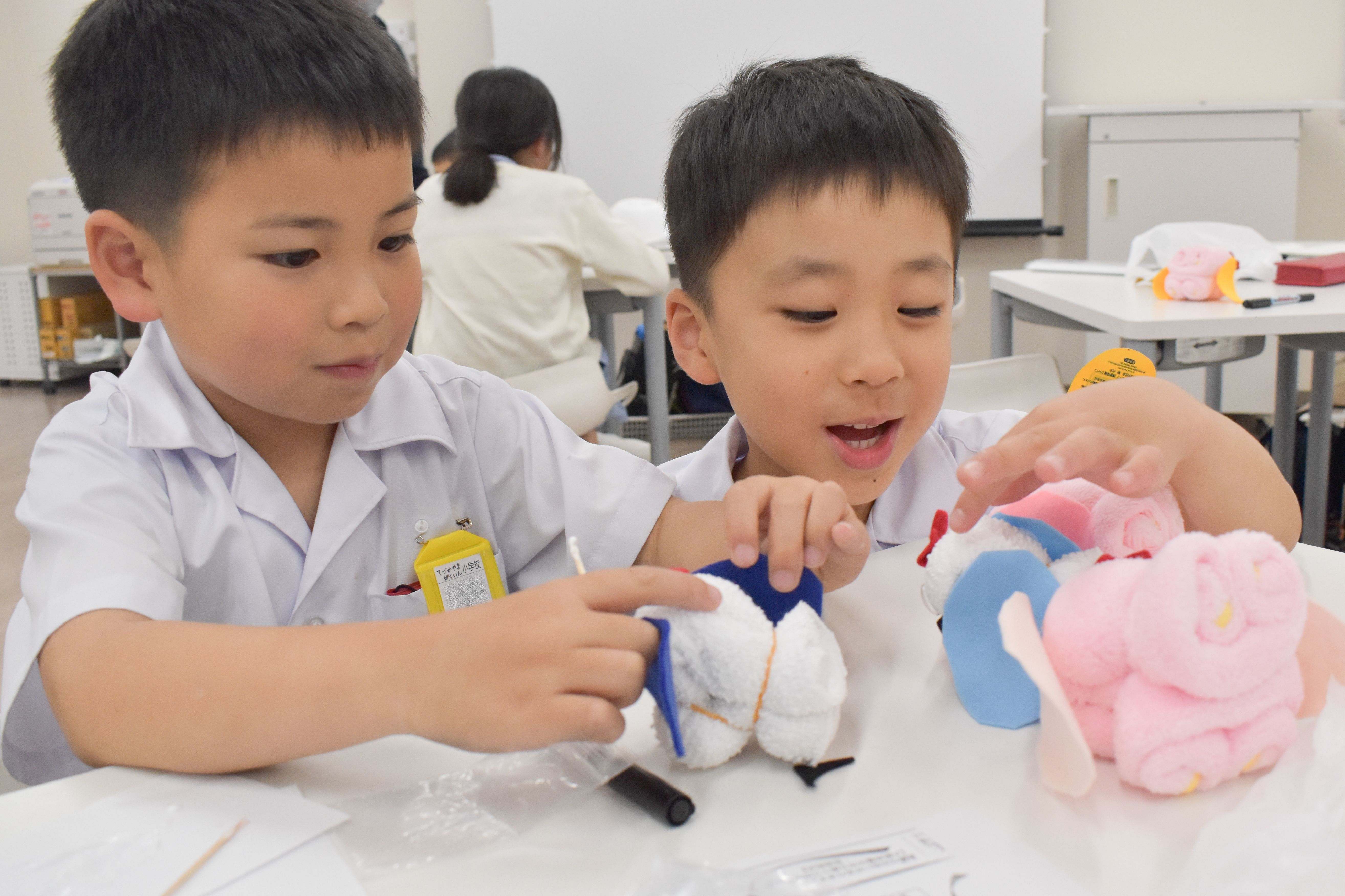 タオルに目や鼻、口、好きな色の耳やリボンを貼って・・・みんな夢中で作っていました。