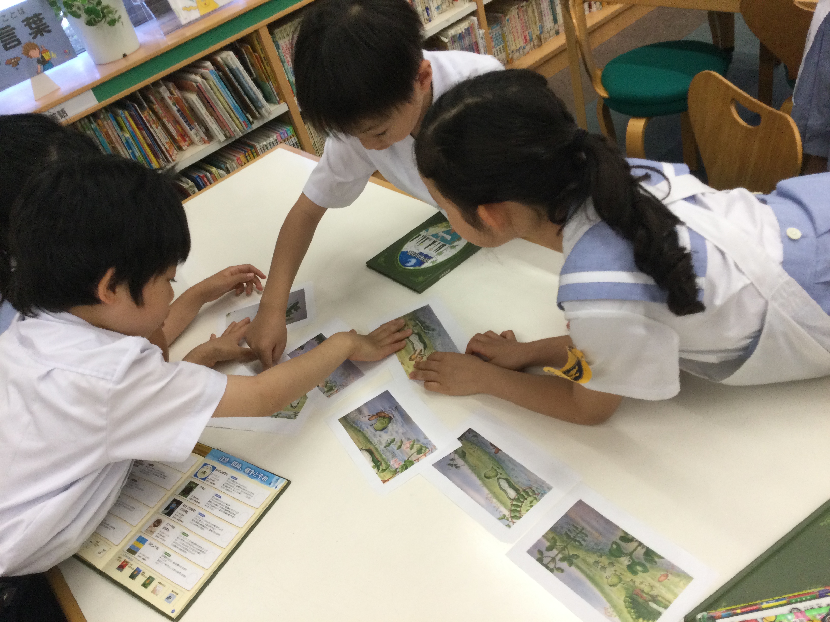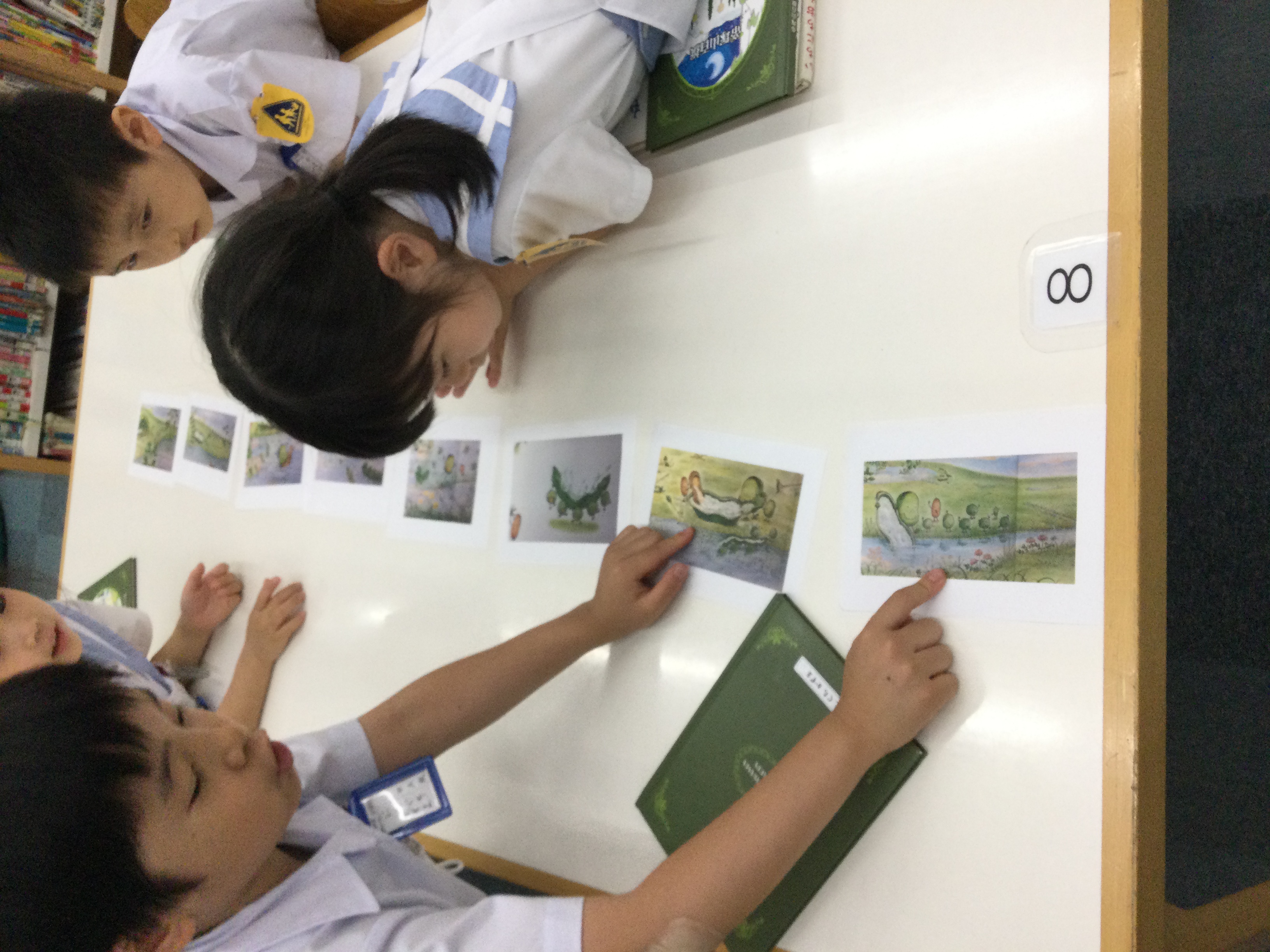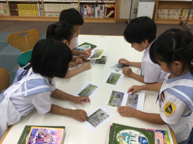 本の読み聞かせの後、バラバラになった挿し絵を順番に並べます。