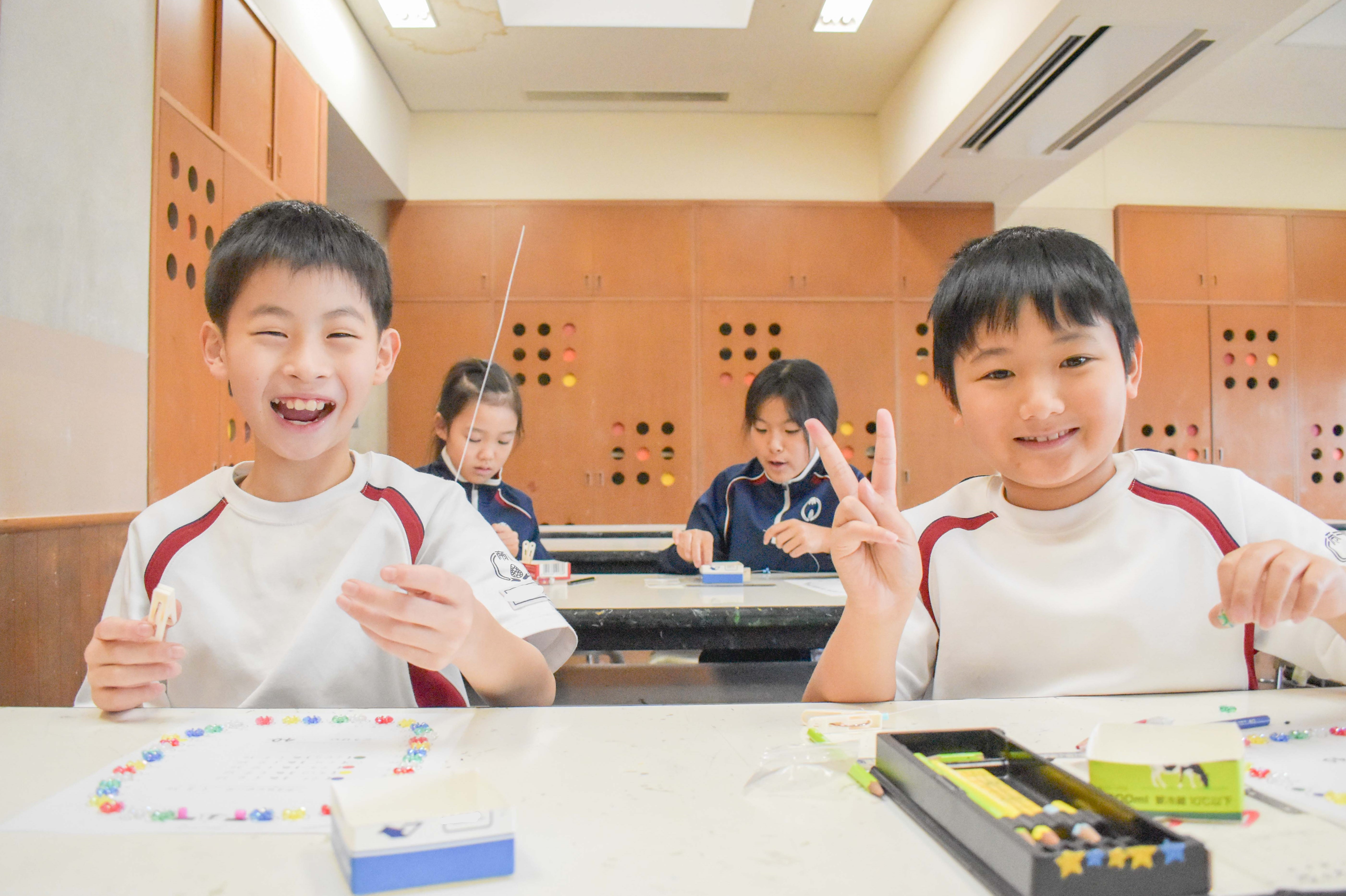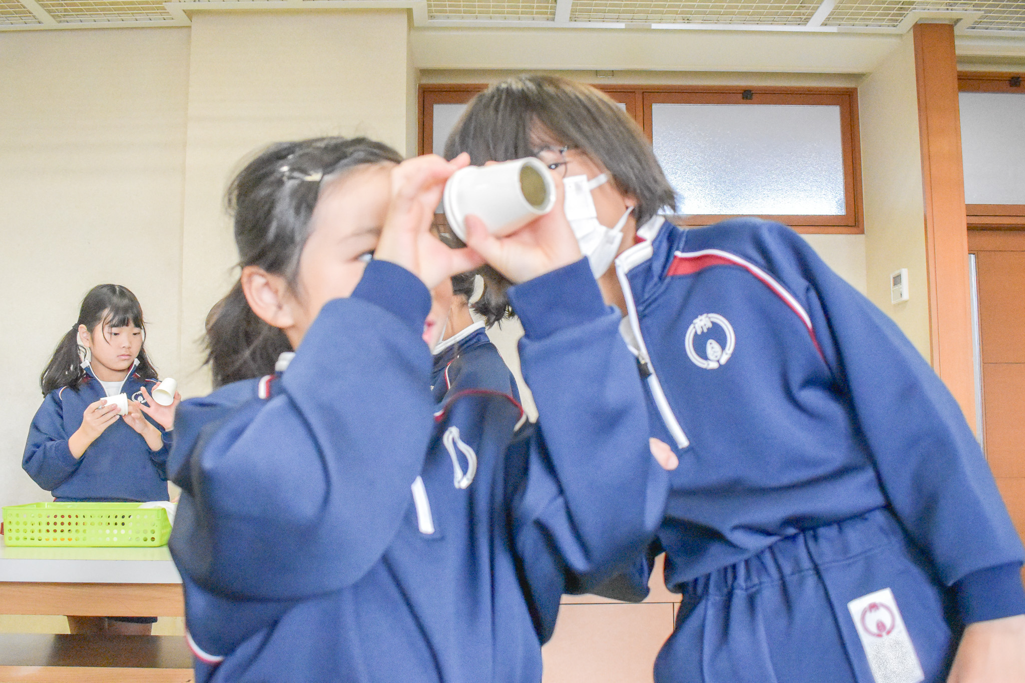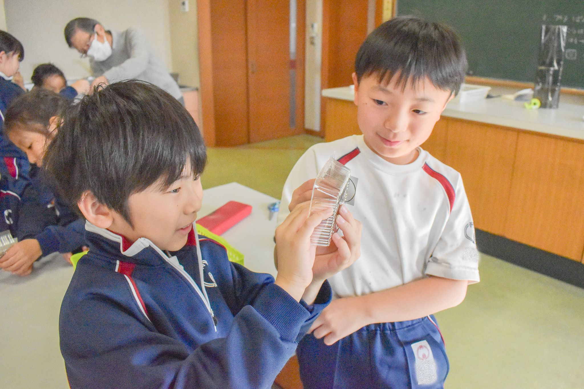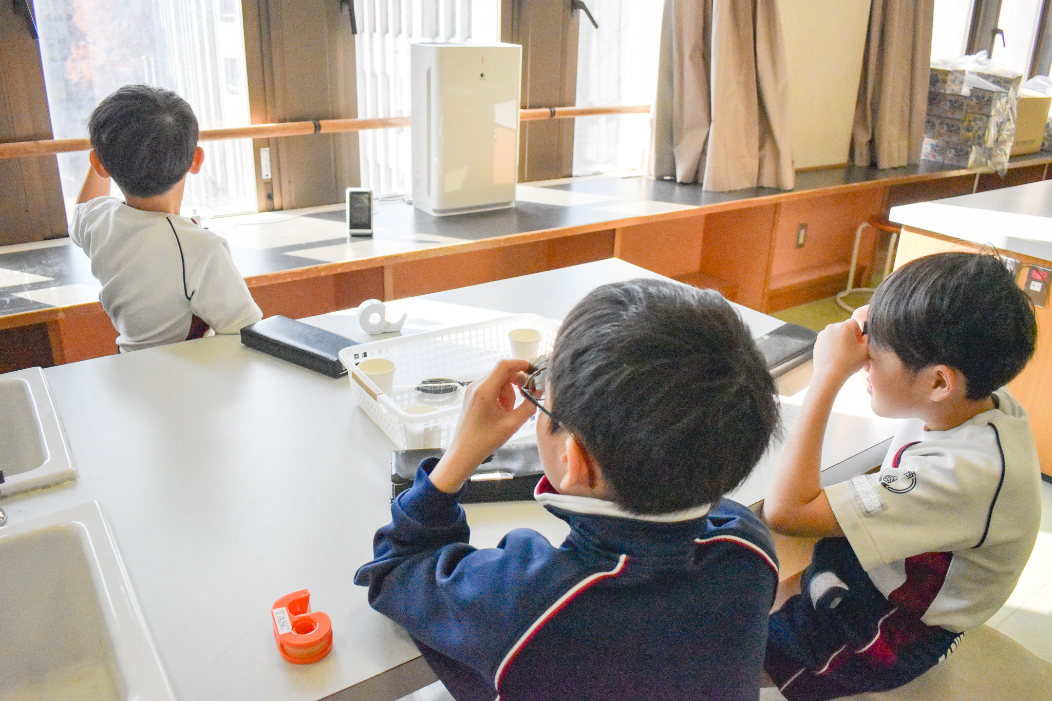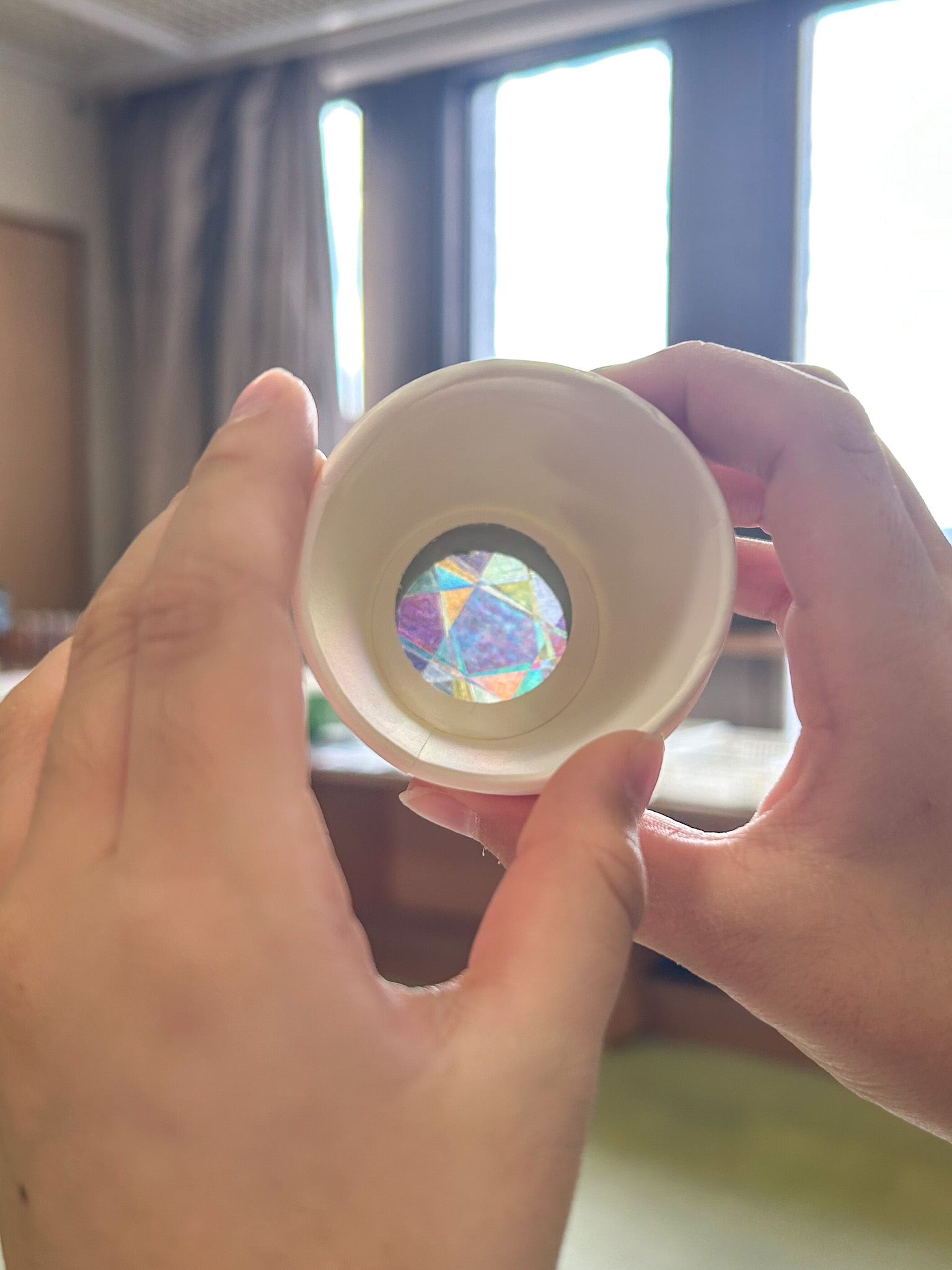 午前の理科実験の授業では偏光板のしくみを用いた万華鏡をつくりました。