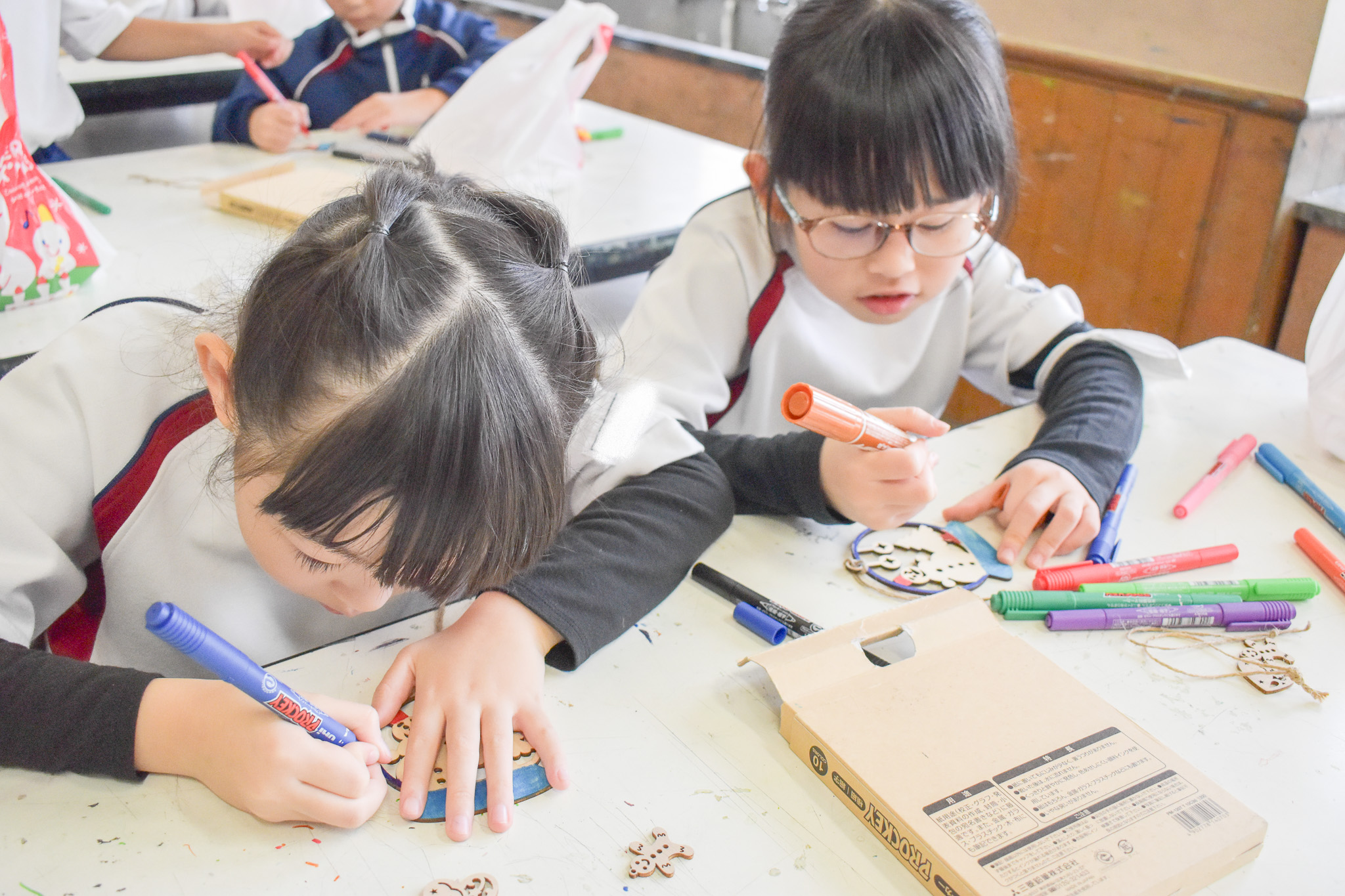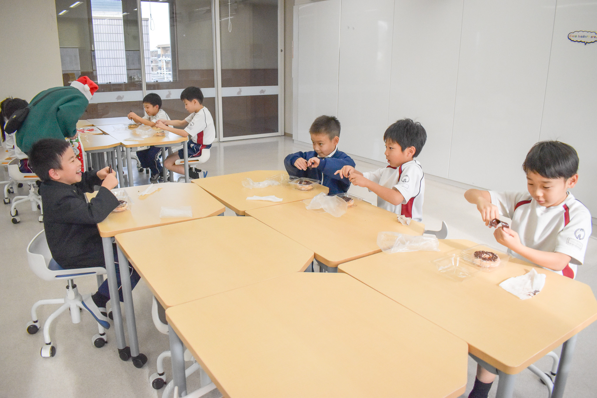 午前は通常通り体育や図書のプログラムを行い、午後からは木製のクリスマスオーナメントの色塗りとドーナツのデコレーションをしました。