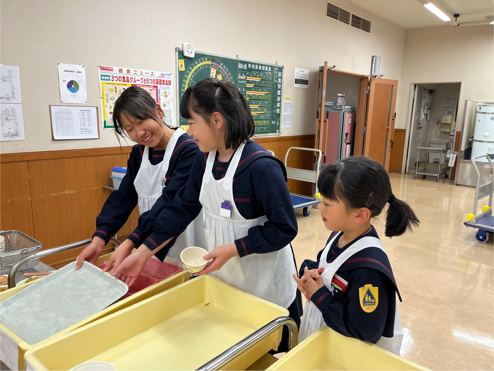 「お茶を入れてください」「はいよー!」というような微笑ましい会話が聞こえてきたり、休み時間ギリギリまで1年生の下膳を手伝ってくれる6年生もいました。