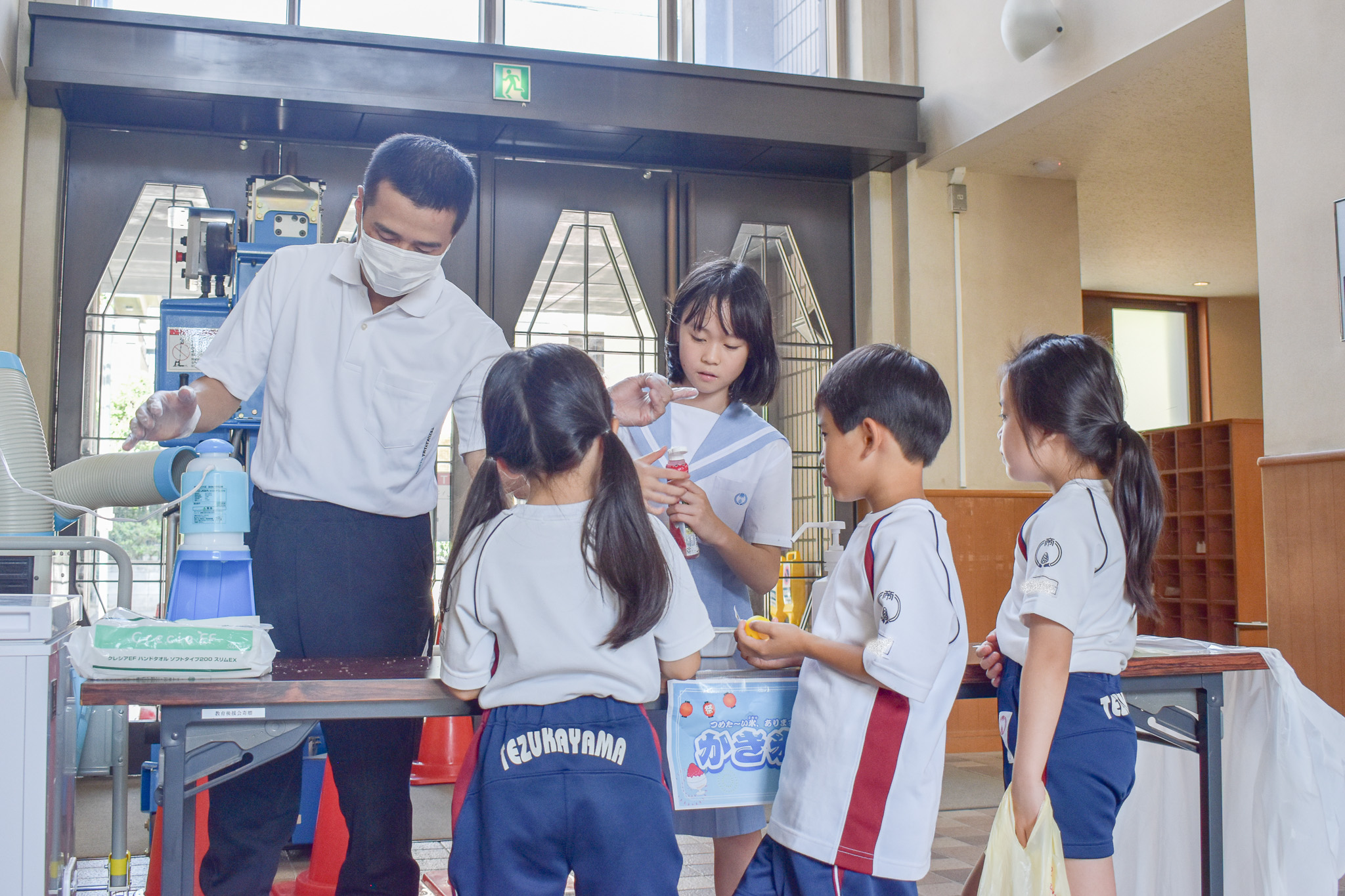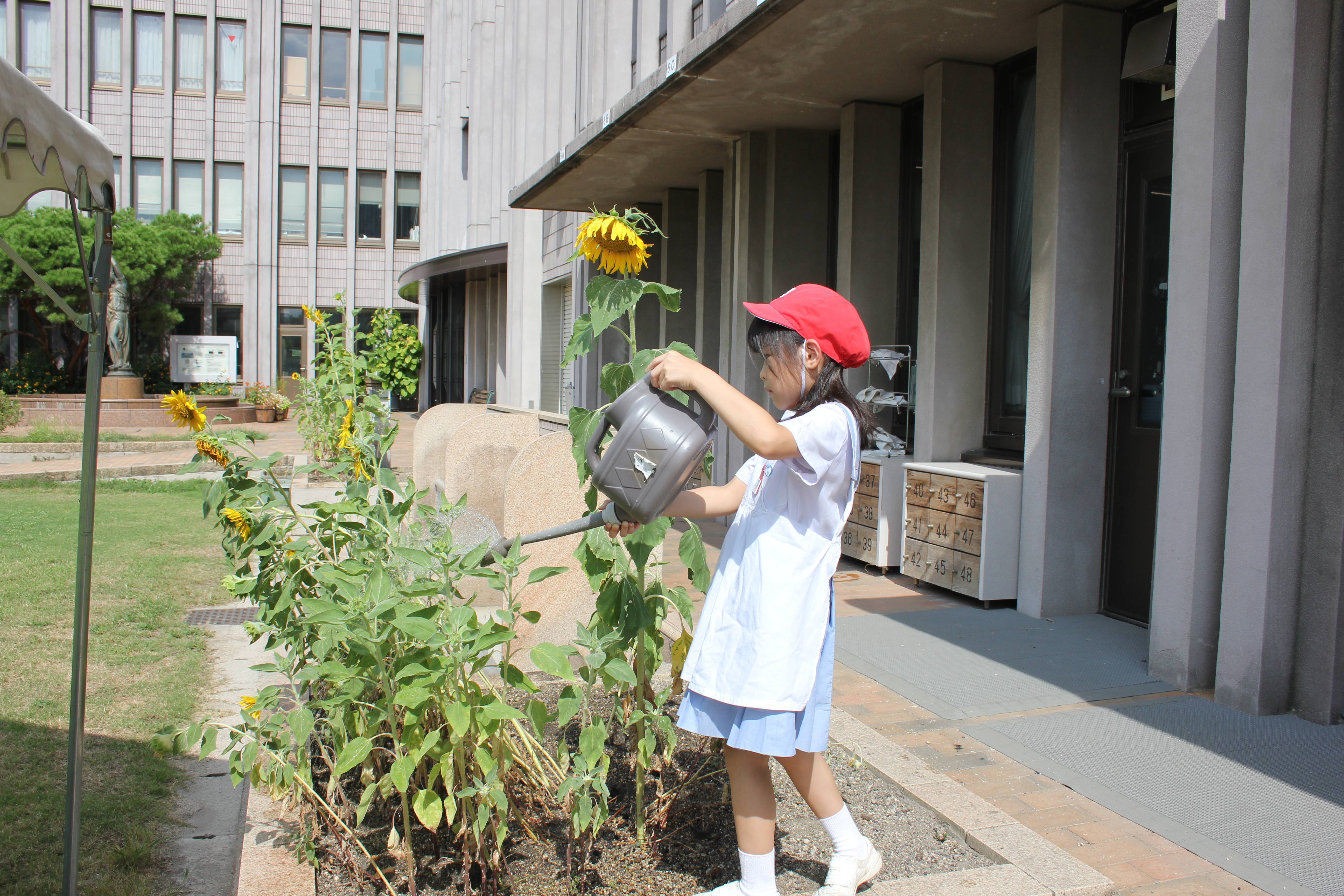 この花壇には、6月の体験授業で本校を訪れた園児の皆さんが蒔いた種も育っていて、1年生の児童が水やりを流づけてくれていました。