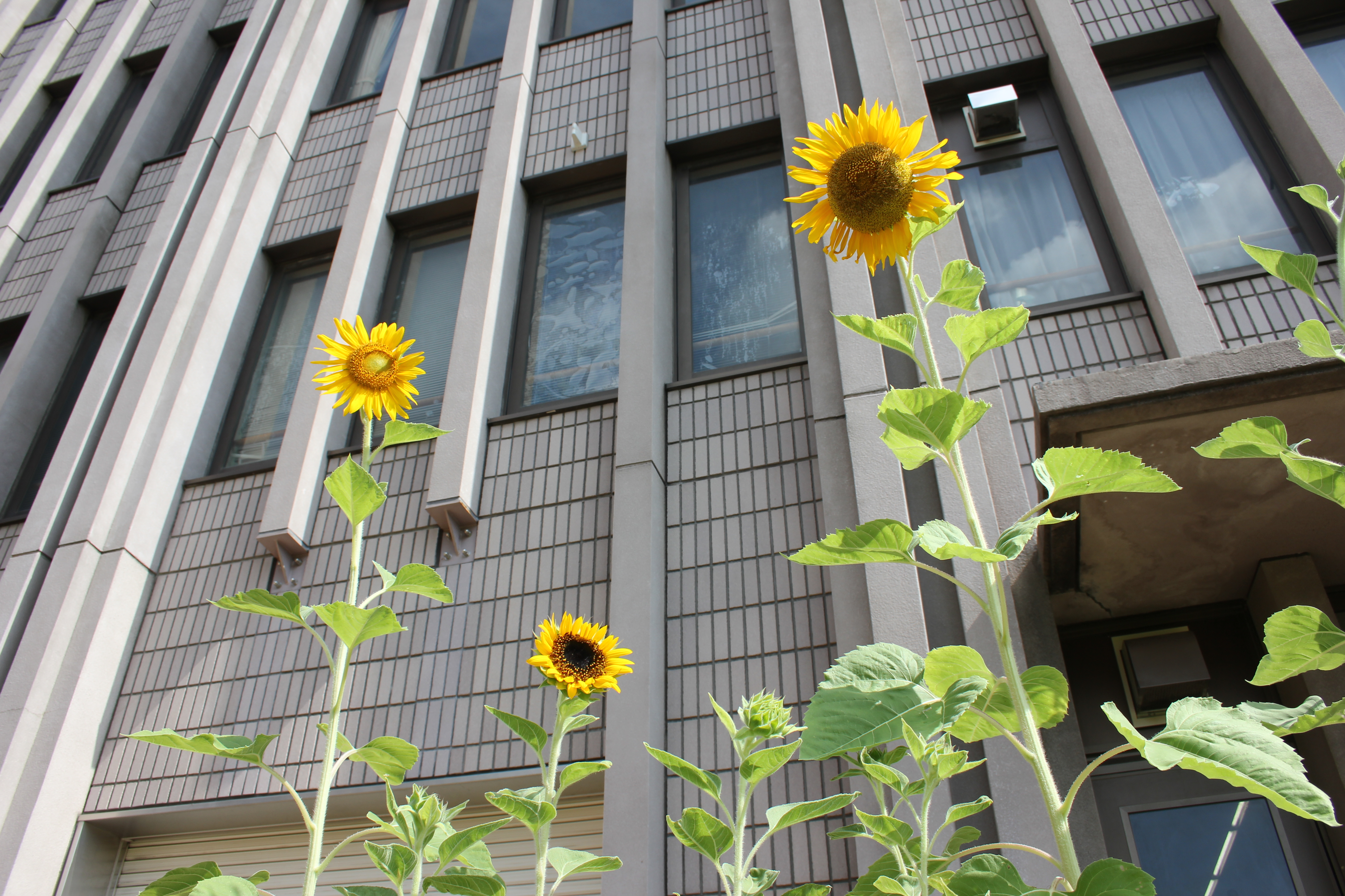 1年生が1学期に蒔いたひまわりのタネが、夏休み中にぐんぐん大きくなり、こんなに立派な花を咲かせています。