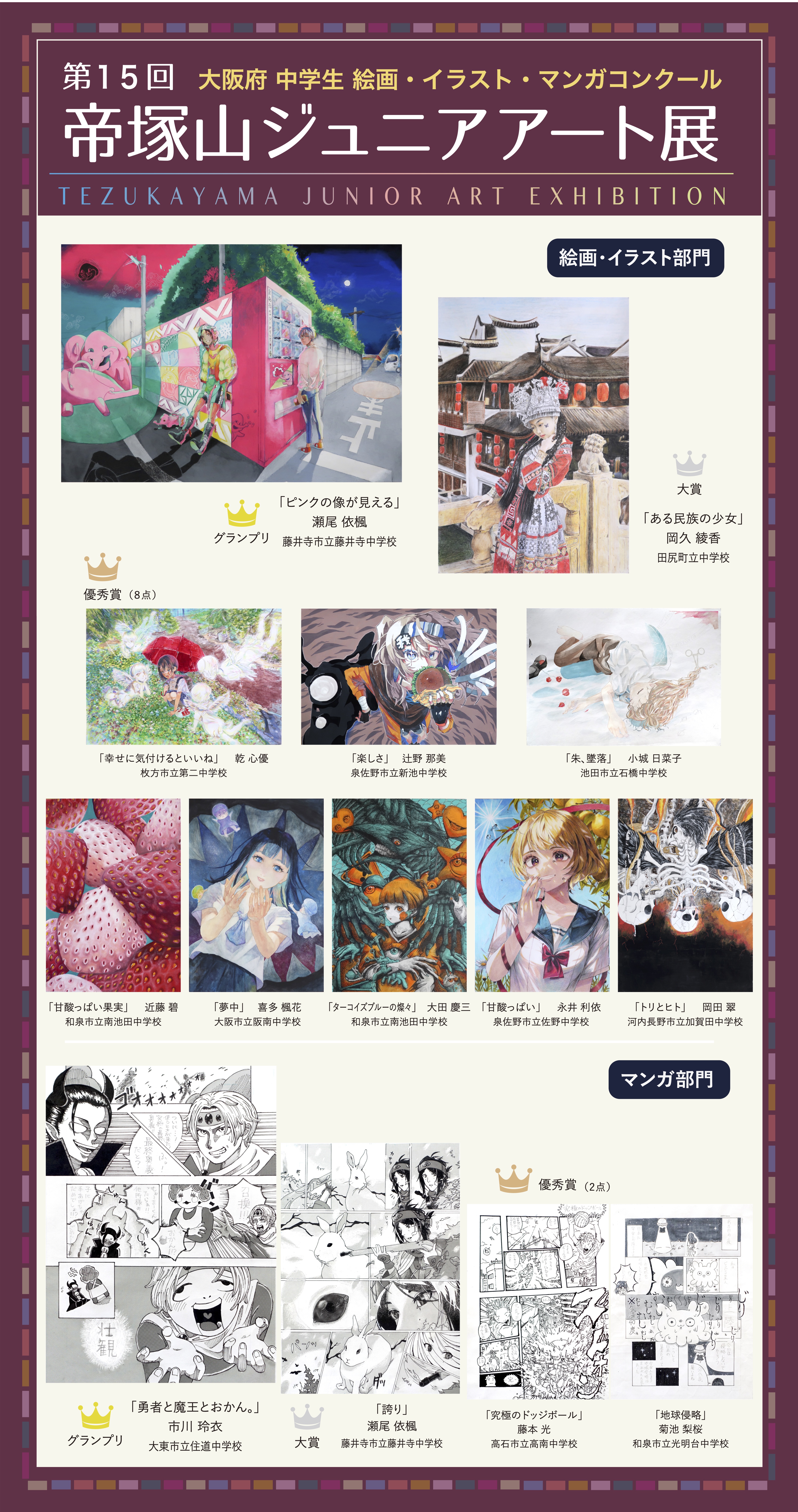 受賞結果 出品数:大阪府下の83校から477点(絵画・イラスト部門:443作品、マンガ部門:34作品)