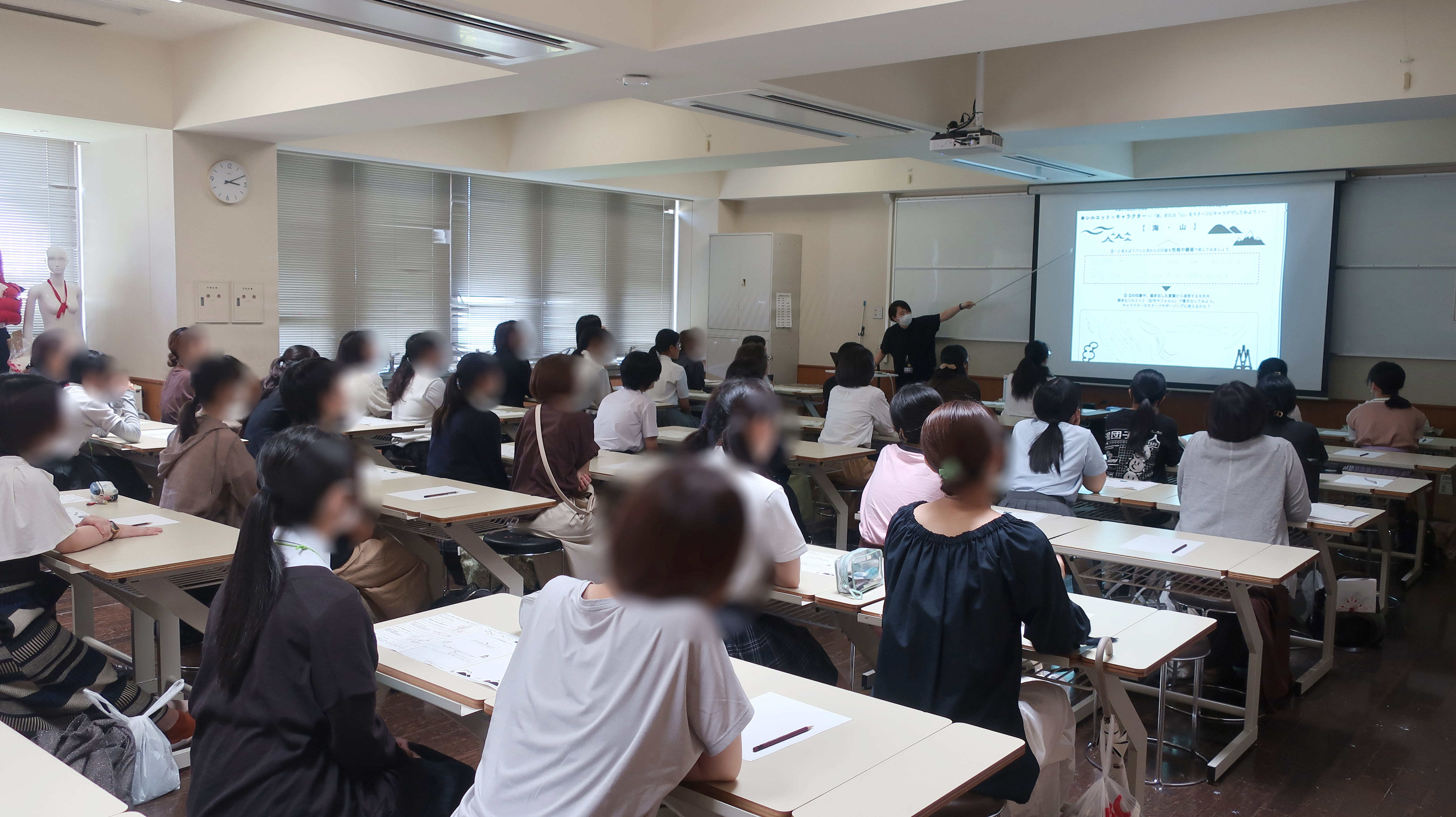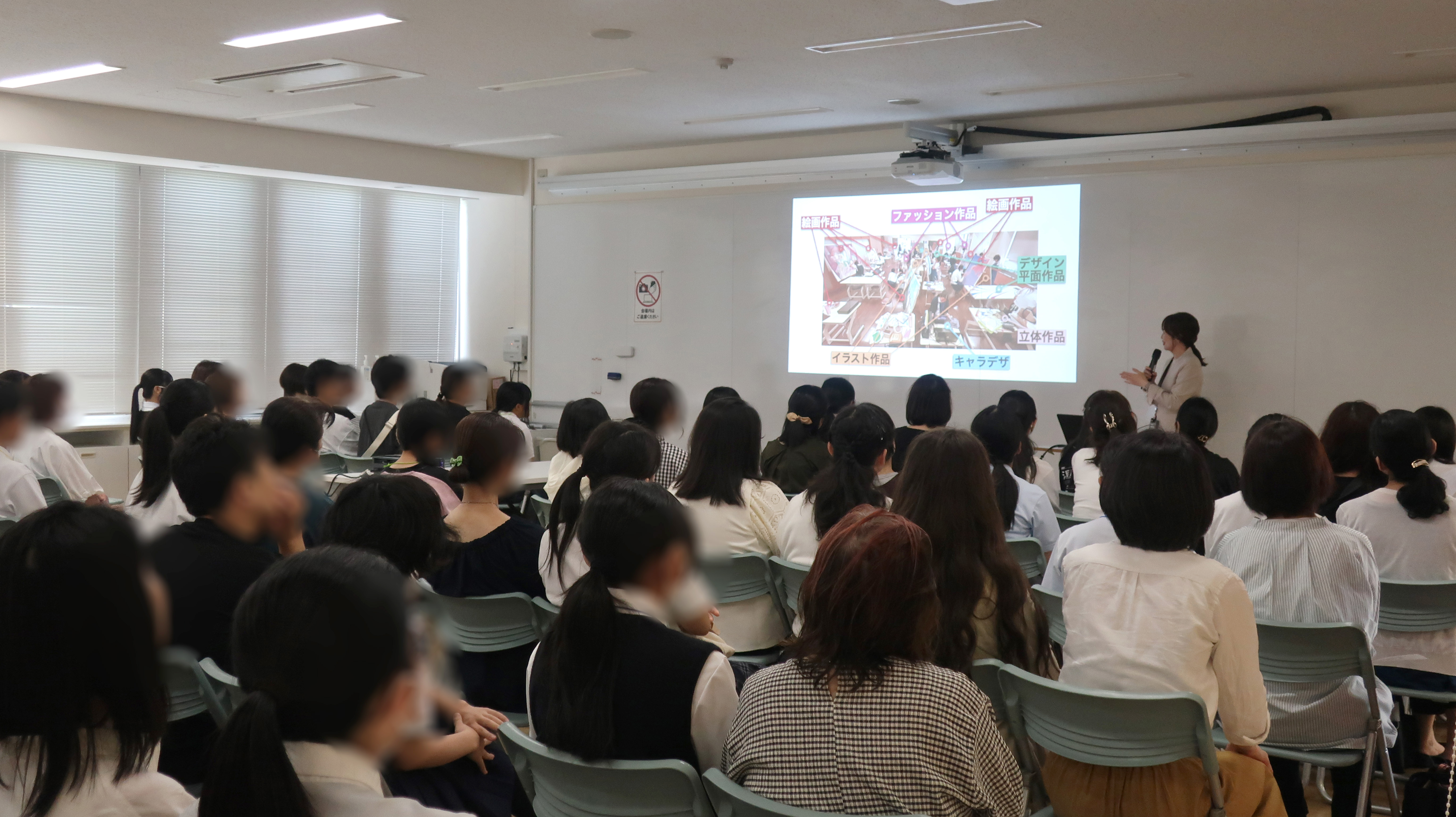 まずは会場にてコース説明会を行いました。帝塚山学院美術コースの特徴やカリキュラム概要、教員紹介などをまじえて説明させていただきました。これからの進路先を考える中で少しでも参考にしていただけましたら幸いです。