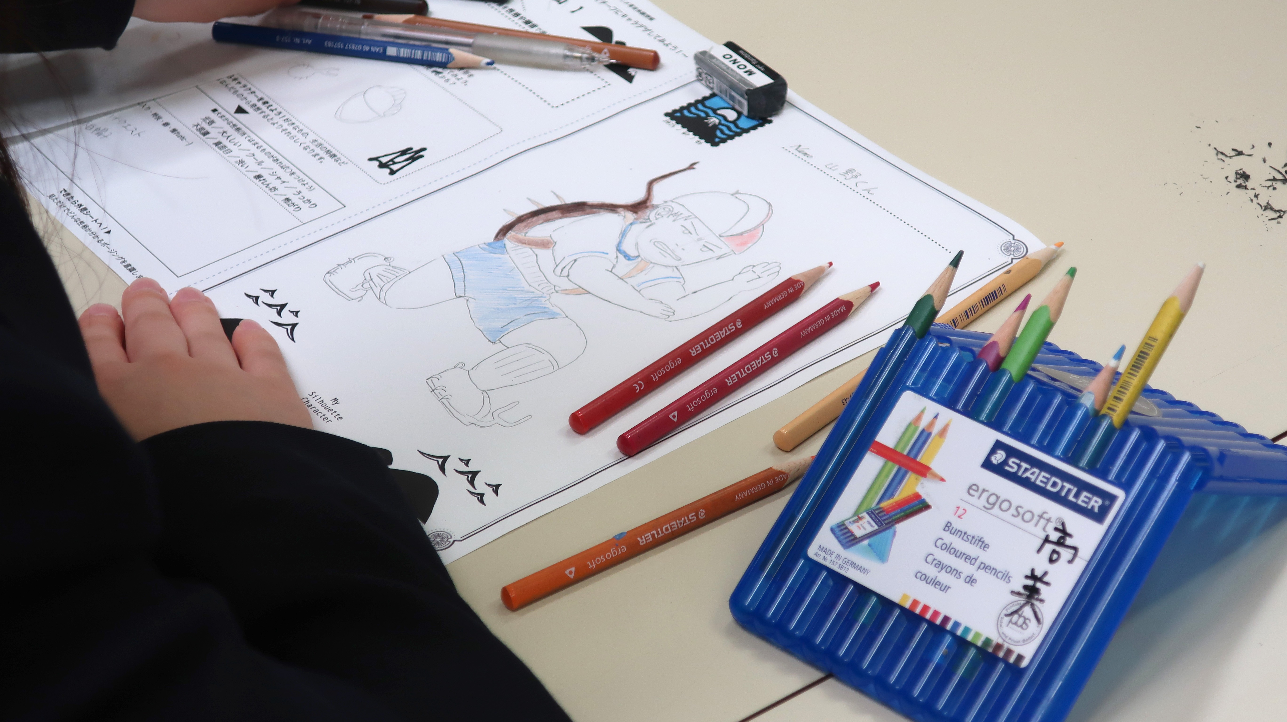 キャラクターのシルエットを想定してキャラクターデザインをします。キャラのポーズや体の動きを考えながら描くことが出来ましたね!色鉛筆で鮮やかに彩色した人もいました。