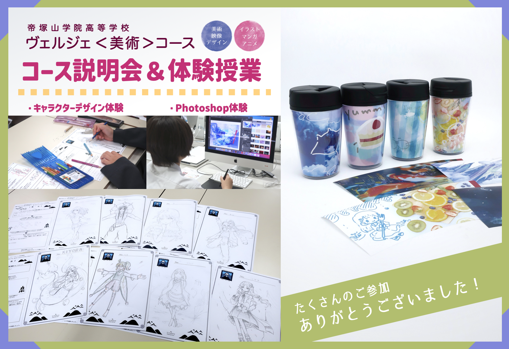 ・はじめの学校説明や作品紹介を見て、どの生徒さんの作品もとてもすごくて、この高校では深く美術について学べるんだな、と感心しました。パンフレットなども見ていると、いろんなことが学べるし、大学と連携していることがすごいなと思いました。体験授業も分かりやすかったし、初めて触れるMacやPhotoshopの楽しさを知ることができました。デザインを考えるのが少し難しかったけど、最終的には周囲の助けもあり、良いものができたと思っています。すごく緊張したけど、楽しくて面白い体験をすることができて、良い思い出になりました。本当にありがとうございました。