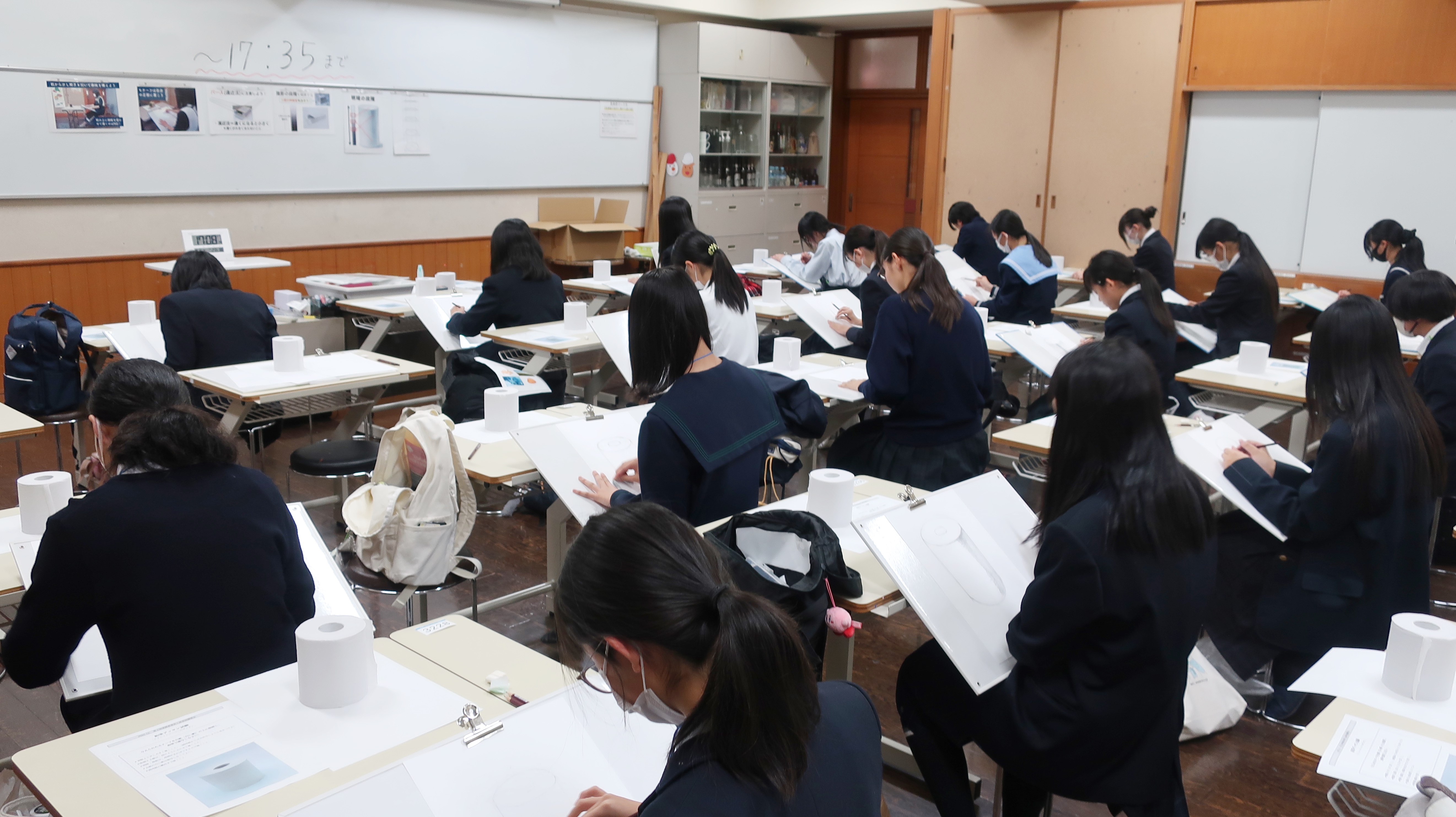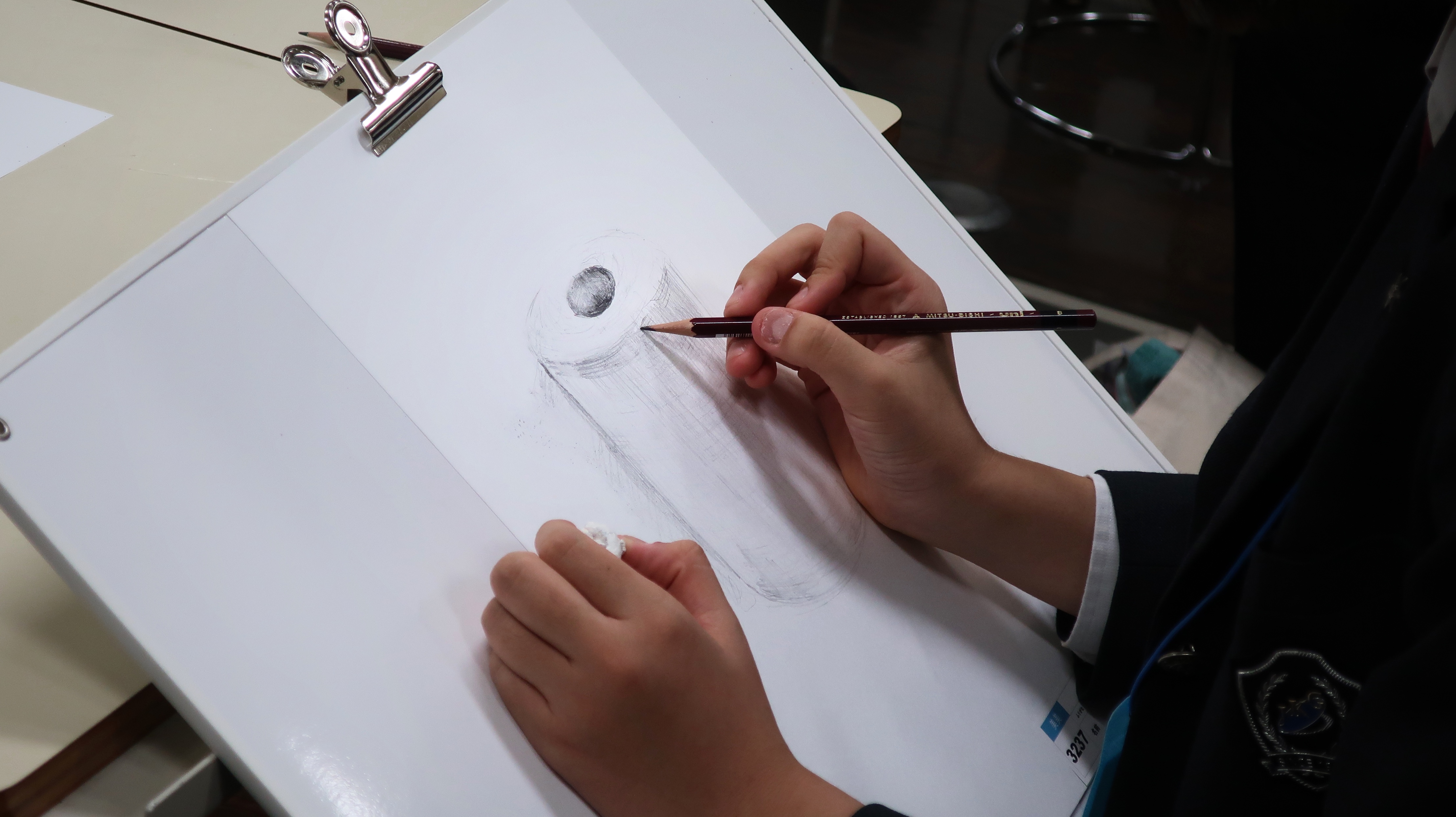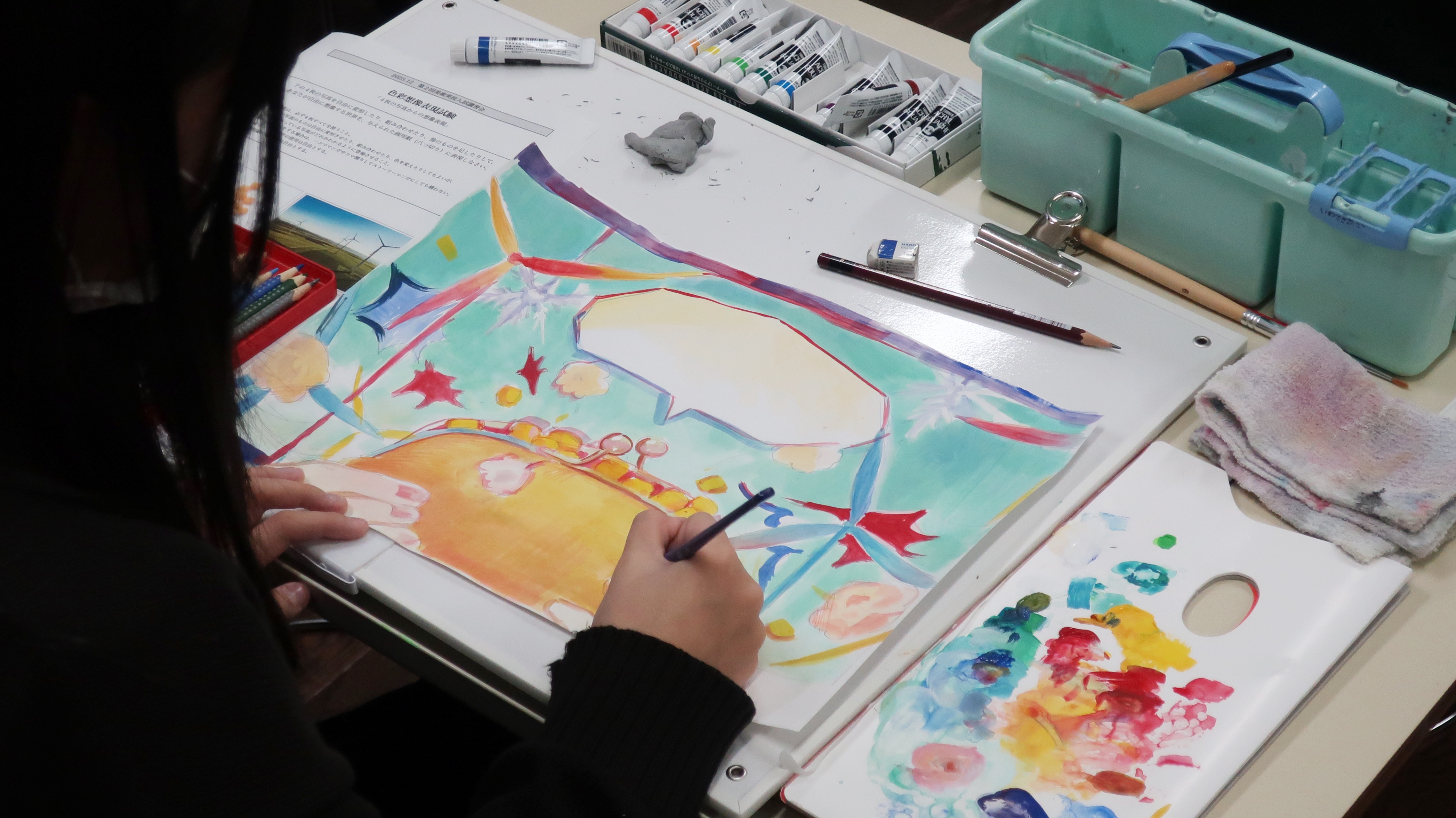 参加してくださった皆様、ありがとうございました!本校美術コースの実技型入試では、①鉛筆デッサンと②色彩表現の試験があります。今回もその両方を体験してもらいました。今回は卒業生の2名にも講習会のお手伝いとアドバイスなどをしてもらいました。卒業生たちは中学生の皆さんの素敵な作品に驚いていました。