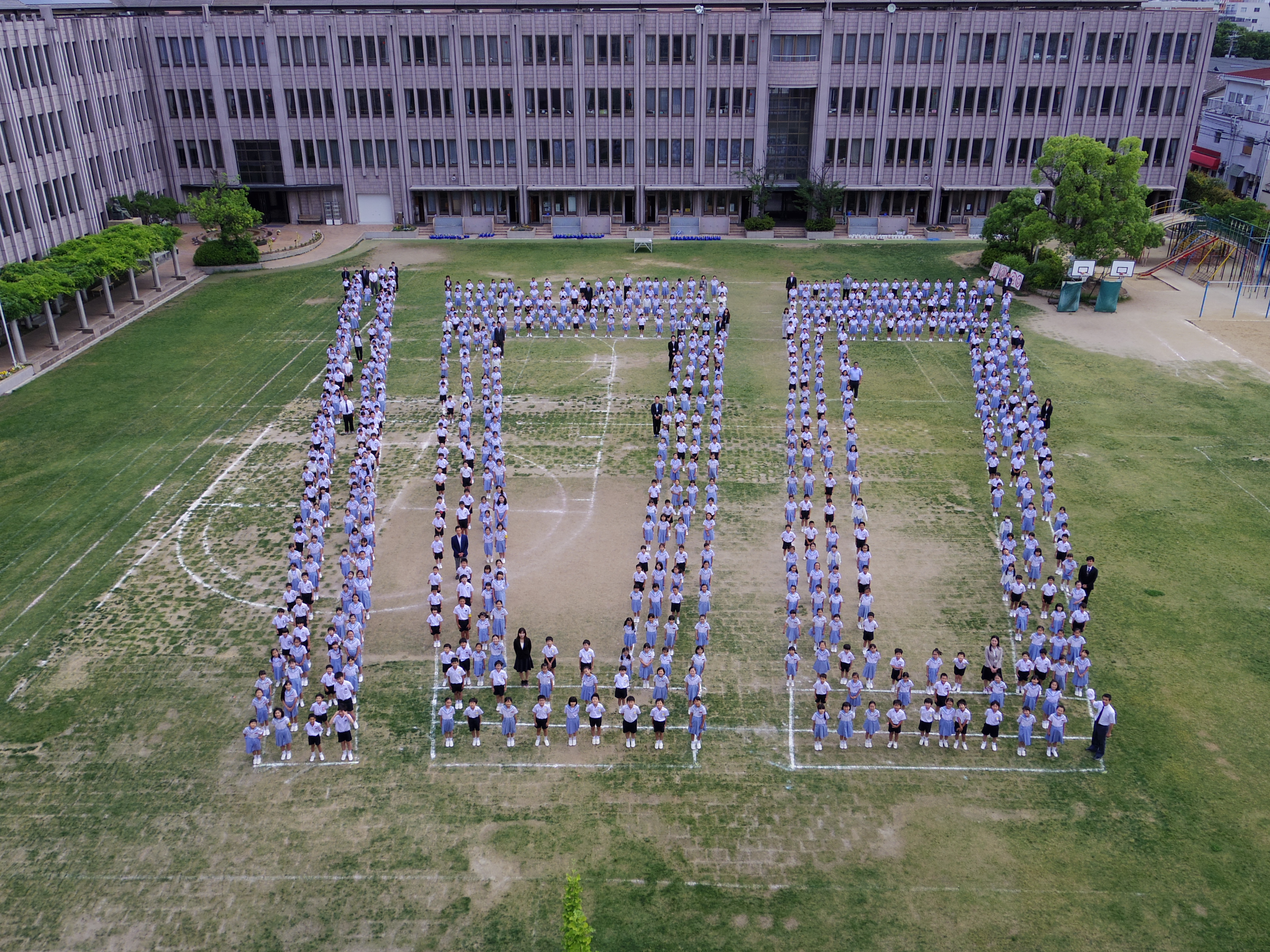 本日、児童たちは、いつもより少し早く登校し、運動場いっぱいに100の人文字を作りました。