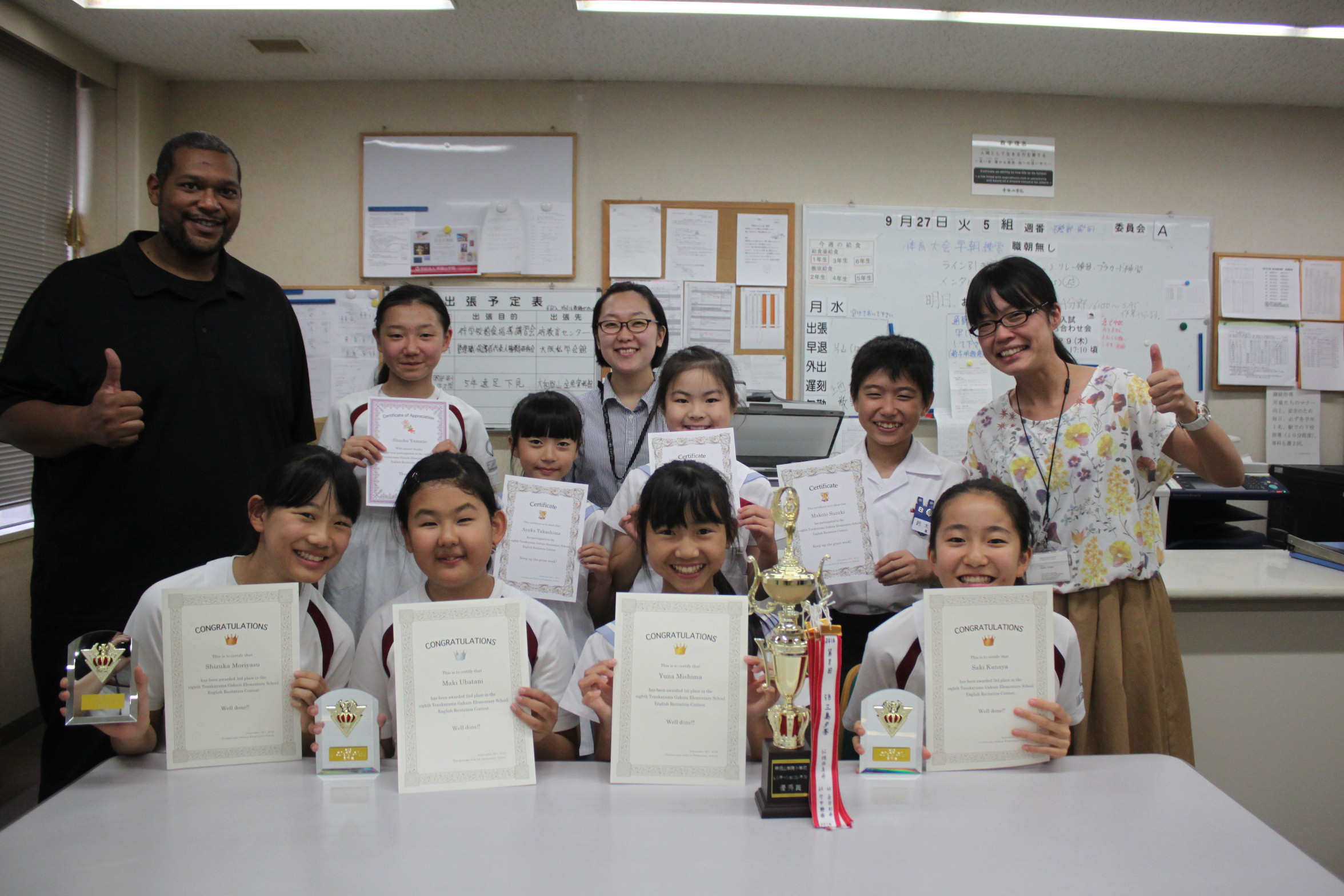 翌日、火曜日にその表彰が行われ、1〜3位の児童には盾が、全員の児童に表彰状が授与されました。