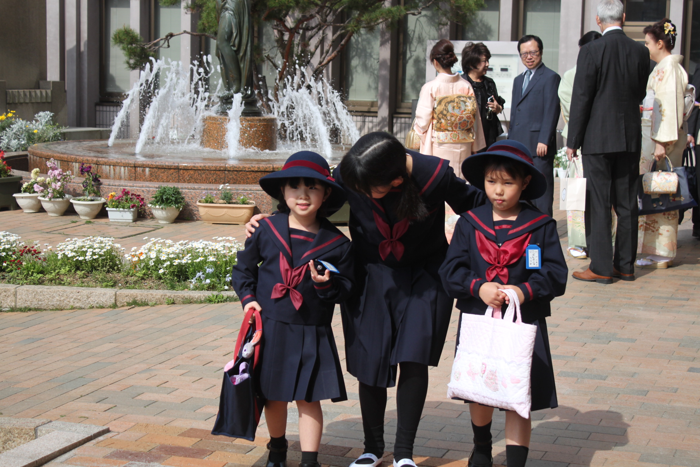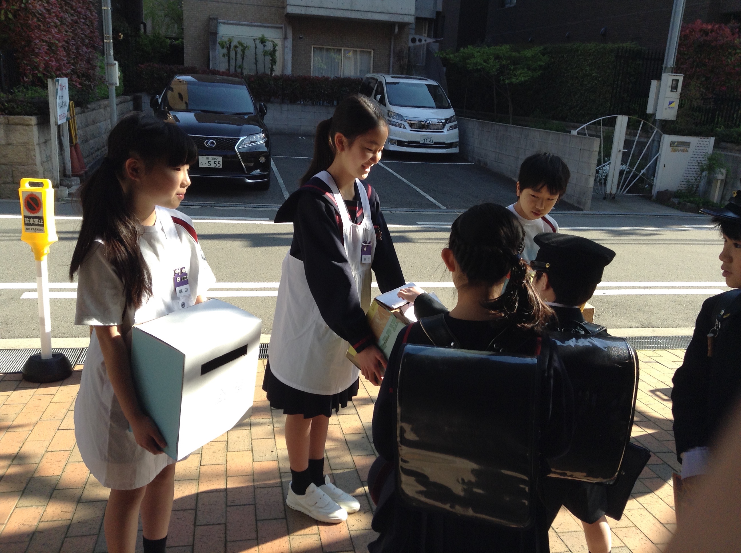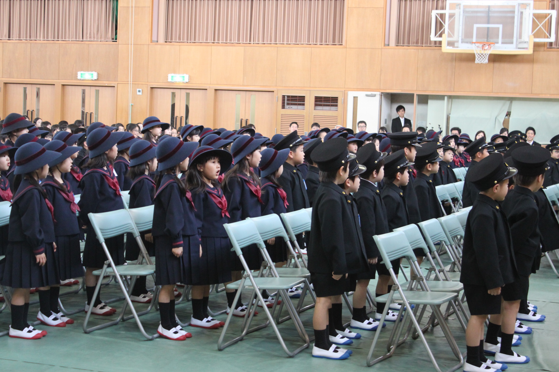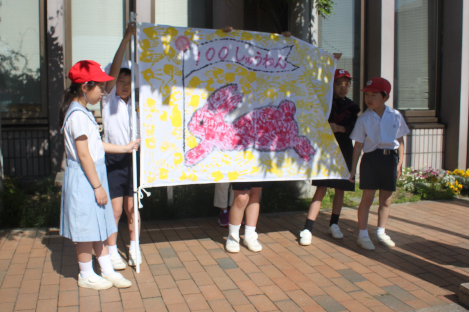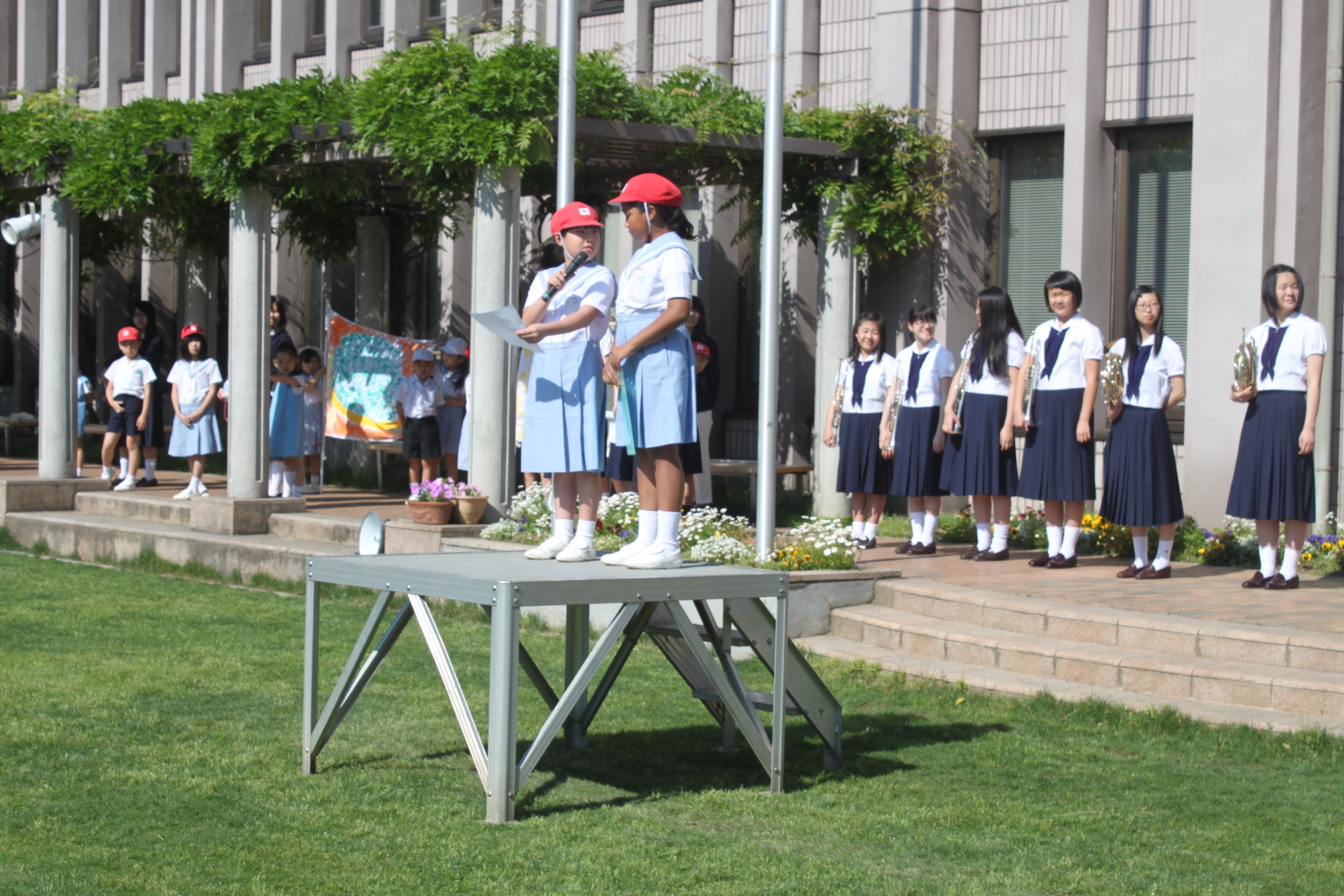 小学校では、セレモニーに使われるくす玉とお祝いの旗(手形で兎、亀、校章を表現した絵)を児童たちが、力を合わせて制作してくれました。セレモニーは、児童・生徒の言葉から始まり、学院歌斉唱と学院旗掲揚。