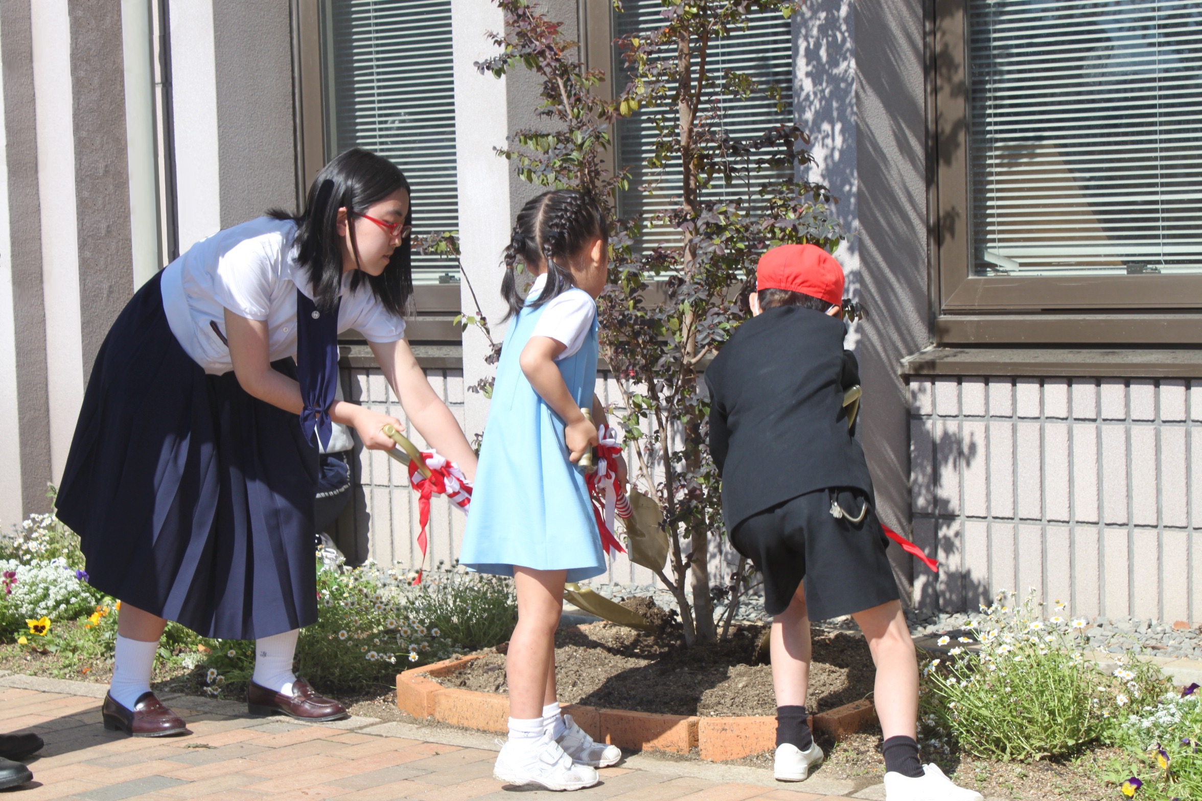 ベニトキワマンサクという木の記念植樹も行いました。最後にみんなで祝歌を斉唱して、素敵なセレモニーは終了しました。修学旅行先での6年生もくす玉を作り、修学旅行先でセレモニーを行いました。場所の違いはありますが、帝?山学院を思う気持ちは、同じです。