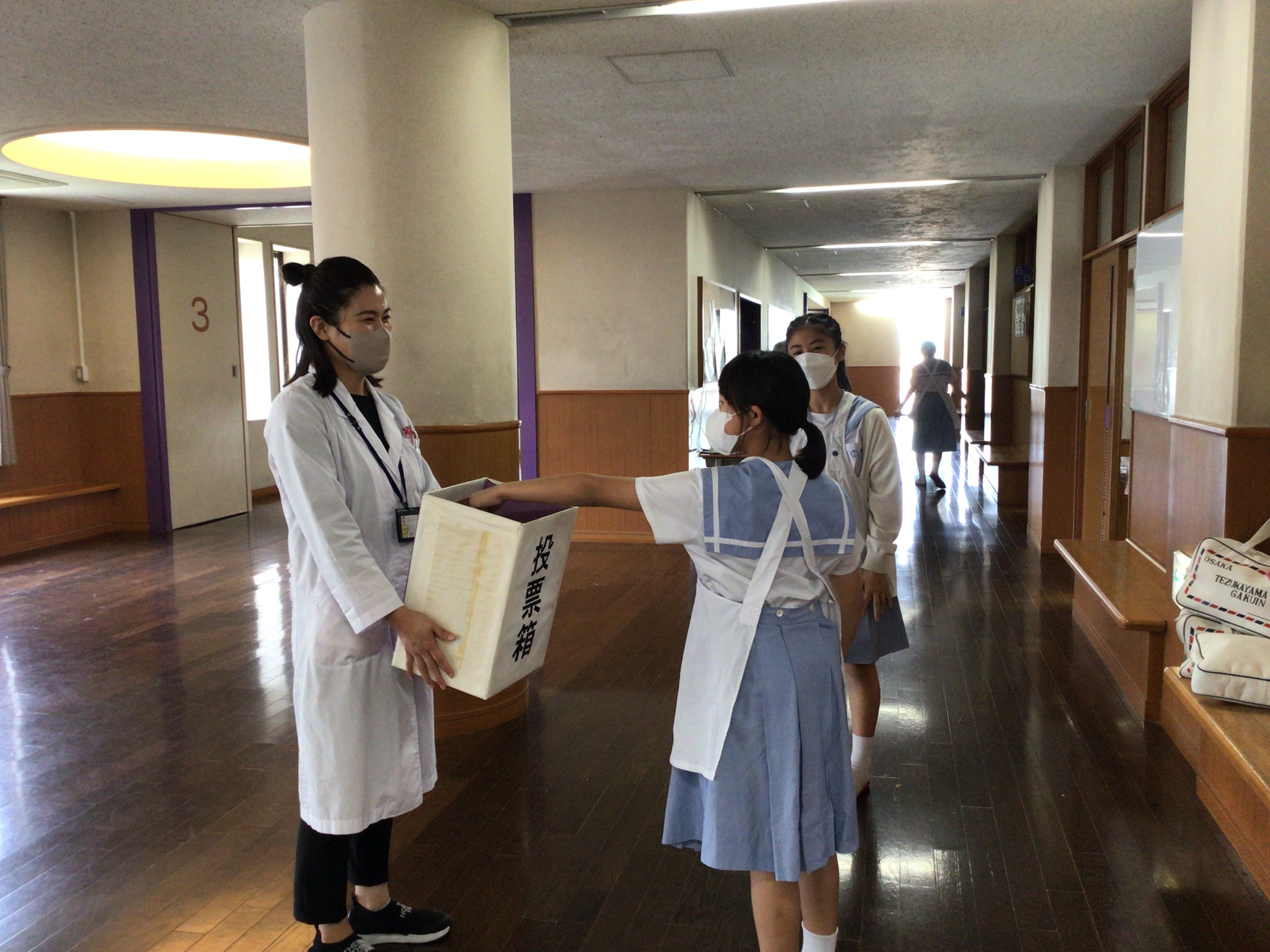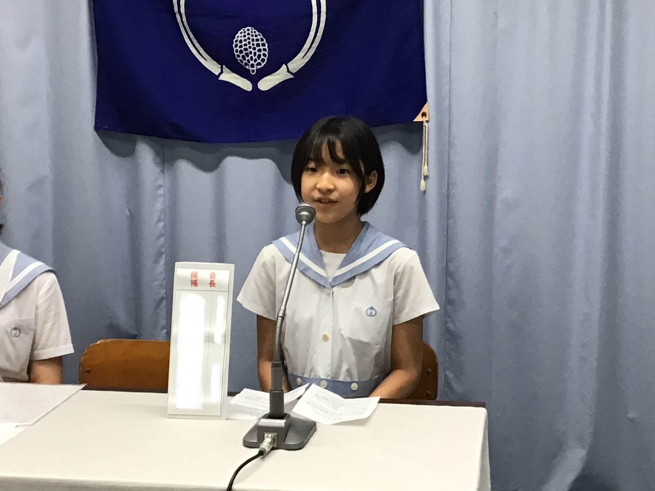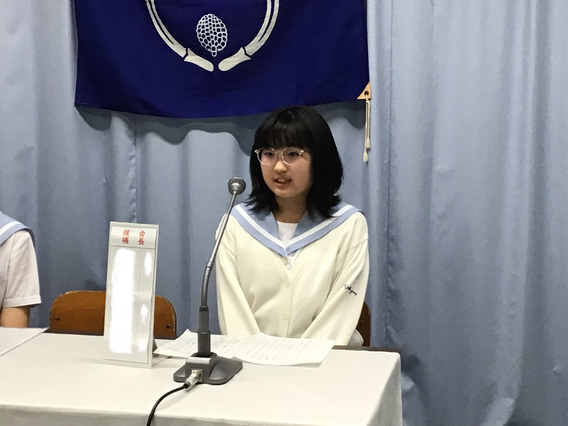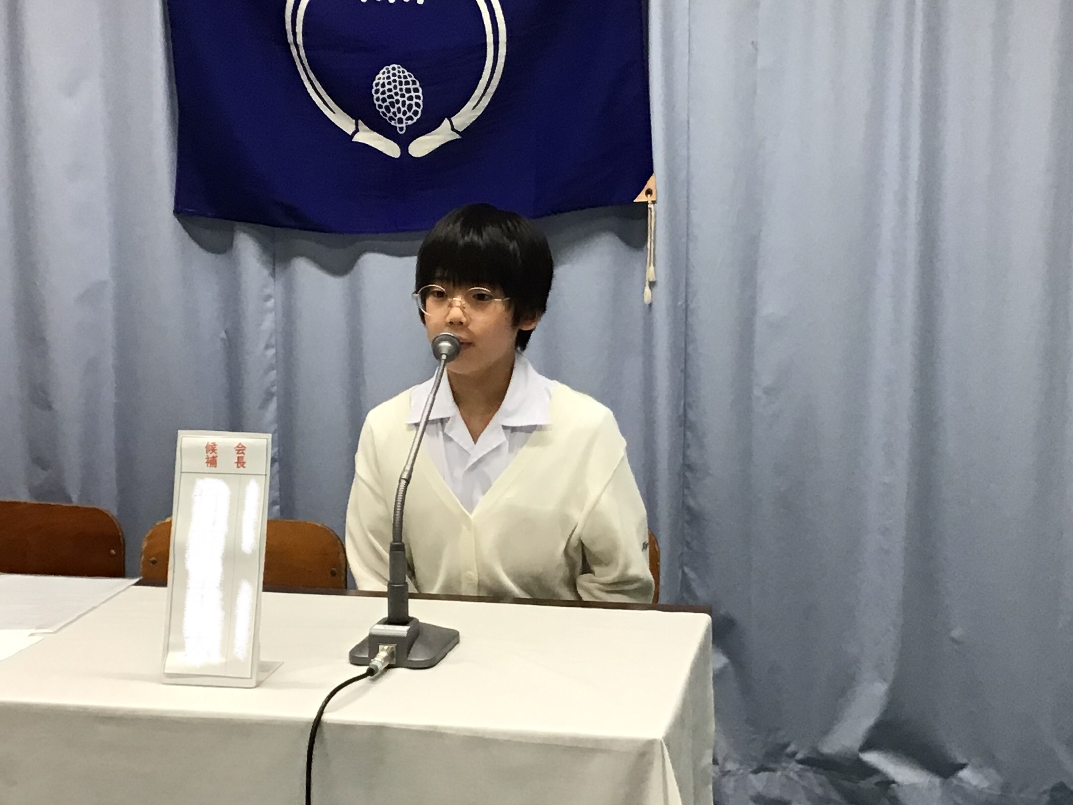各クラスからの立候補者が、それぞれの公約を掲げながら演説を行いました。自分自身が考える楽しい学校とは、また、自分が会長になりたい理由など、3人ともしっかり落ち着いて自分の思いを語っていました。