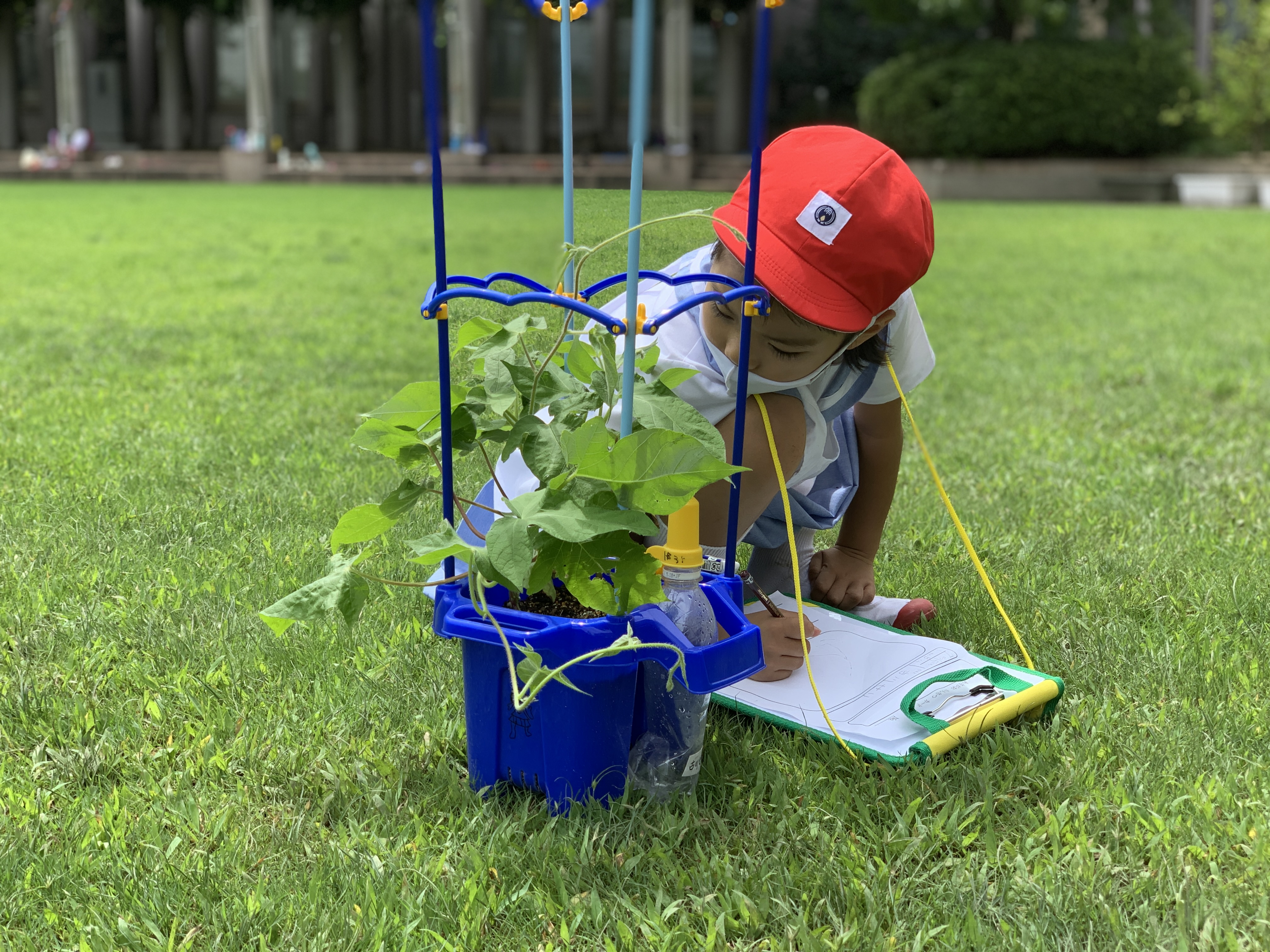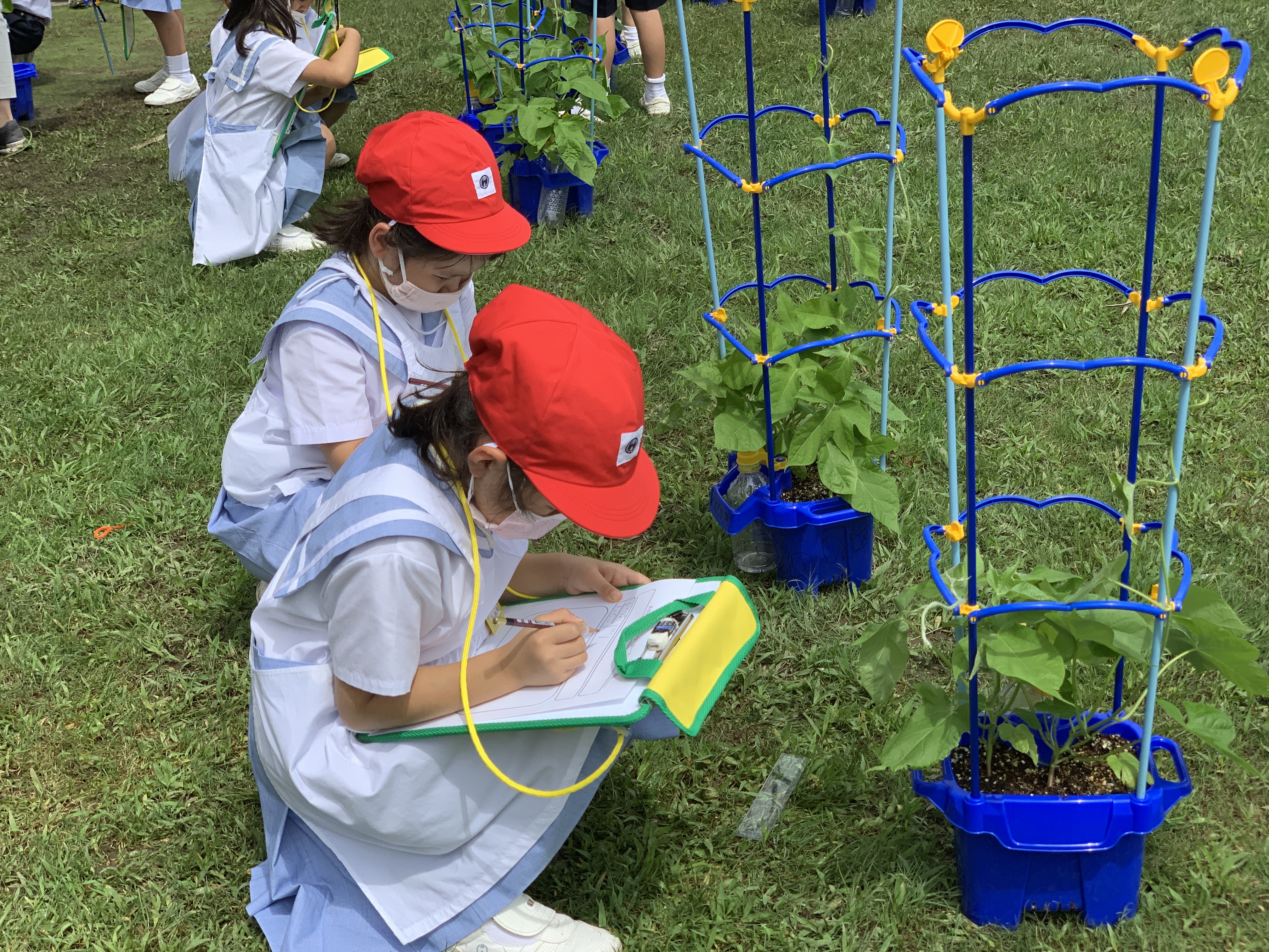午後からは、1年生が生活の授業で育ててきた朝顔の苗の観察をしていました。ぐんぐんと成長した朝顔のツルを、新しく挿した支柱に巻き付け、本葉の枚数を数えたり、形を観察しました。