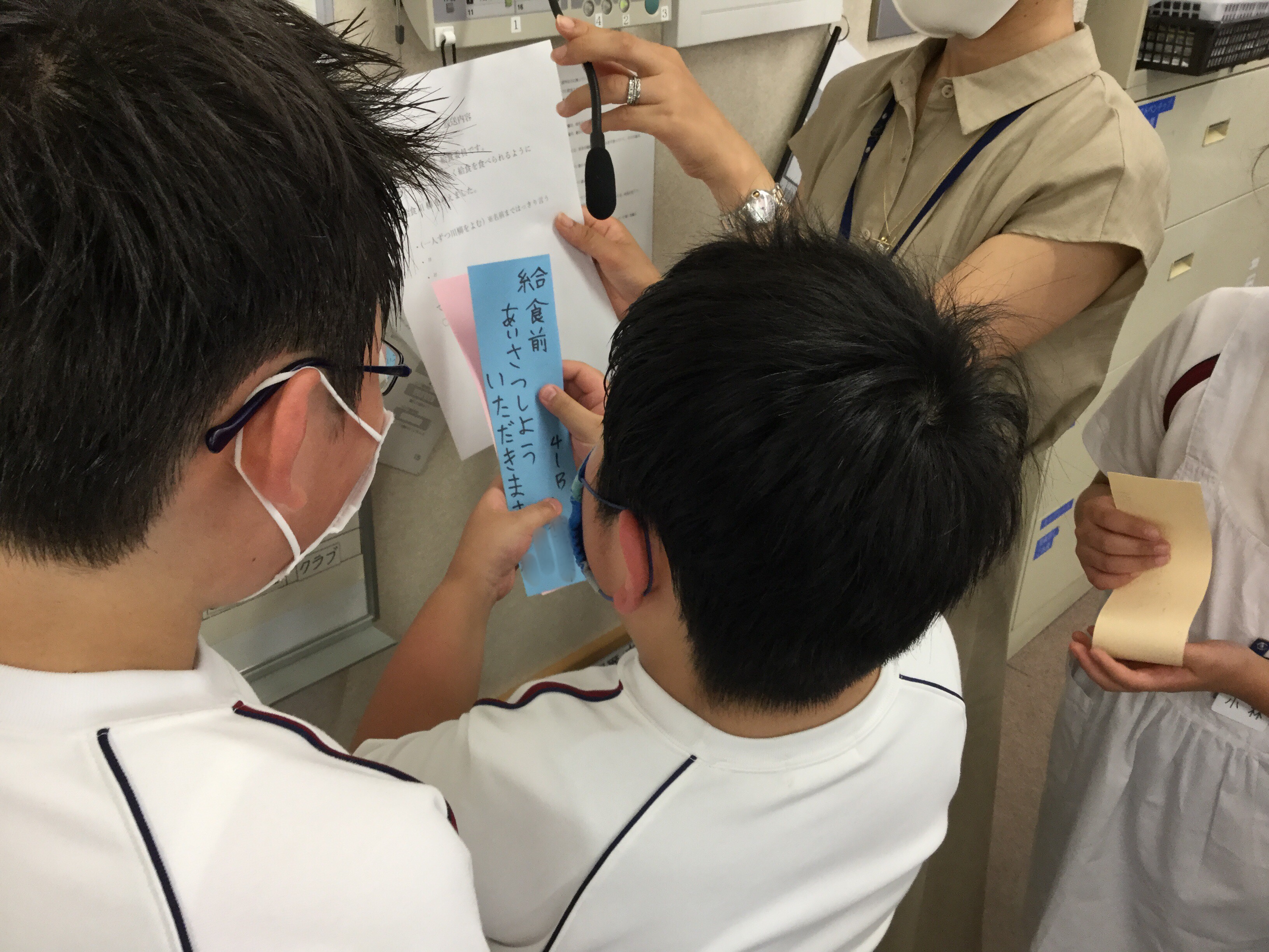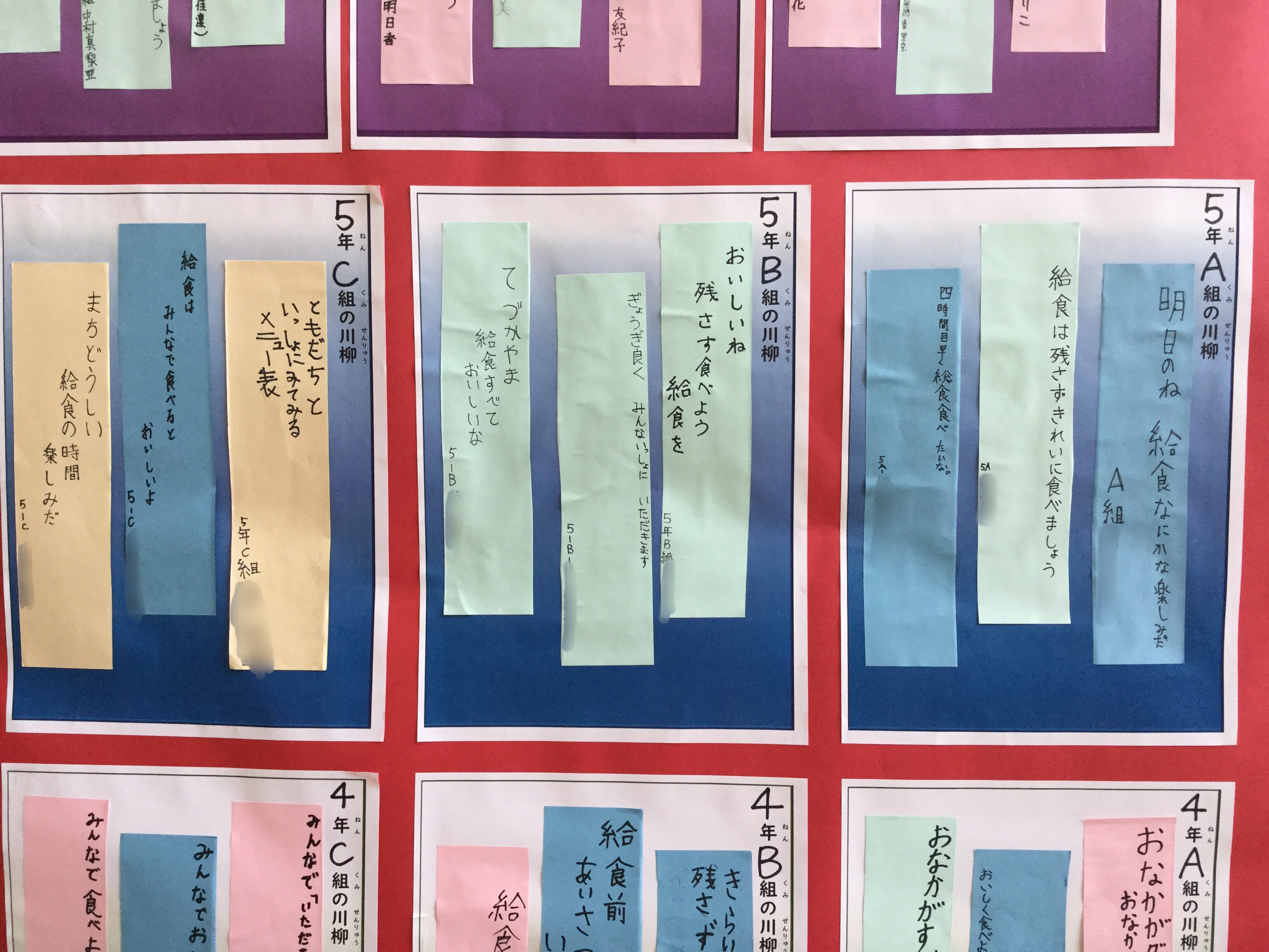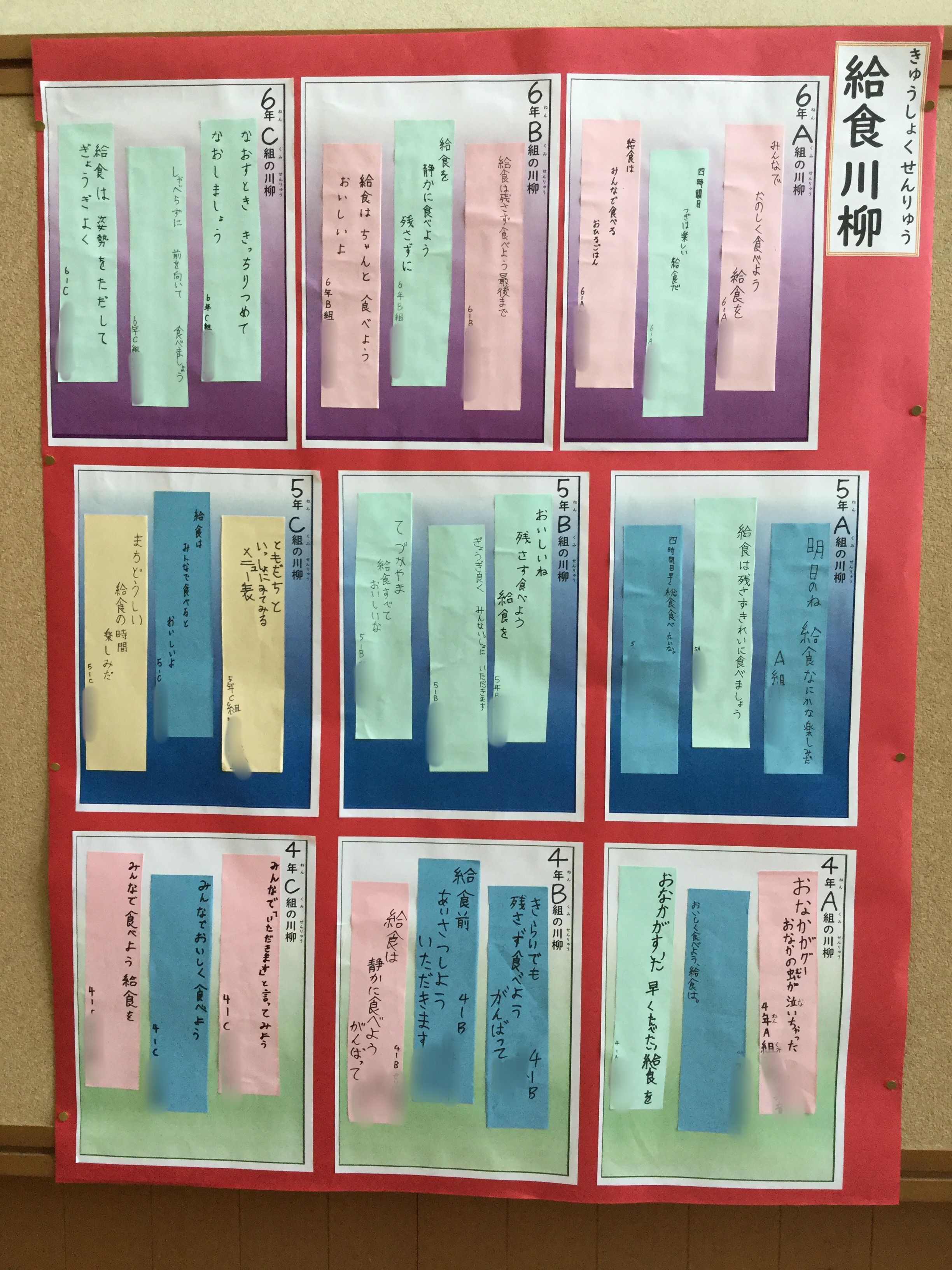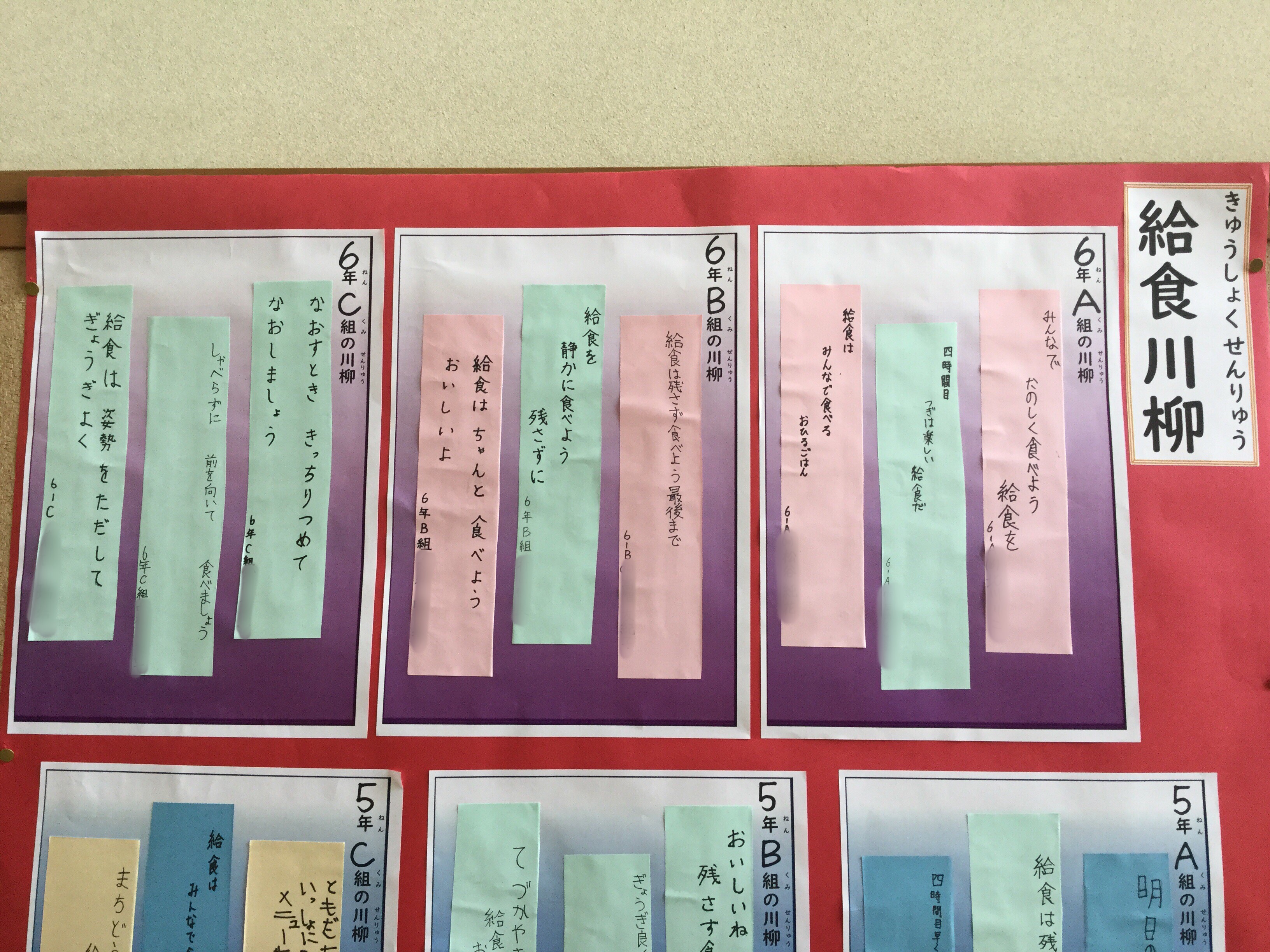 新型コロナウイルス対応で給食を喋らず前を向いて食べる中、 給食委員の児童が、みんながおいしく給食を食べられるように給食川柳を考えてくれました。