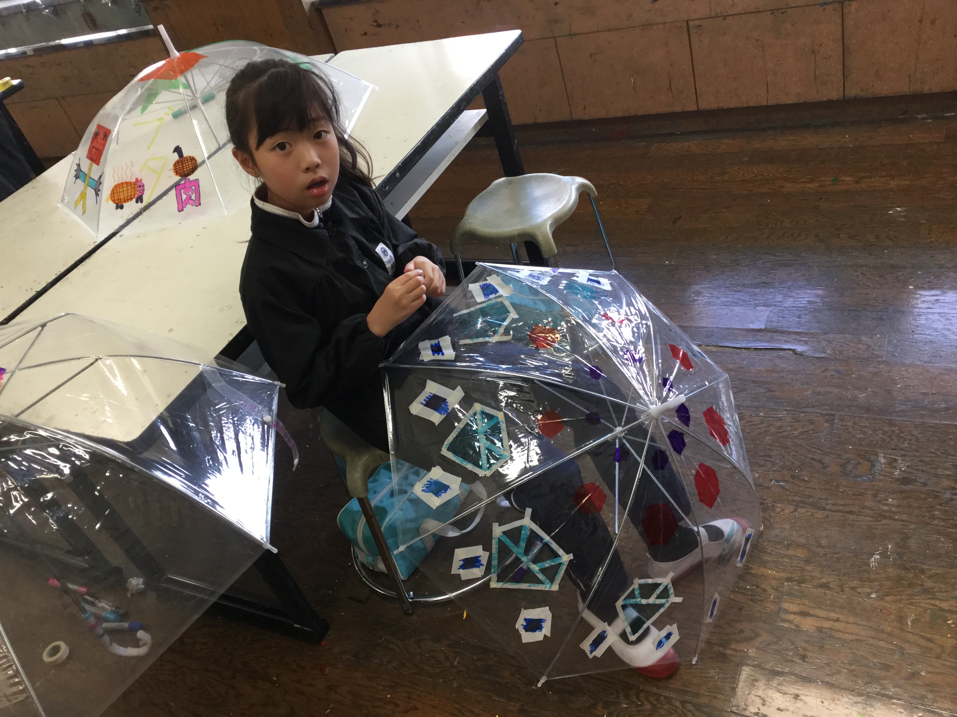 三年生の図工では、カラフルな傘を作っています。マスキングテープで縁取りをしてからカラーペンとアクリル絵具で着彩していきます。「この傘早く使いたいな!」っと児童たちはワクワクしています。早く雨降らないかな?