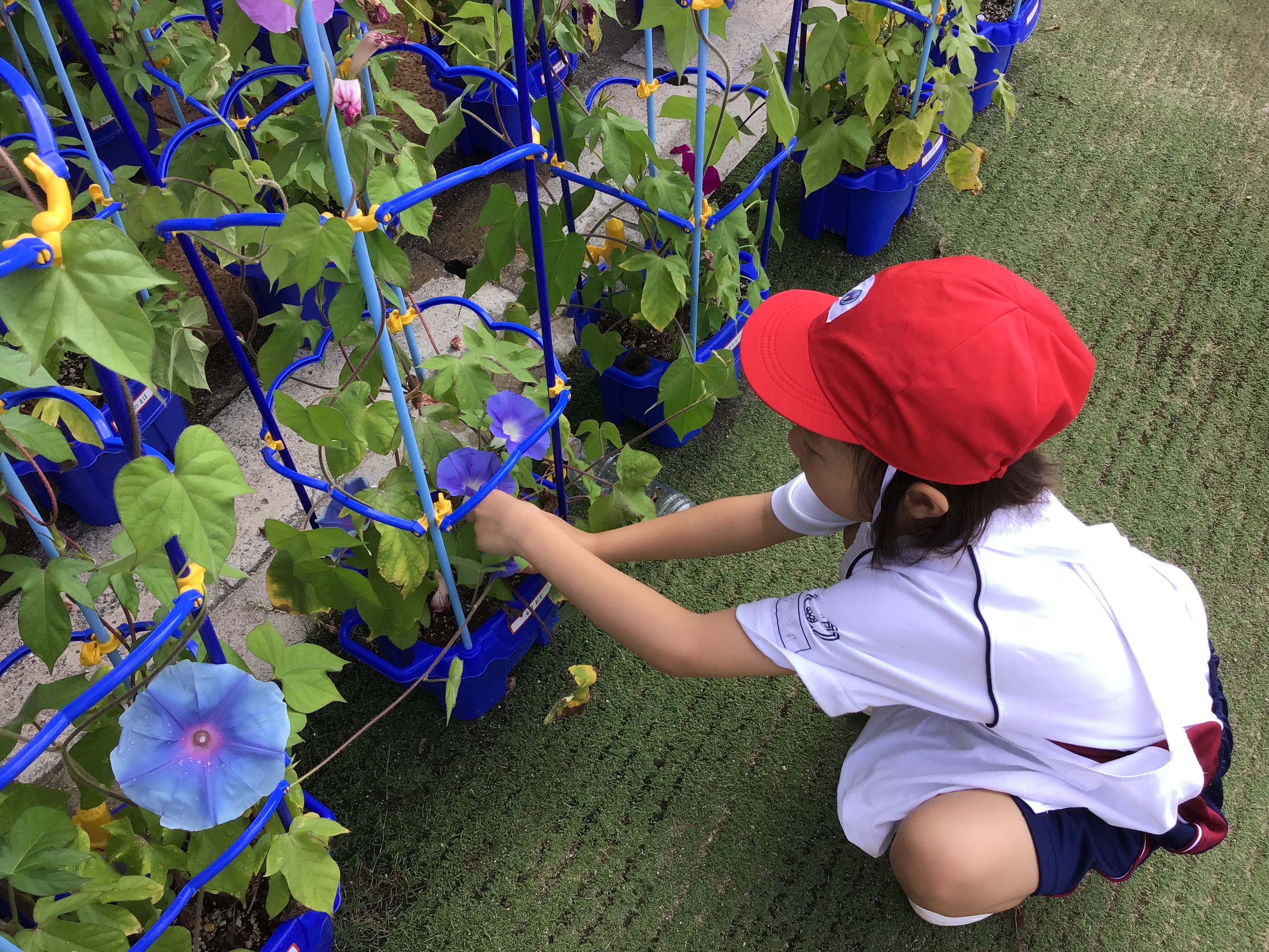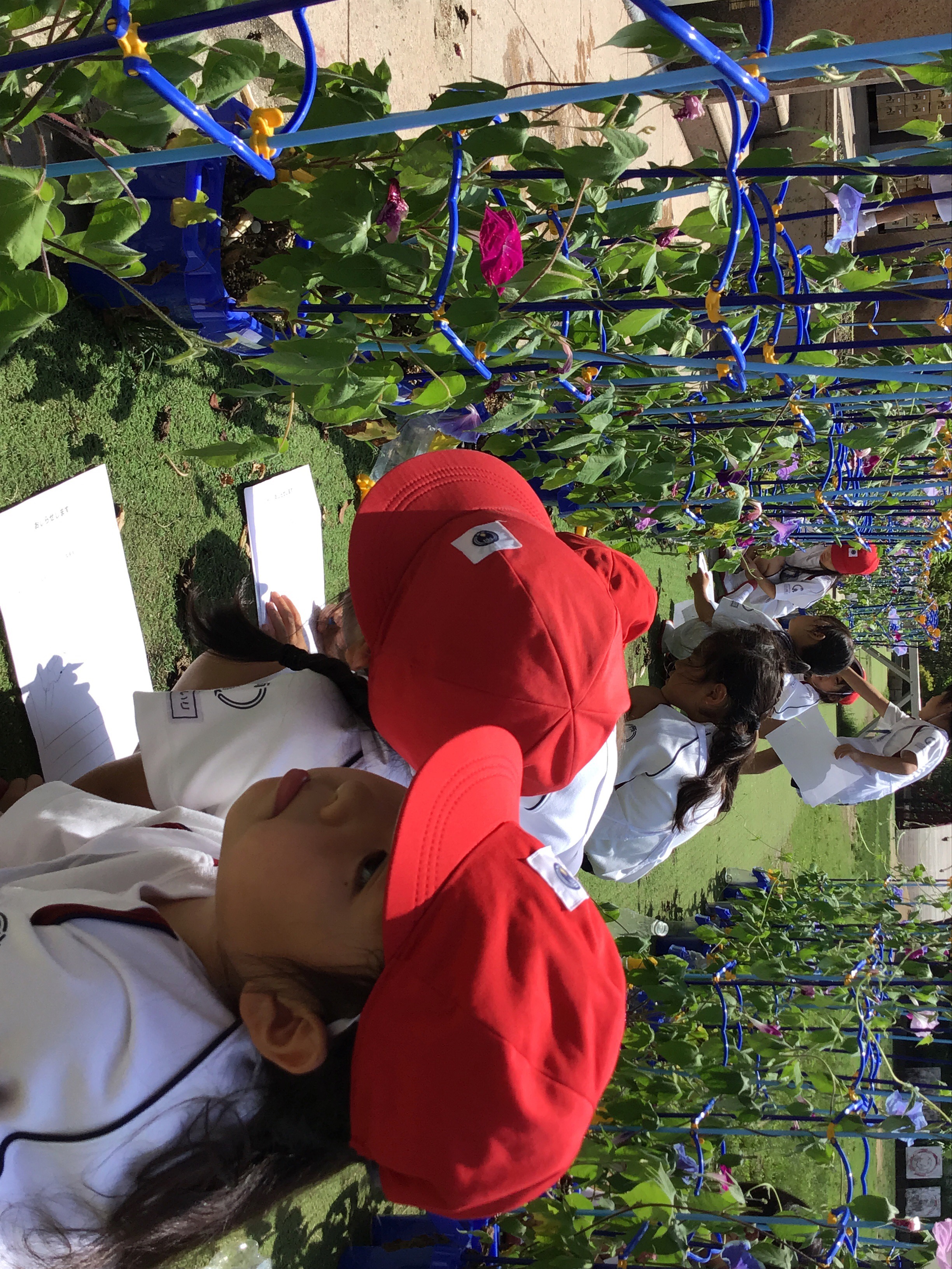 生活科の授業で行っている朝顔の観察では、日々の成長の様子を記録しています。芽から茎、蔓から花へと観察箇所は変わりますが、太陽の光を浴びぐんぐん大きくなっていく様子を見て、報告にきてくれる児童もいます。