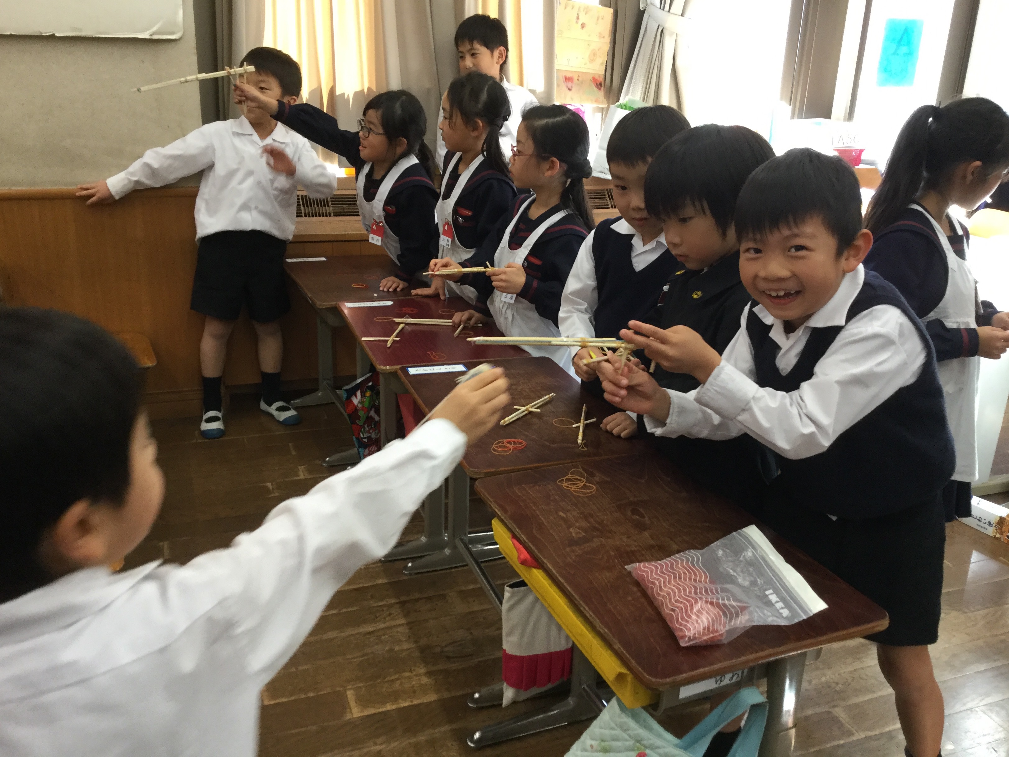 おもちゃ作り大作戦! 1年生の生活科ではグループに分かれて、おもちゃ作りを行いました。 テーマは、「作ったおもちゃで、みんなに楽しんでもらう。」でした。遊び方のルールや、景品等も手作りで、工夫していました。 今日は、1年生全体でそのおもちゃを使って、遊ぶ時間を設けました。 みんな、いきいき楽しそうに過ごしていました。